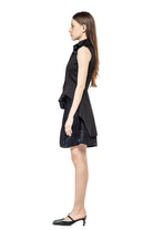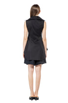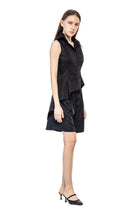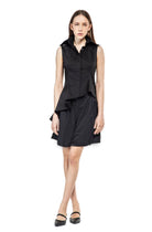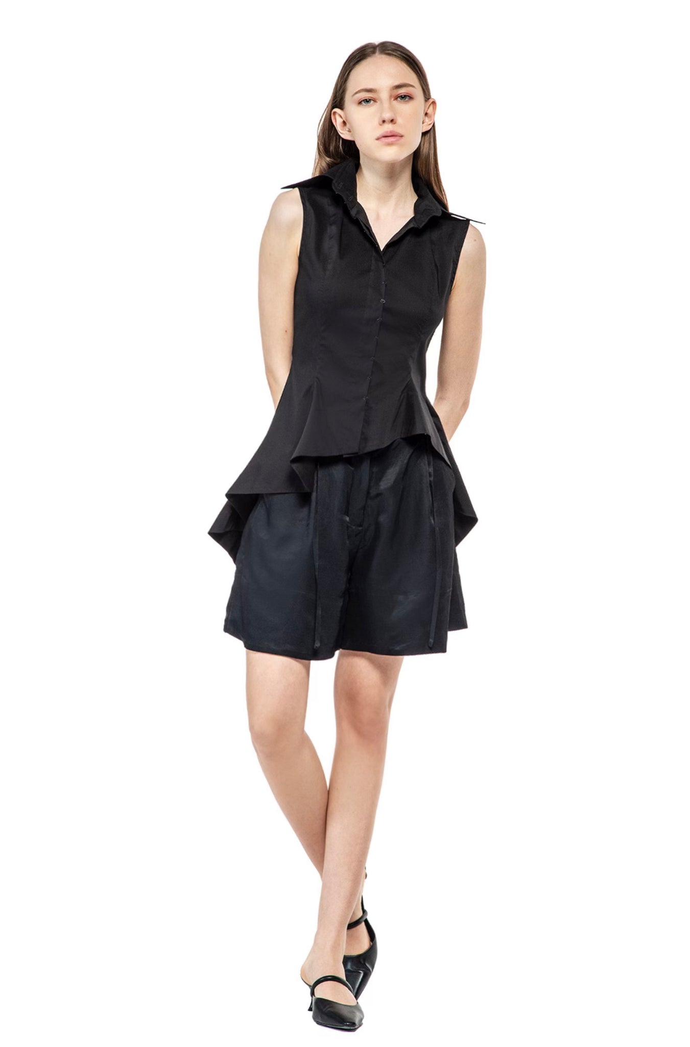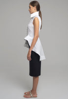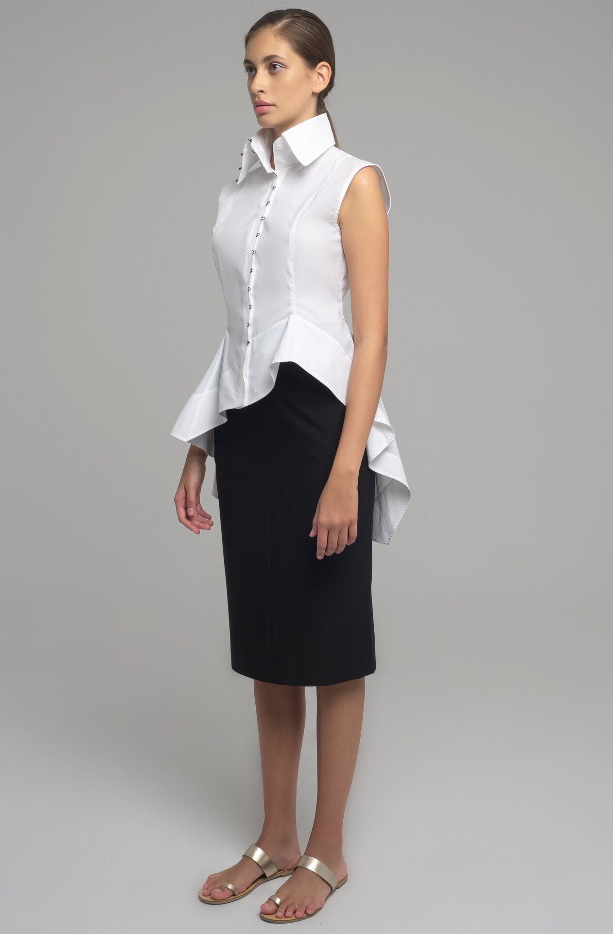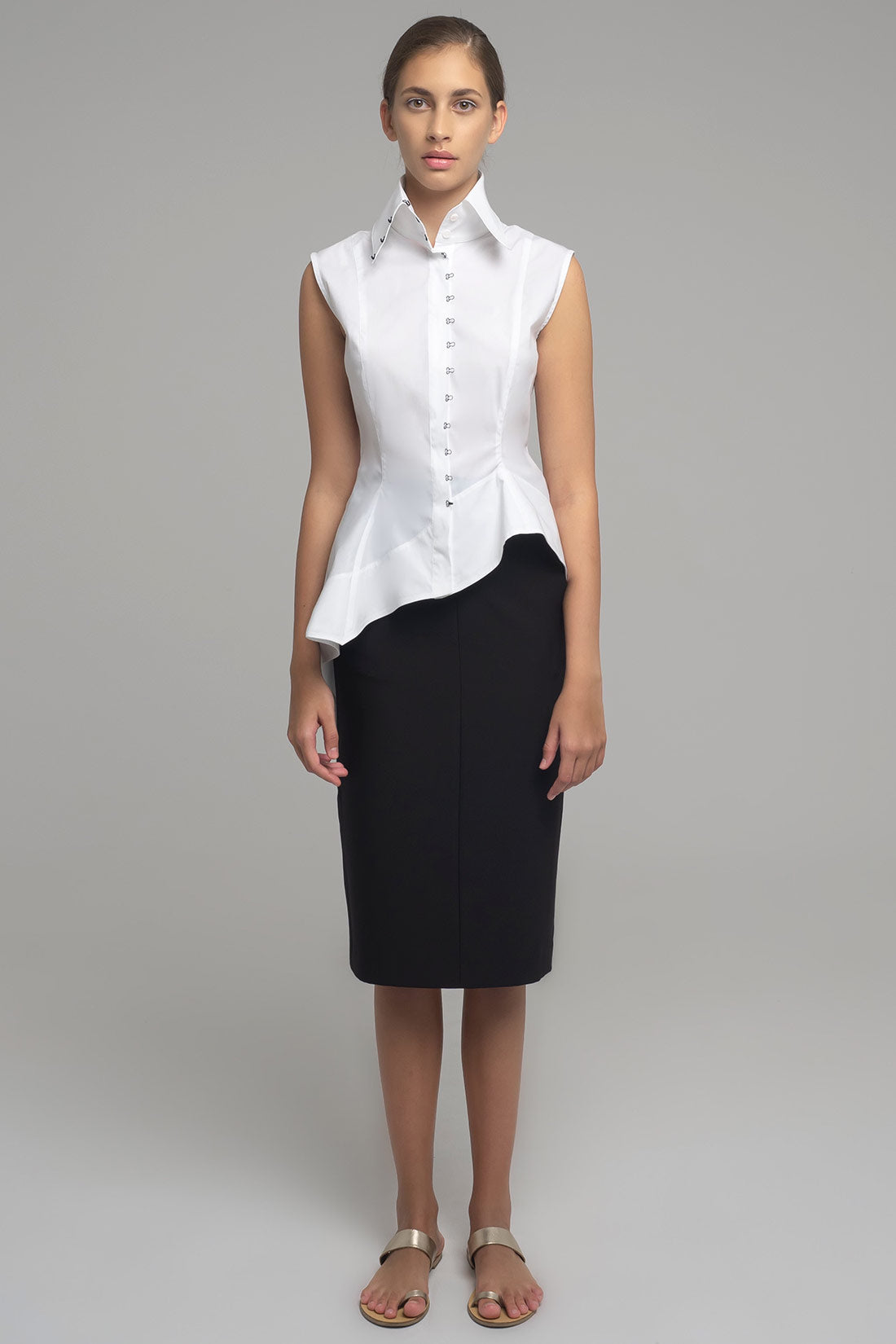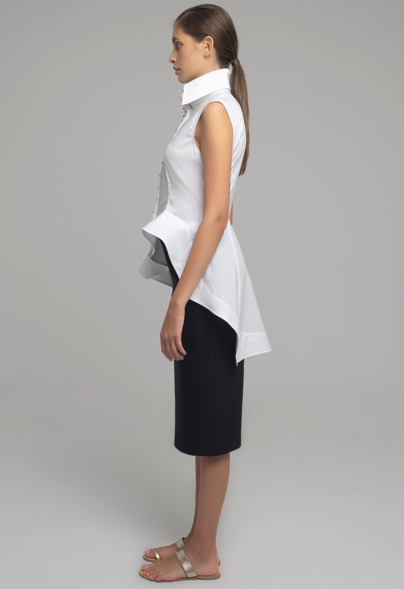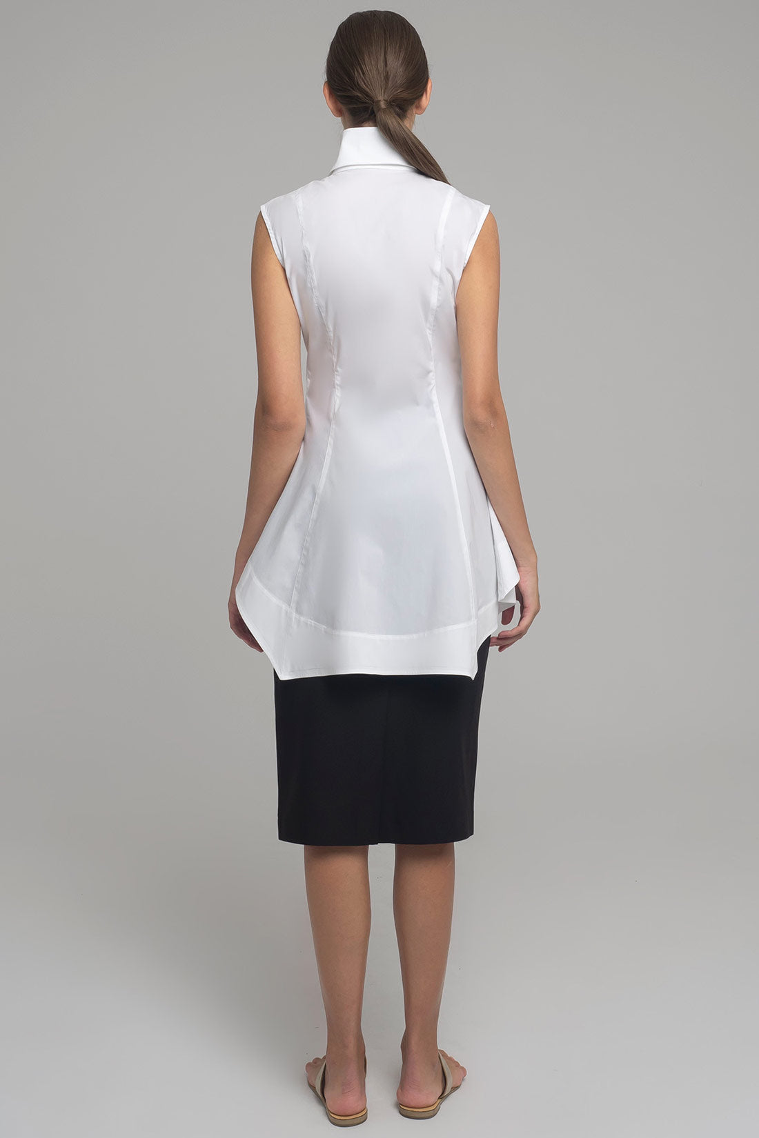 SLEEVELESS STRETCH COTTON SHIRT WITH HIGH COLLAR, MOTHER-OF-PEARL BUTTONS, DECORATIVE HOOKS. AN OPEN FLOWING CUT THAT CREATES AN ASYMMETRICAL WHEEL MOVEMENT ALONG THE CONTOURS OF THE BODY.
