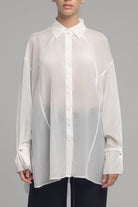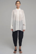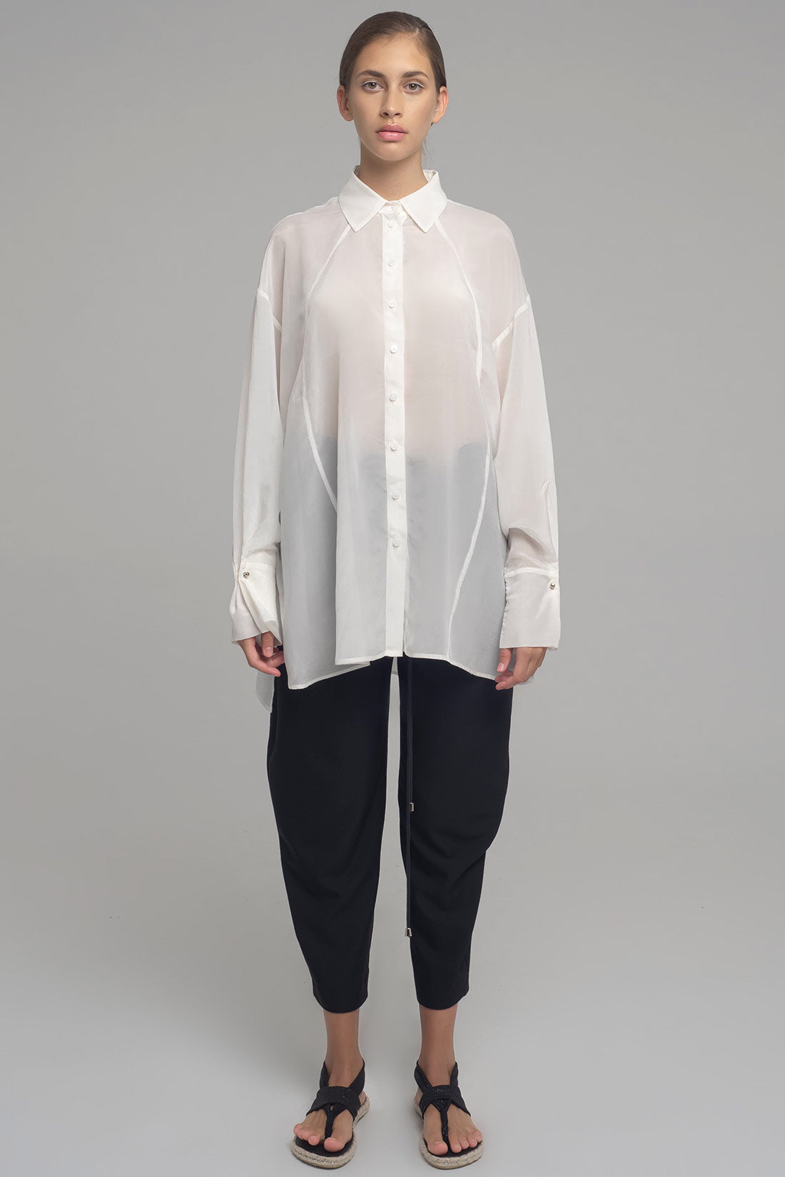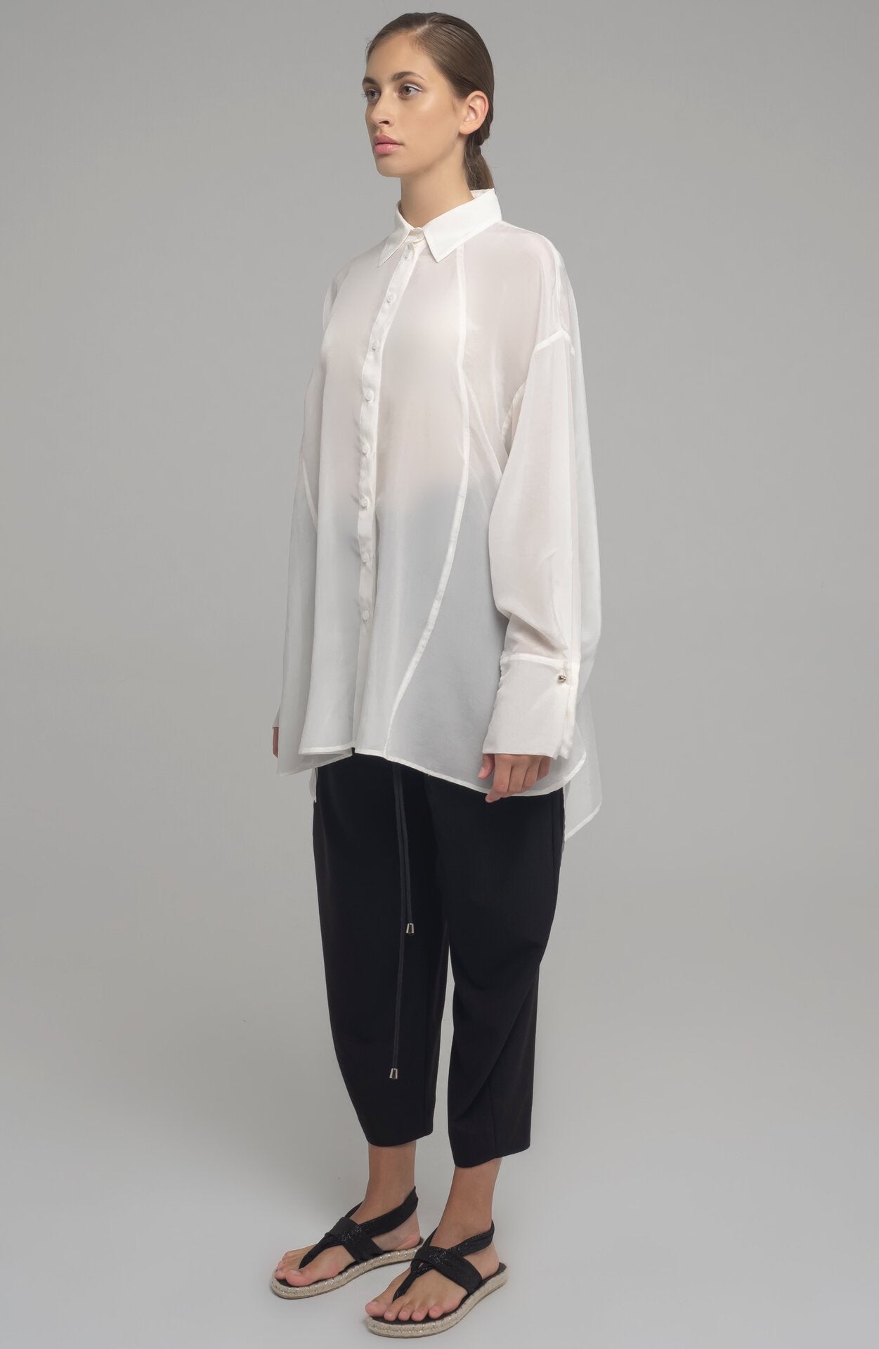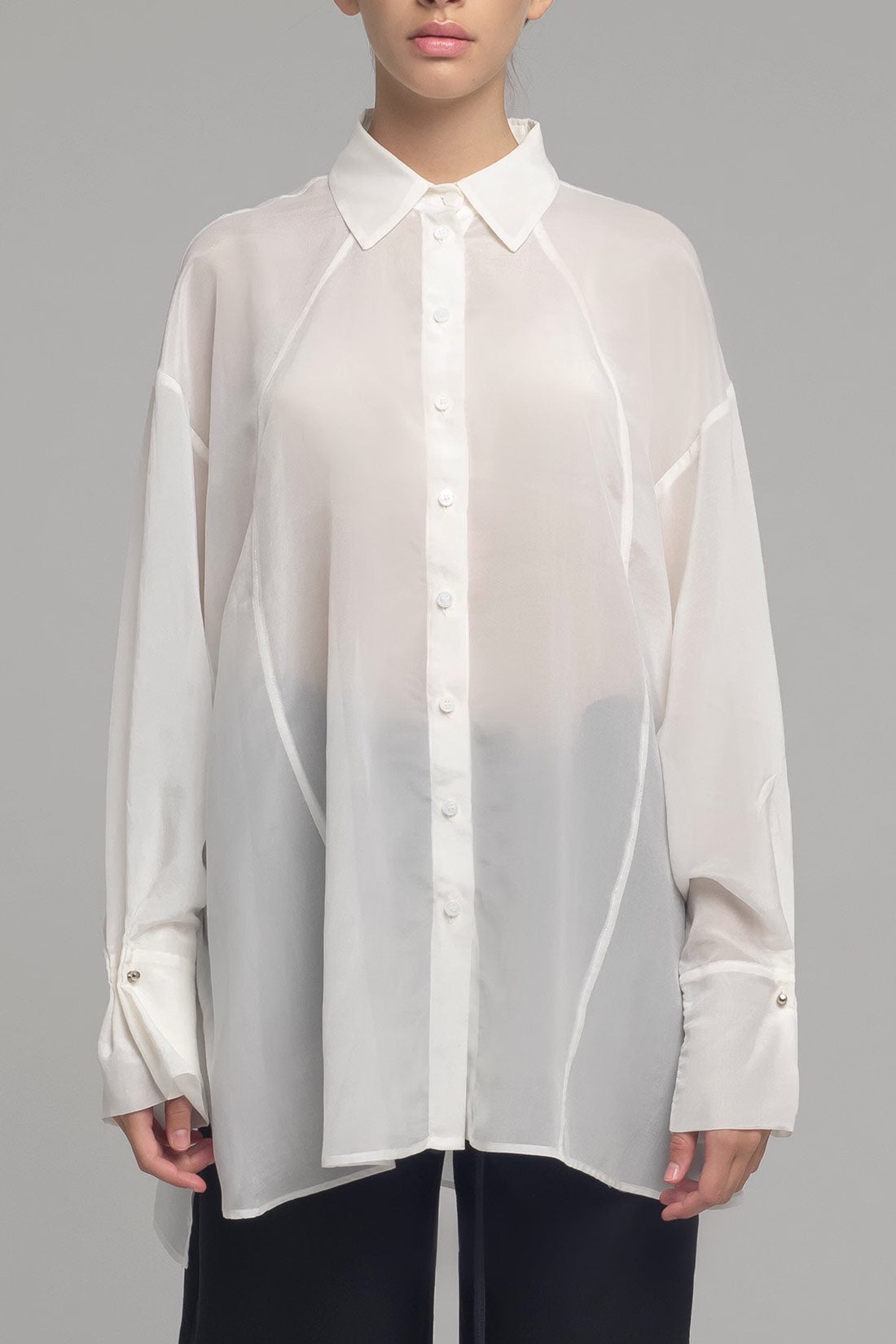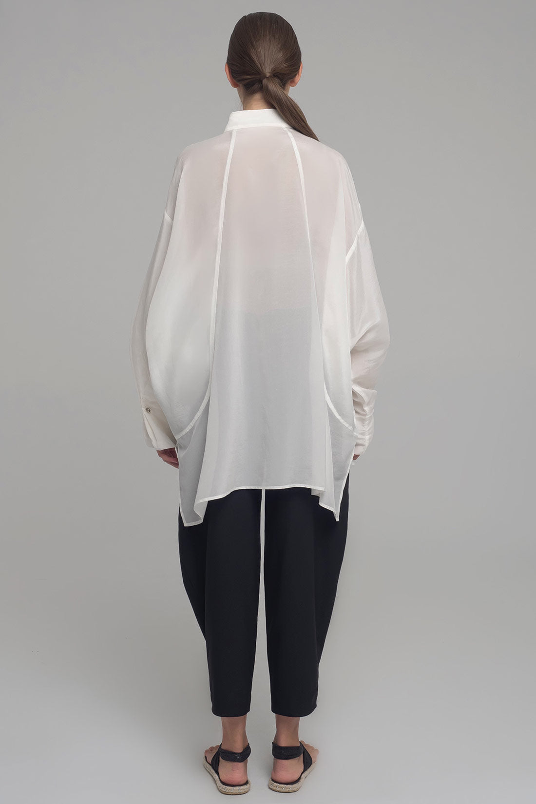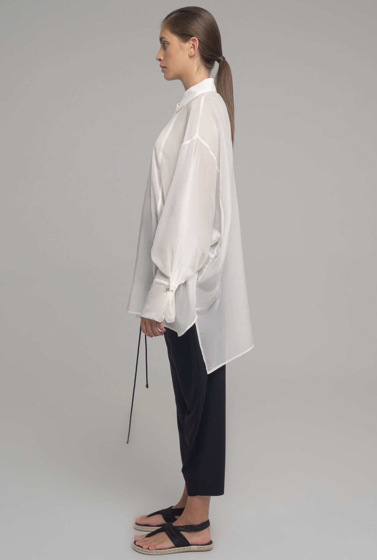Oversized kimono shirt in silk-cotton organza. The wide sleeves finish with a high cuff that closes with a metal piercing-style link. Also featuring a classic collar and mother-of-pearl buttons.