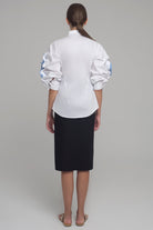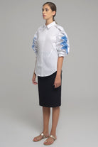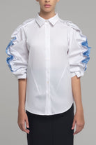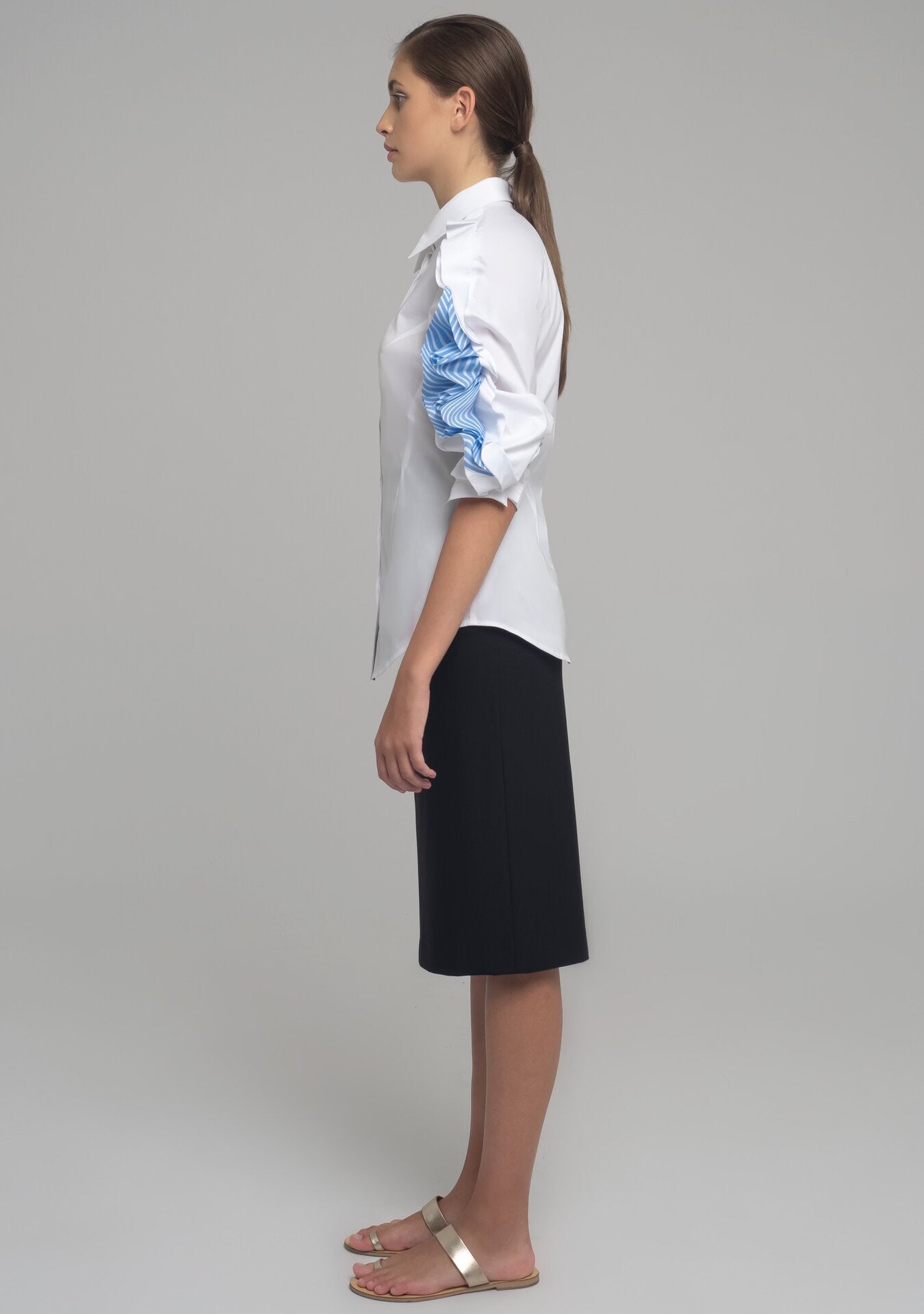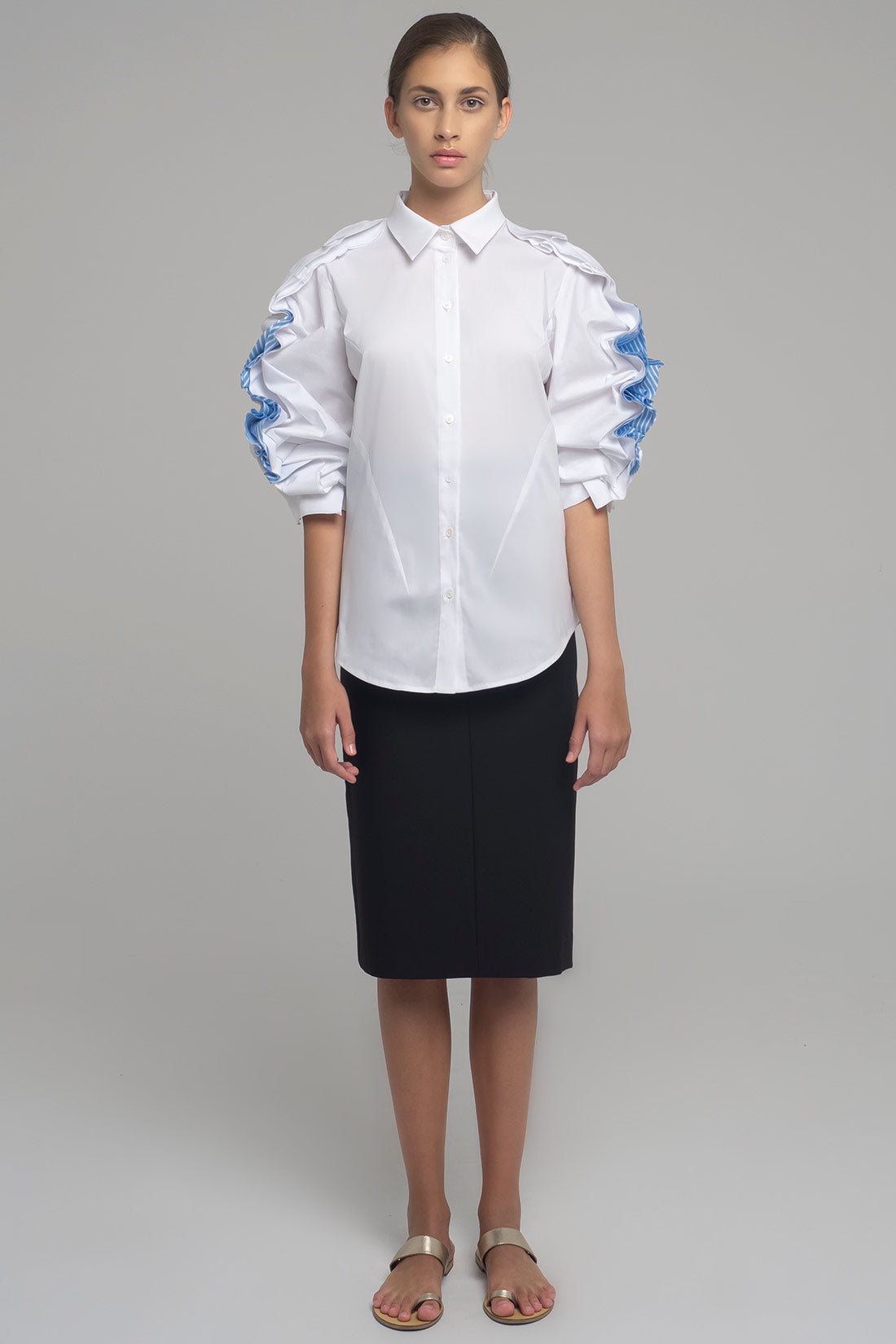 STRETCH COTTON SHIRT WITH CLASSIC COLLAR AND MOTHER-OF-PEARL BUTTONS. THE LONG SLEEVES HAVE A GATHERED CURL OF CONTRASTING FABRIC FROM SHOULDER TO CUFF. AN INTERIOR RIBBON ALLOWS THE SLEEVE TO BE CURLED AND ADJUSTED TO DIFFERENT LENGHTS.