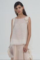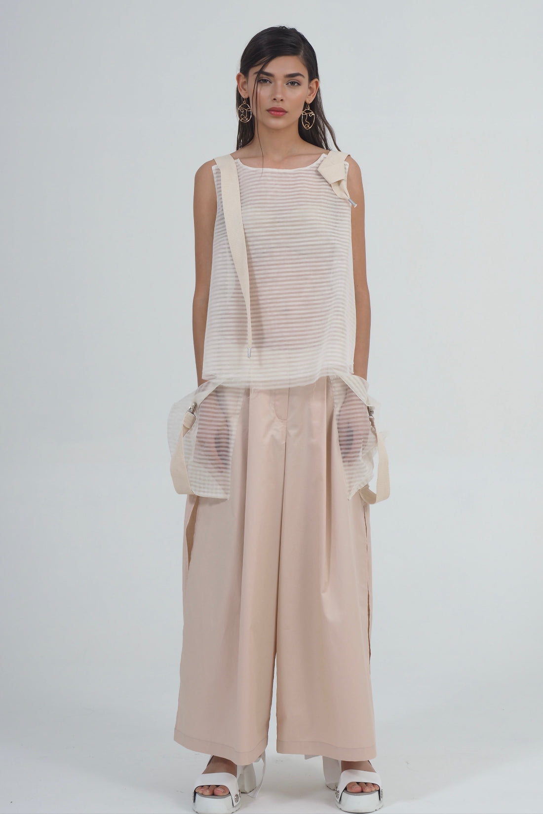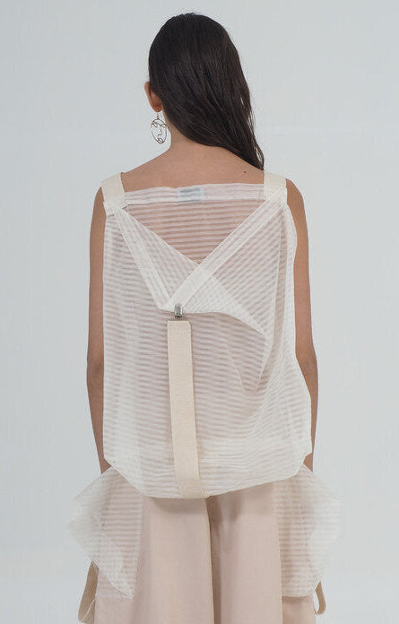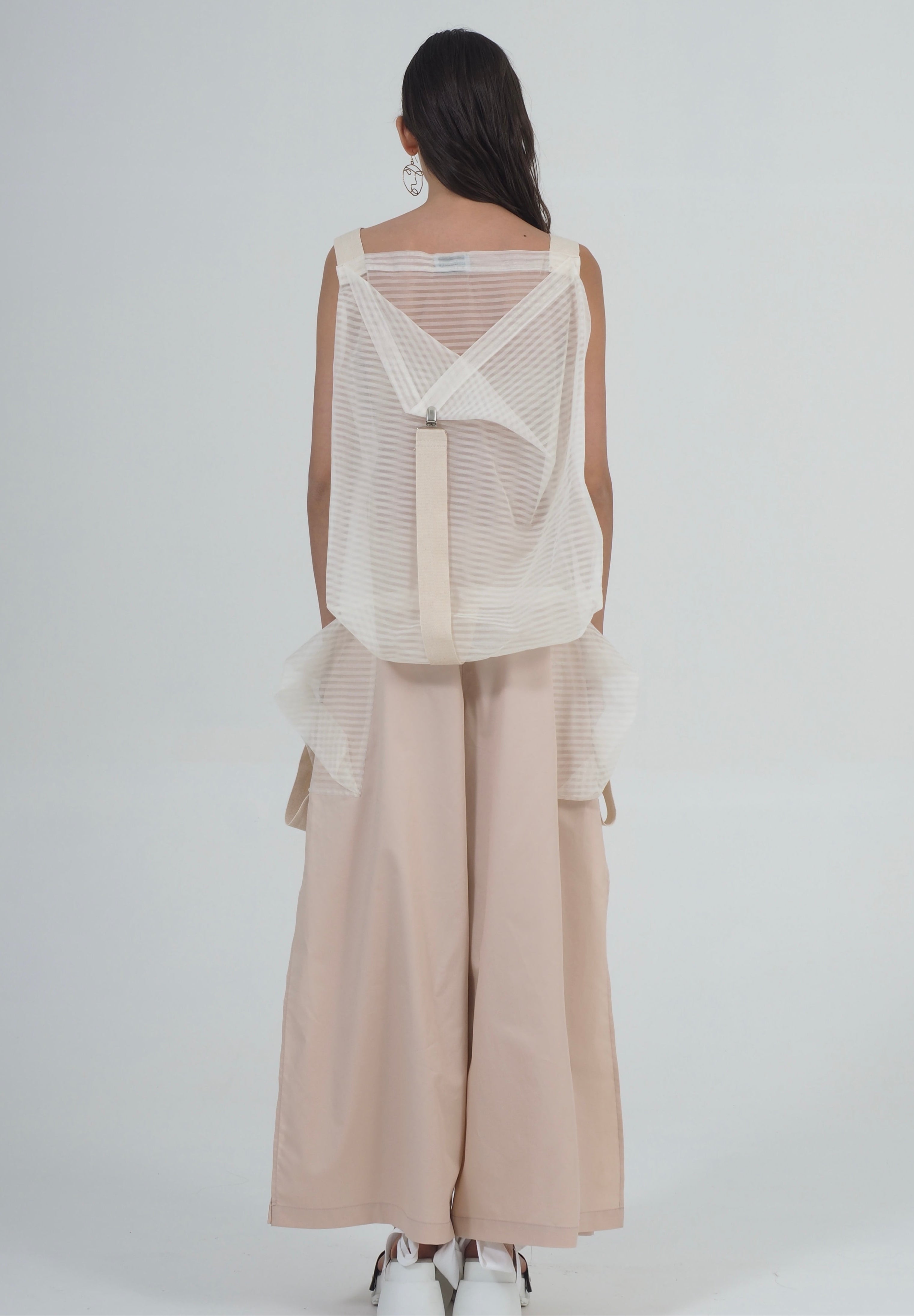 SLEEVELESS TOP WITH A DOUBLE LAYER OF SILK/COTTON ORGANZA AND MAXI POCKET AT THE REAR. THE METAL ENDS ON THE COTTON RIBBON BRACES FEATURE A PERSONALIZED LOGO DETAIL.