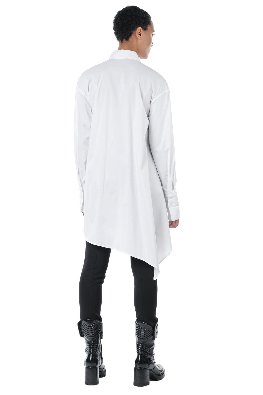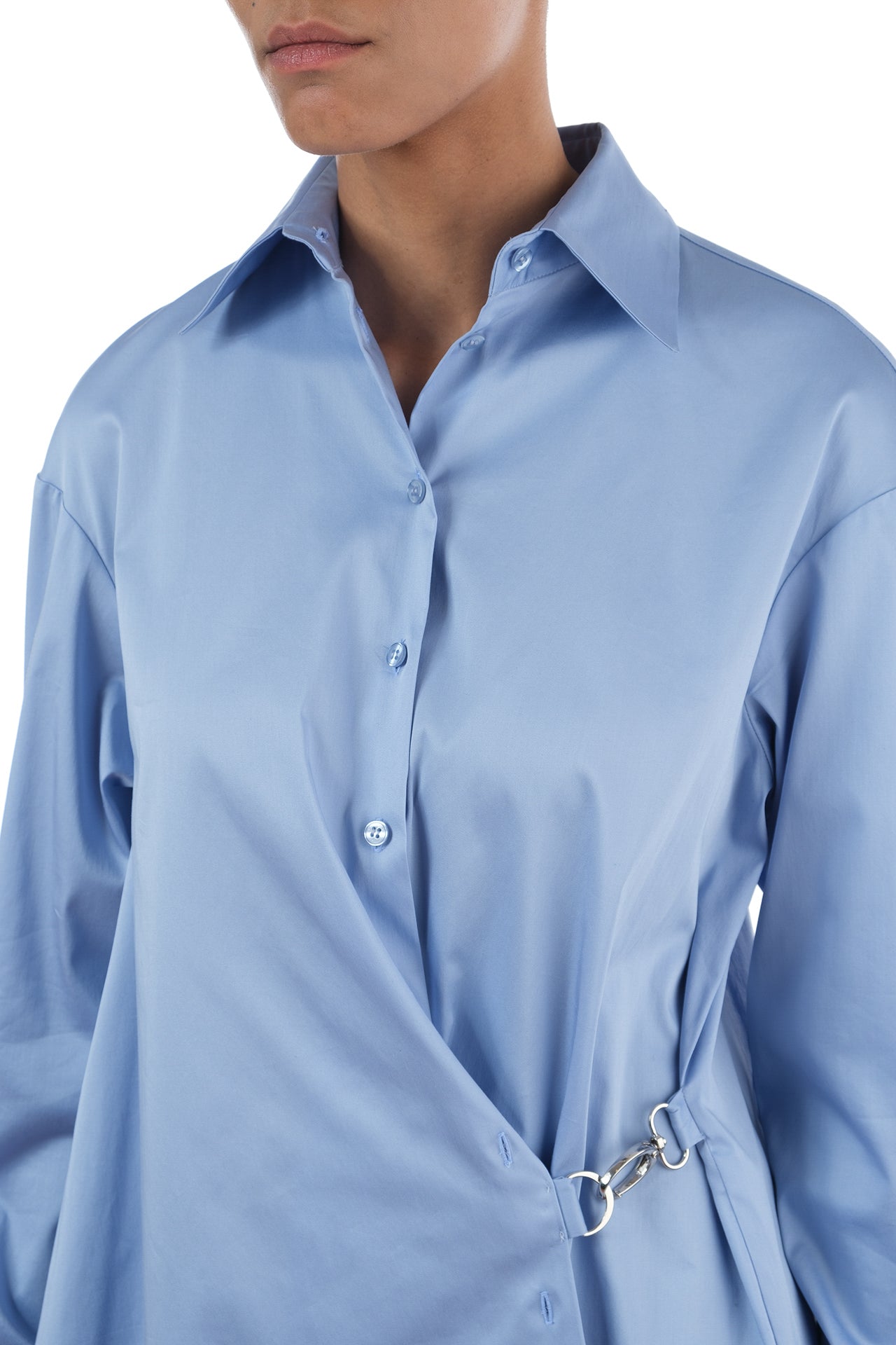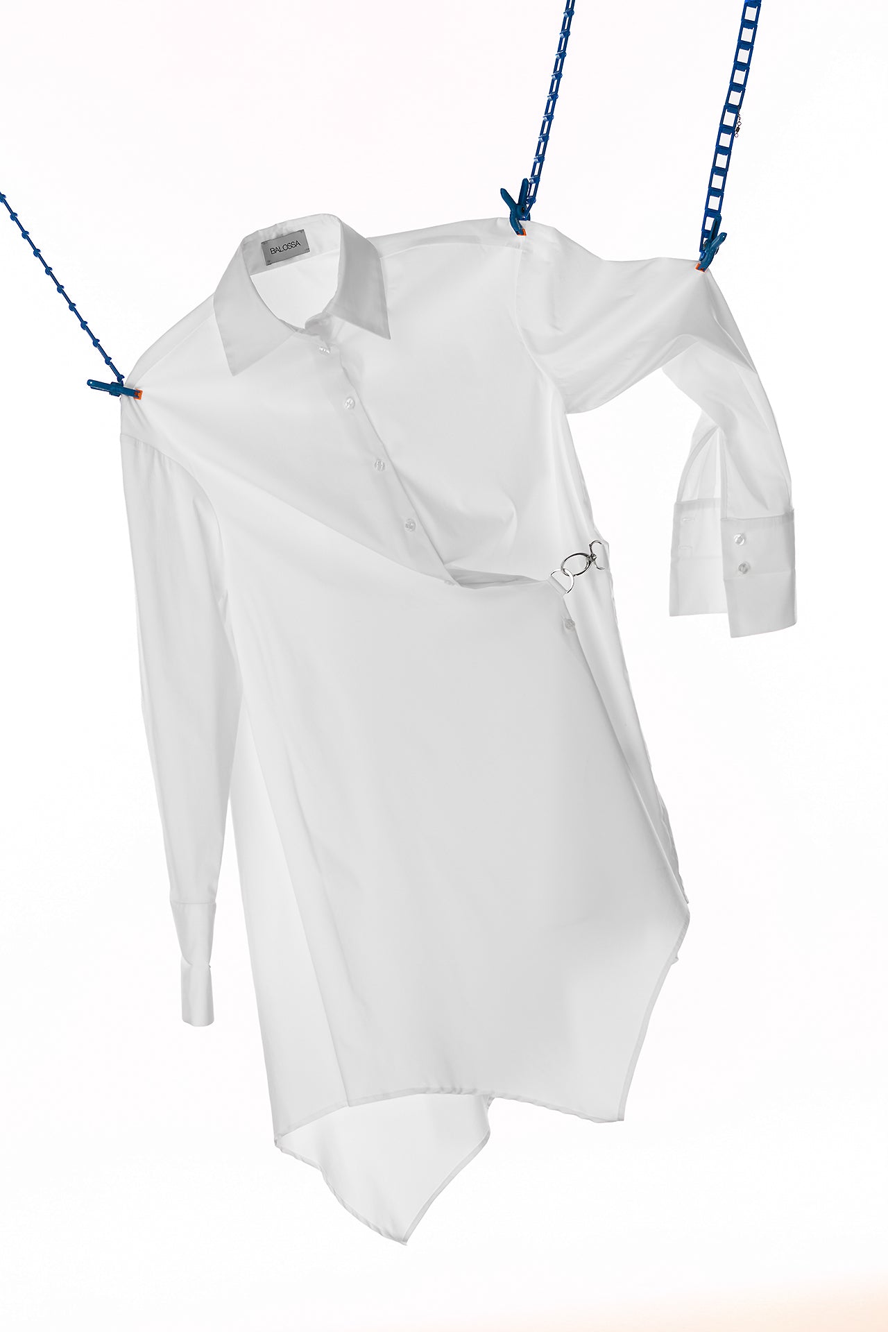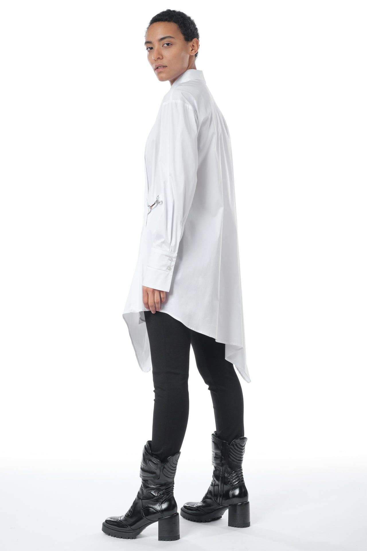 LONG SLEEVED STRETCH COTTON POPLIN SHIRT WITH A TOUCH OF SILK. THE LAST BUTTON BECOMES A METAL HOOK, CREATING AN ASYMMETRICAL EFFECT THAT FINISHES WITH AN ELEGANT POINT AT THE BACK. CLASSIC COLLAR.