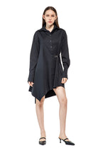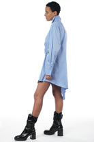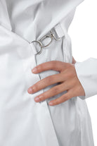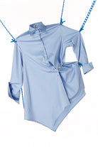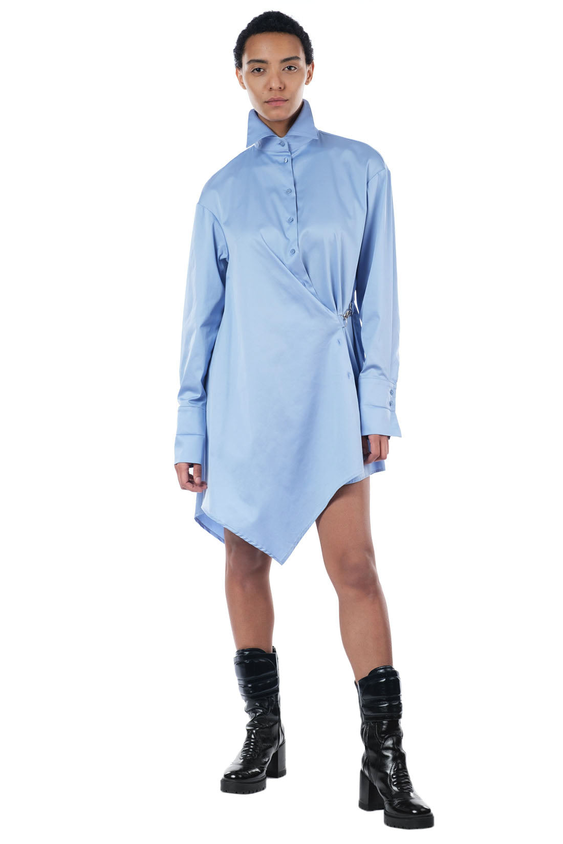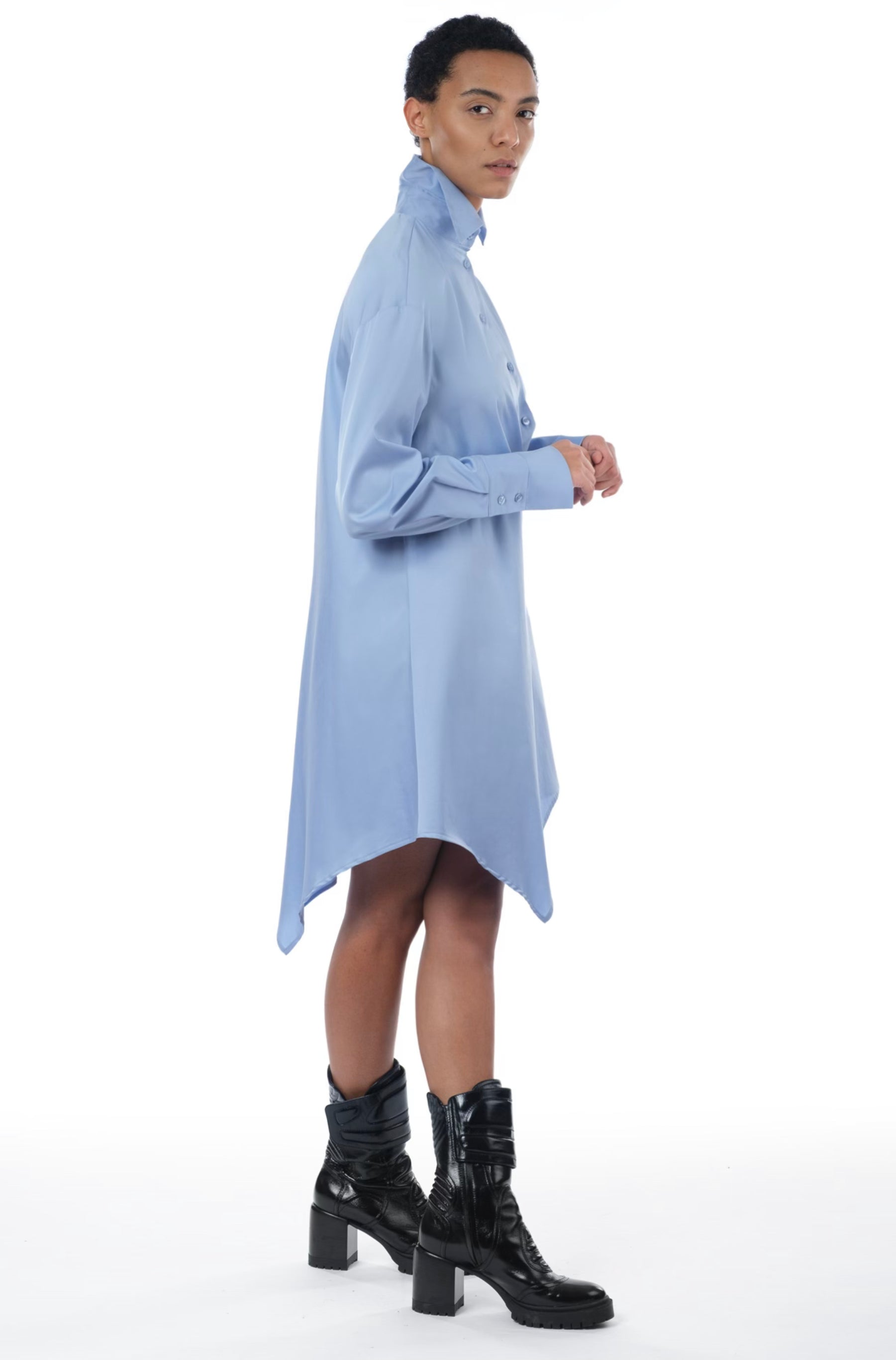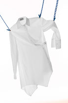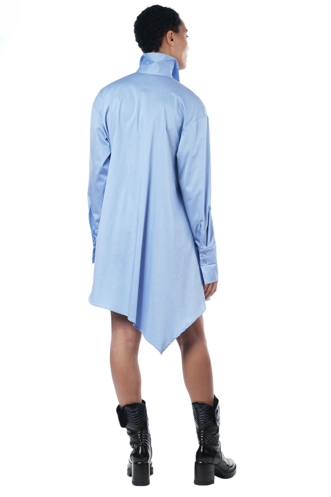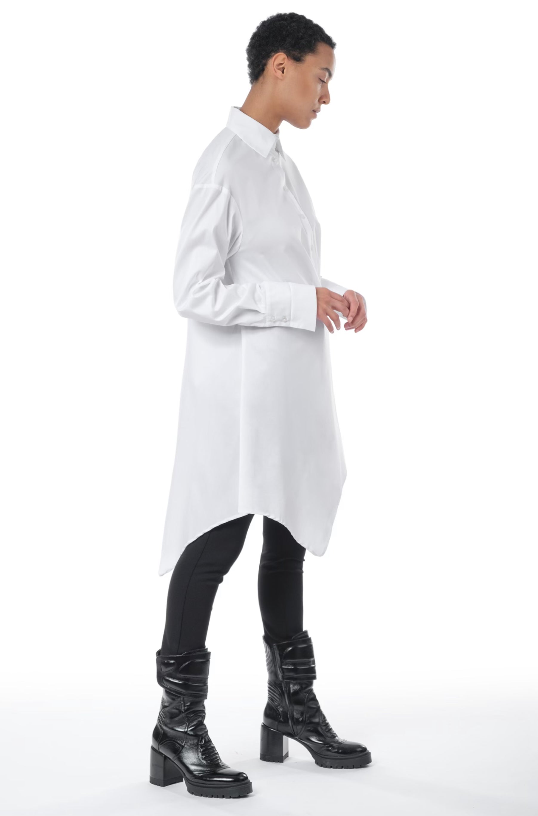 LONG SLEEVED STRETCH COTTON POPLIN SHIRT WITH A TOUCH OF SILK. THE LAST BUTTON BECOMES A METAL HOOK, CREATING AN ASYMMETRICAL EFFECT THAT FINISHES WITH AN ELEGANT POINT AT THE BACK. CLASSIC COLLAR.