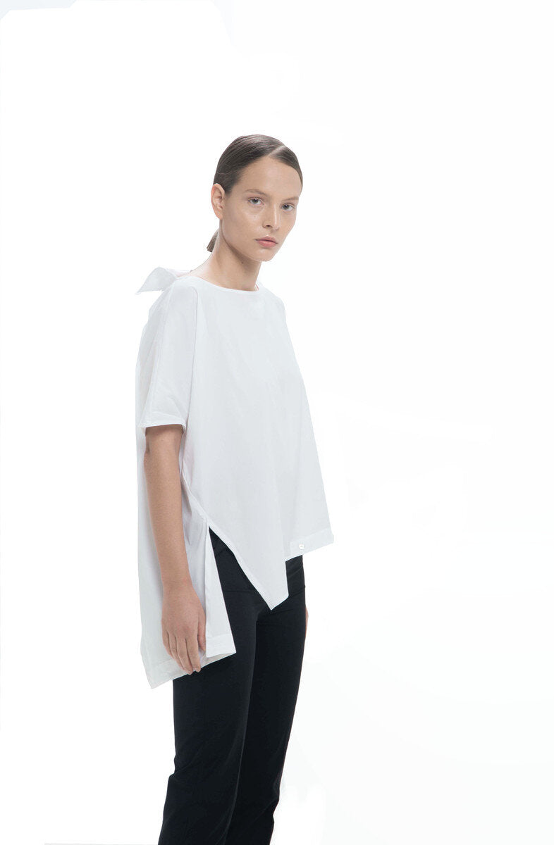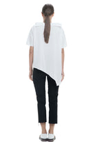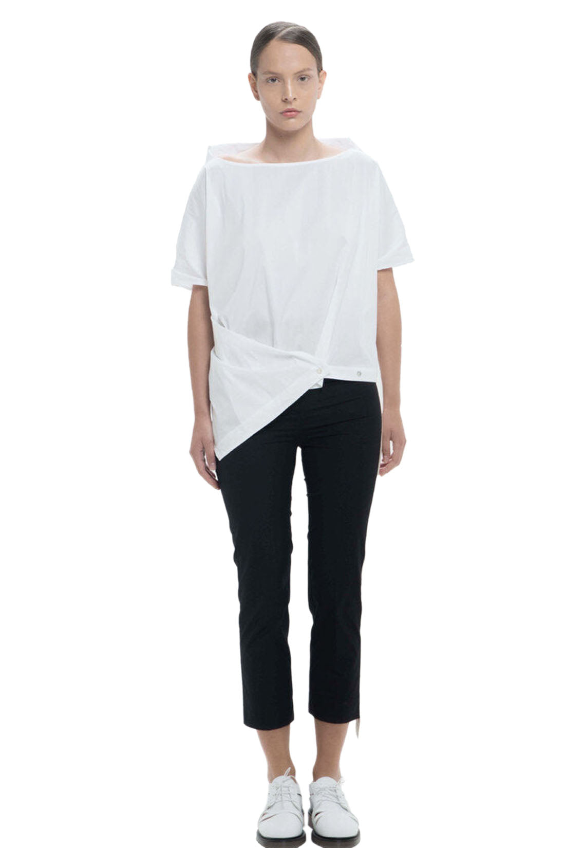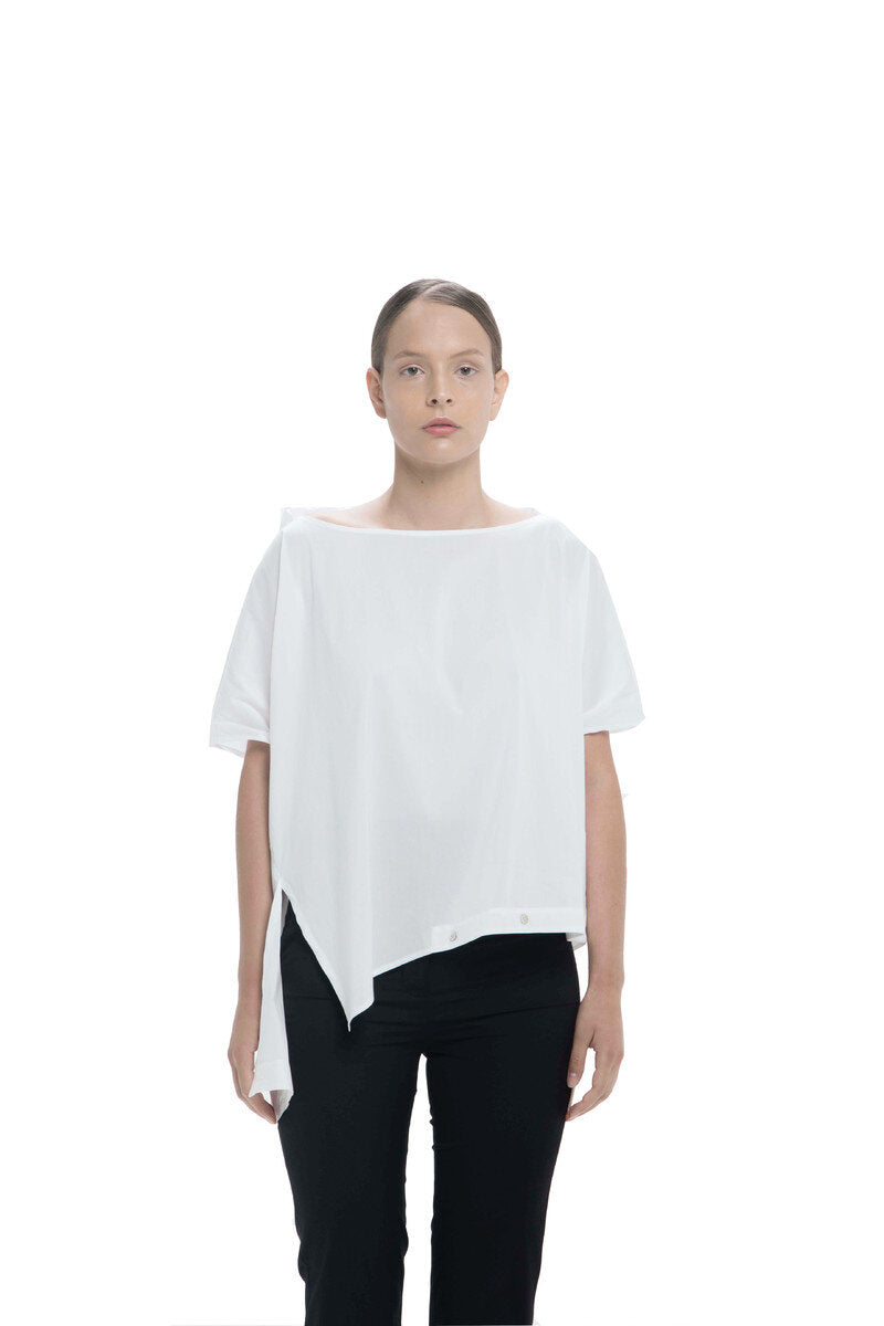 ASYMMETRICAL DECONSTRUCTED COTTON TOP TAILORED WITH IMAGINATIVE DETAILS SUCH AS DEVIATION OF THE LOWER BUTTONING, WIDE COLLAR AND SHORT SLEEVES.