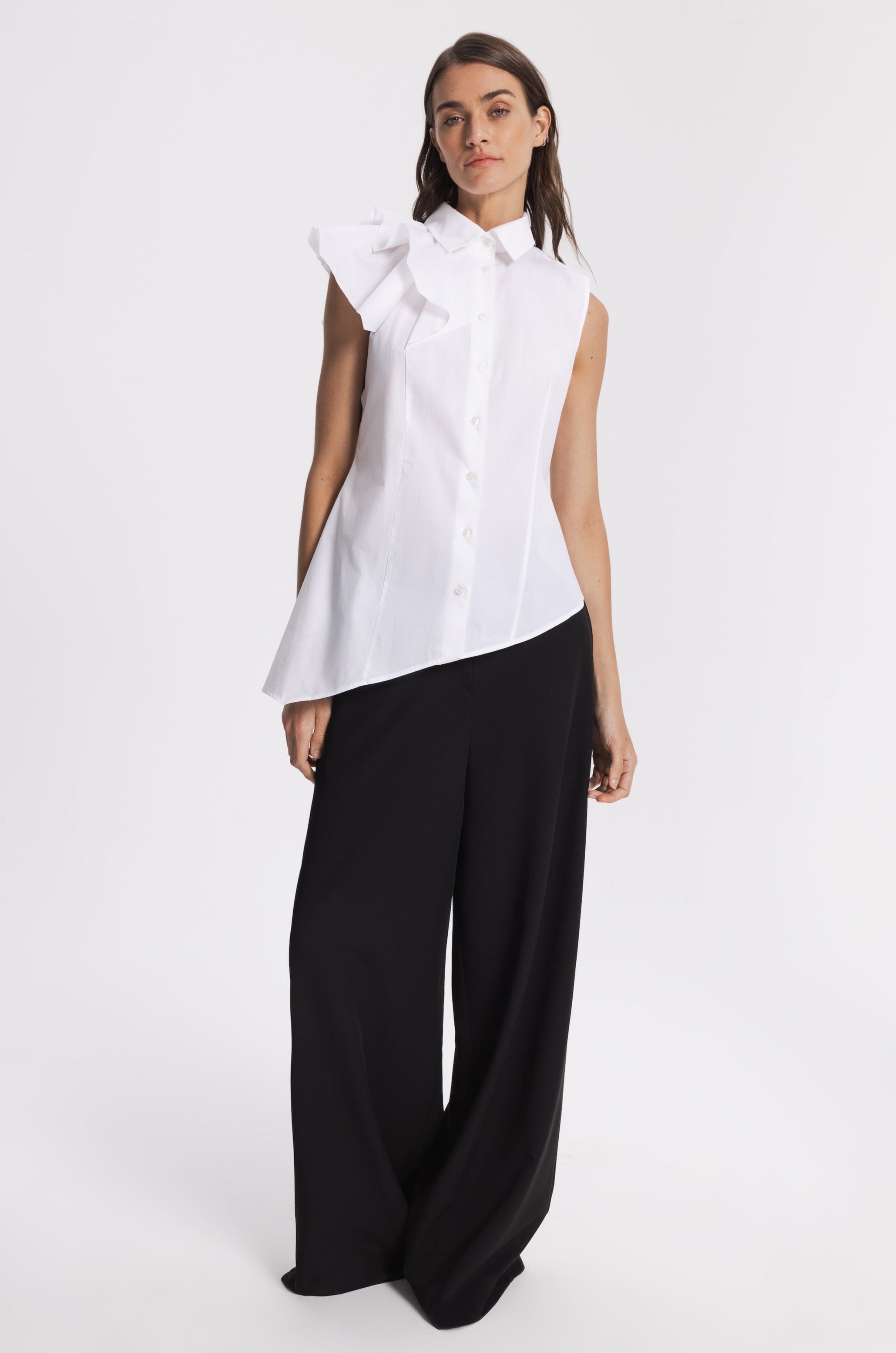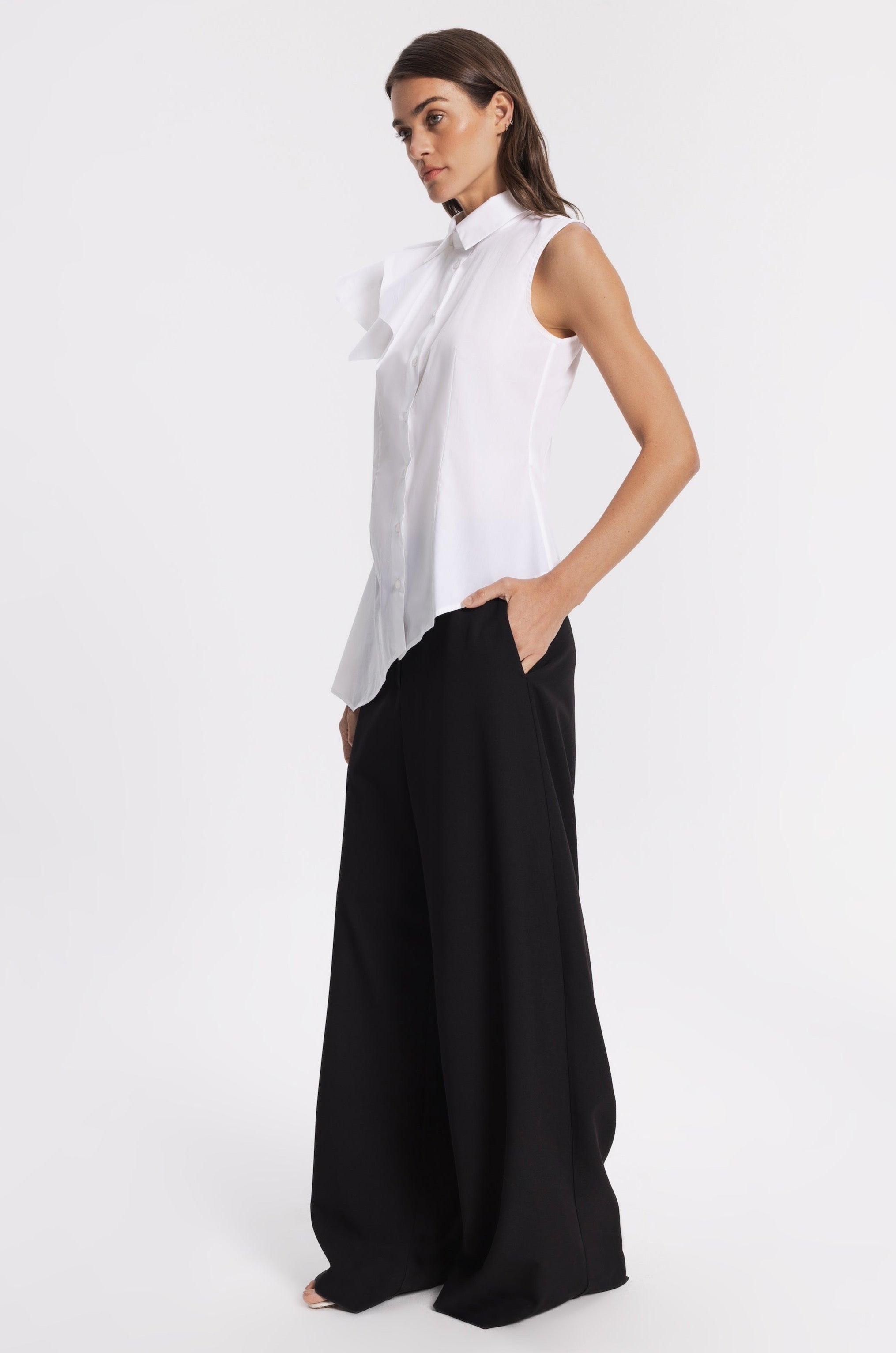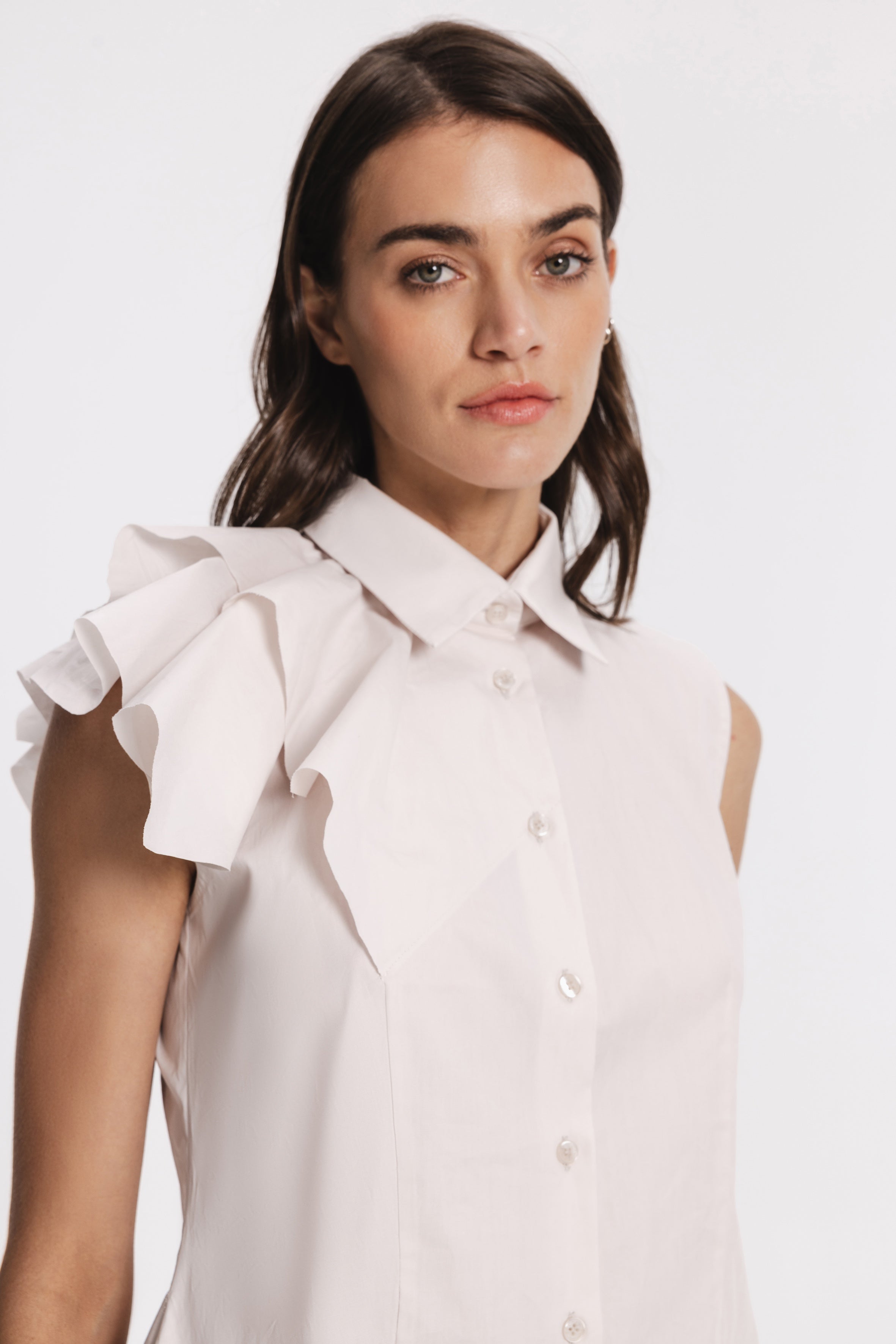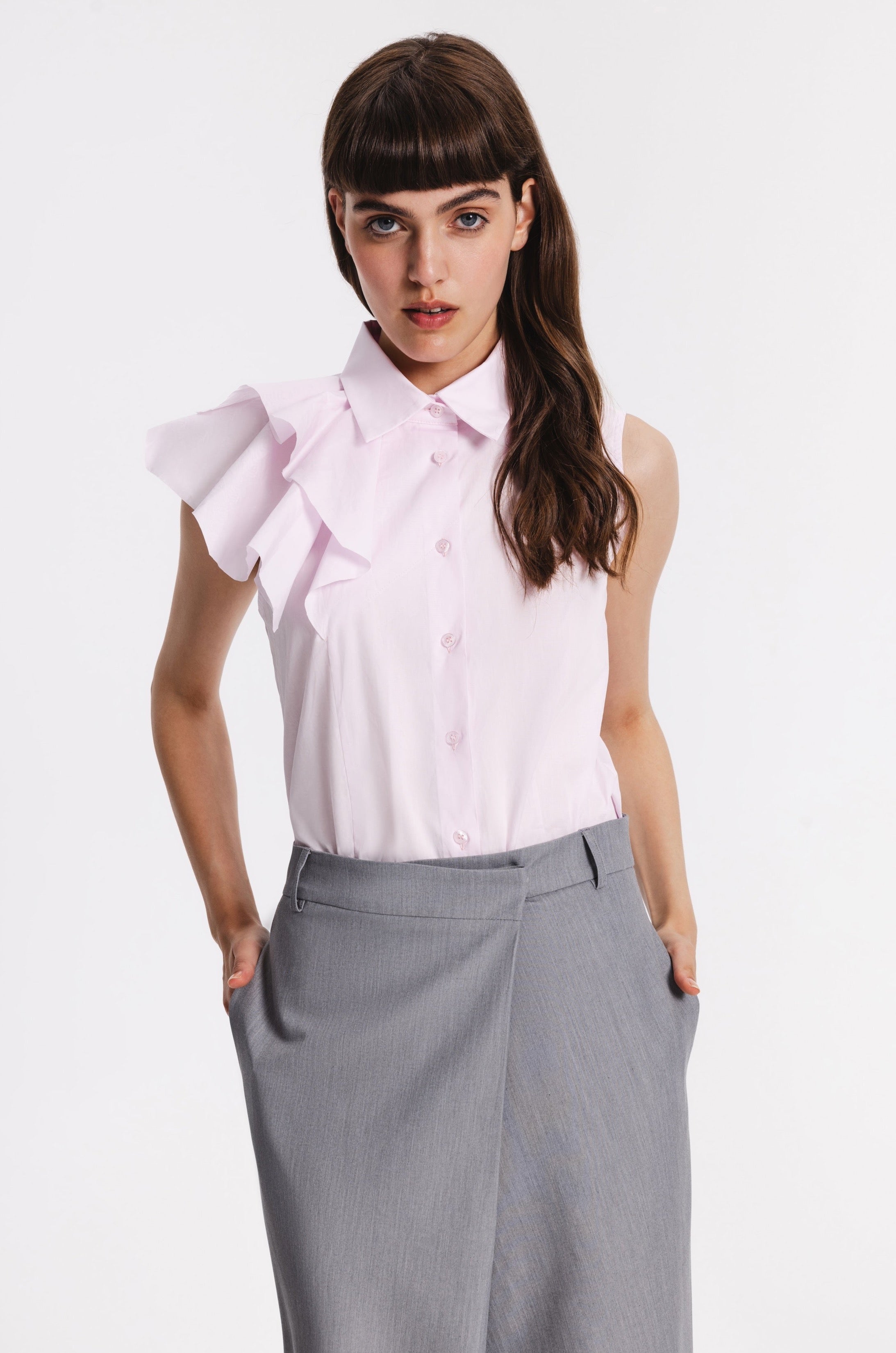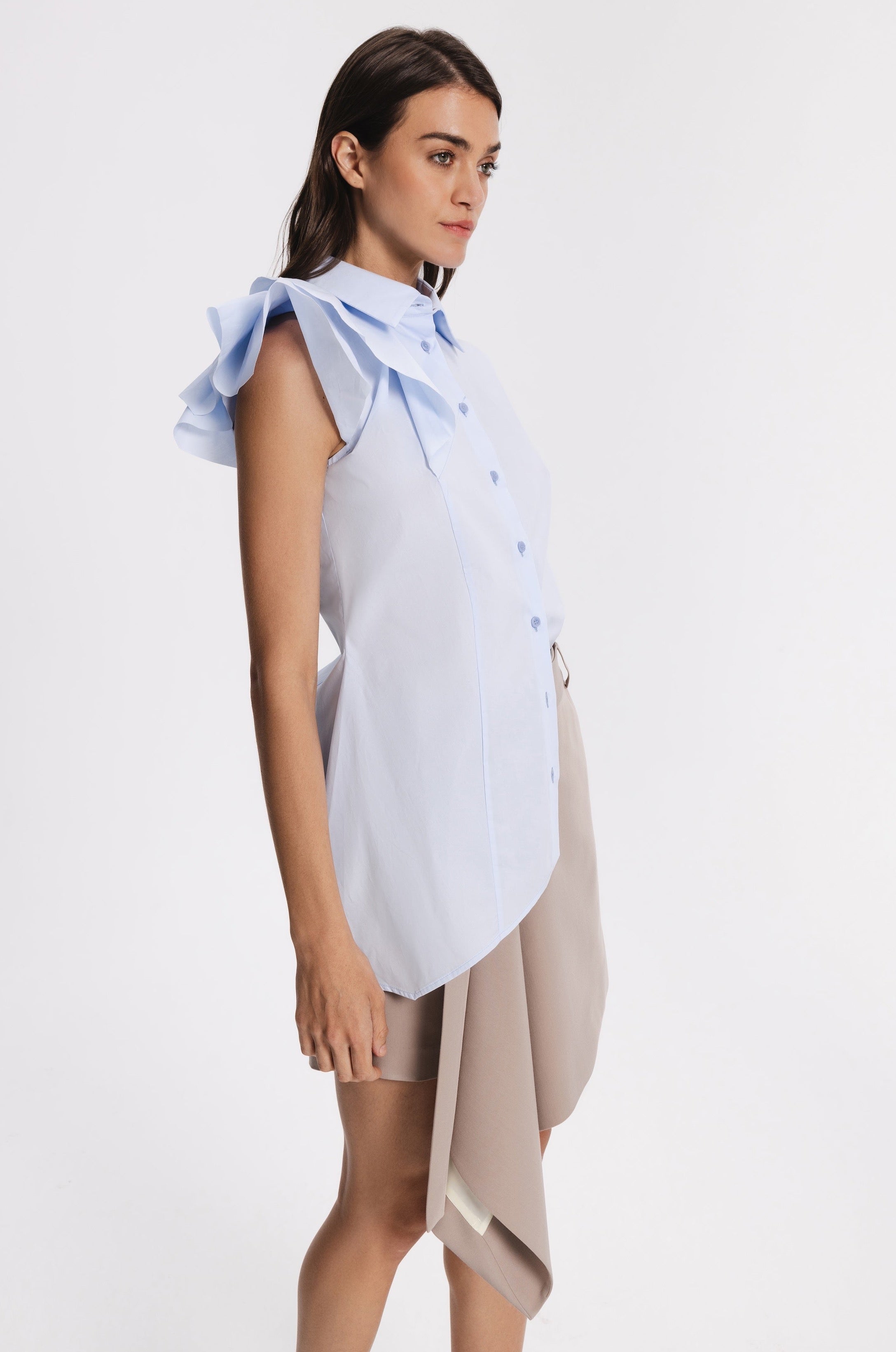 Sleeveless slim-fit poplin shirt with volant on the right shoulder. Asymmetric hem.