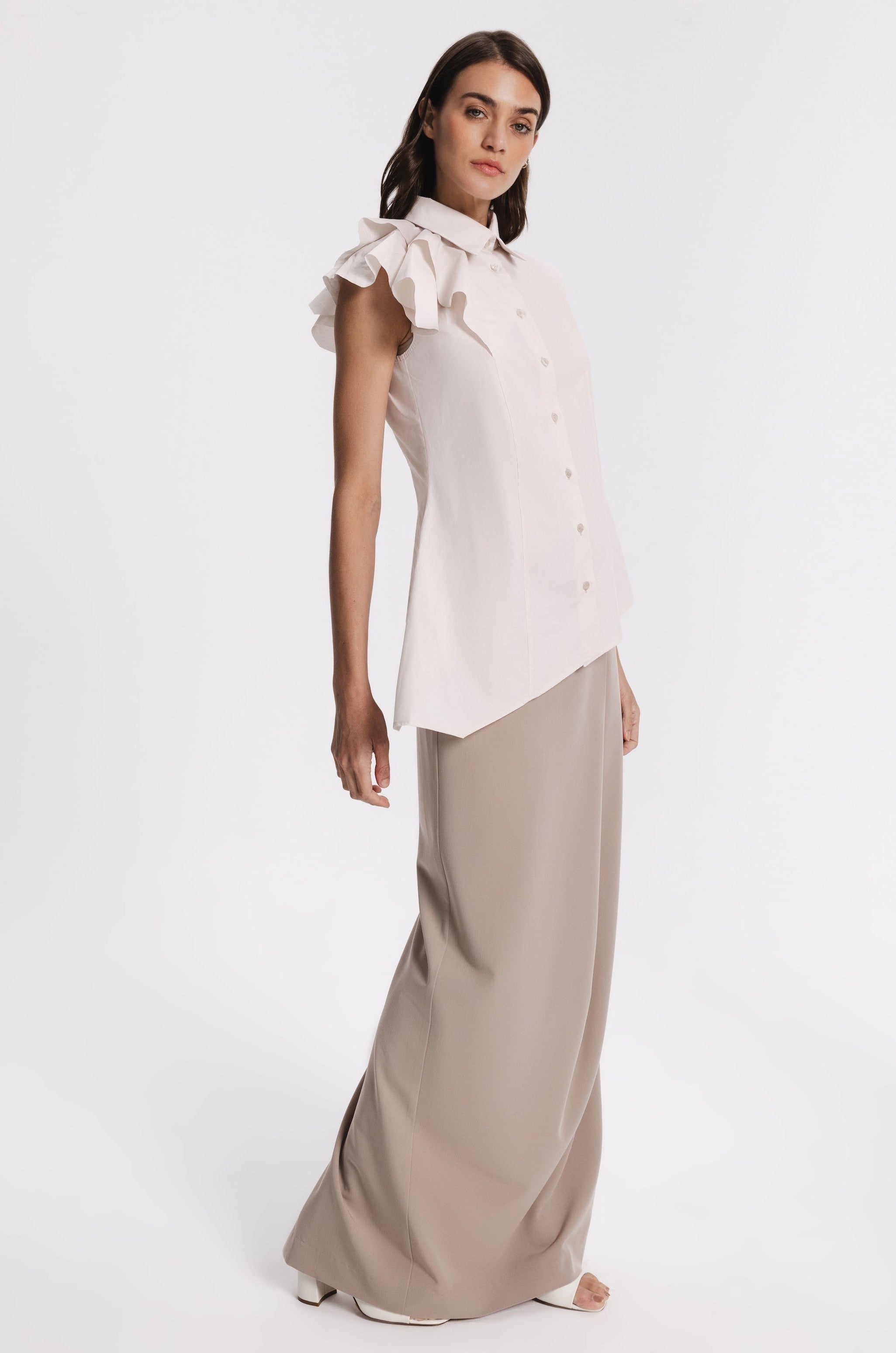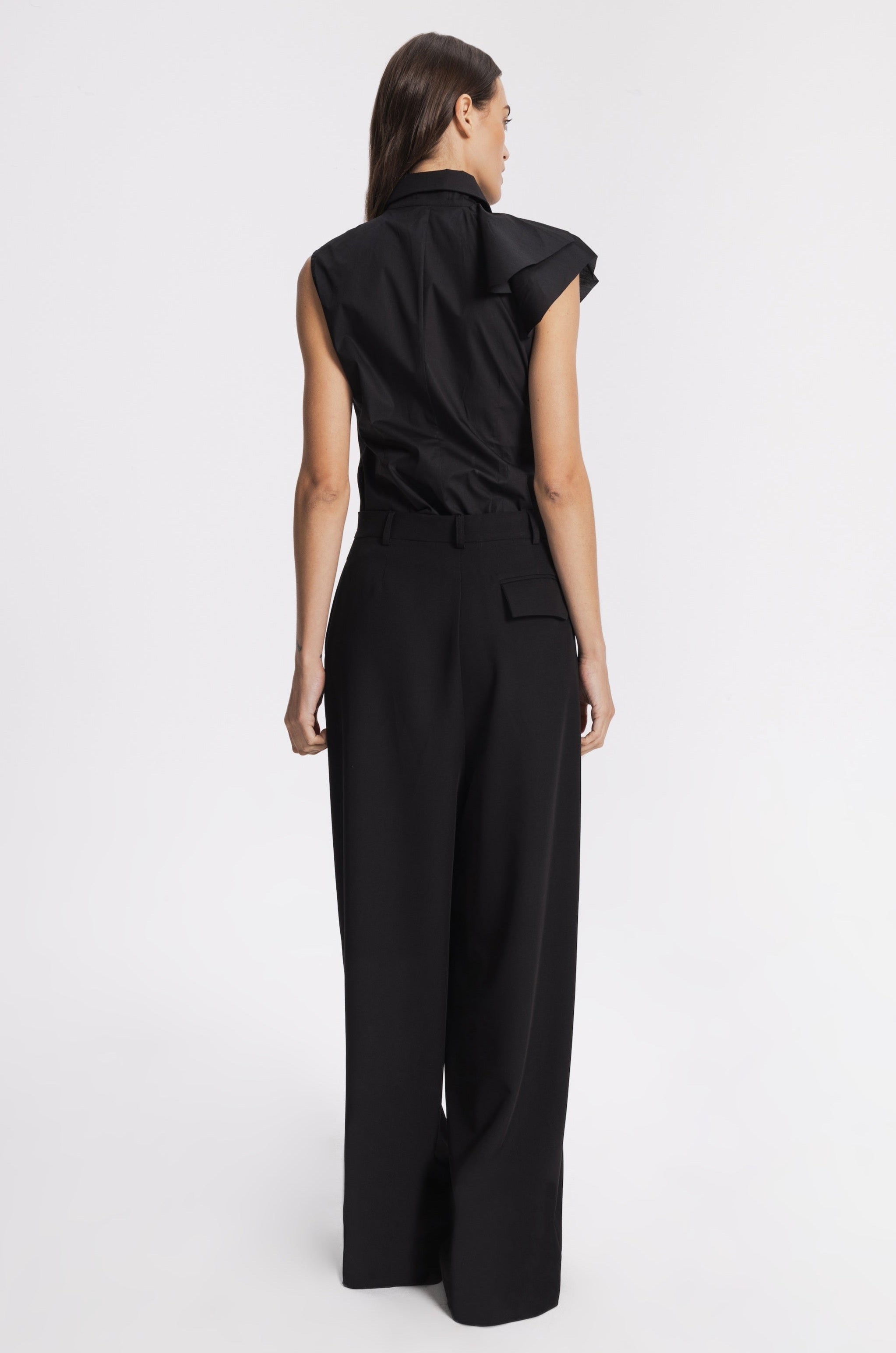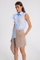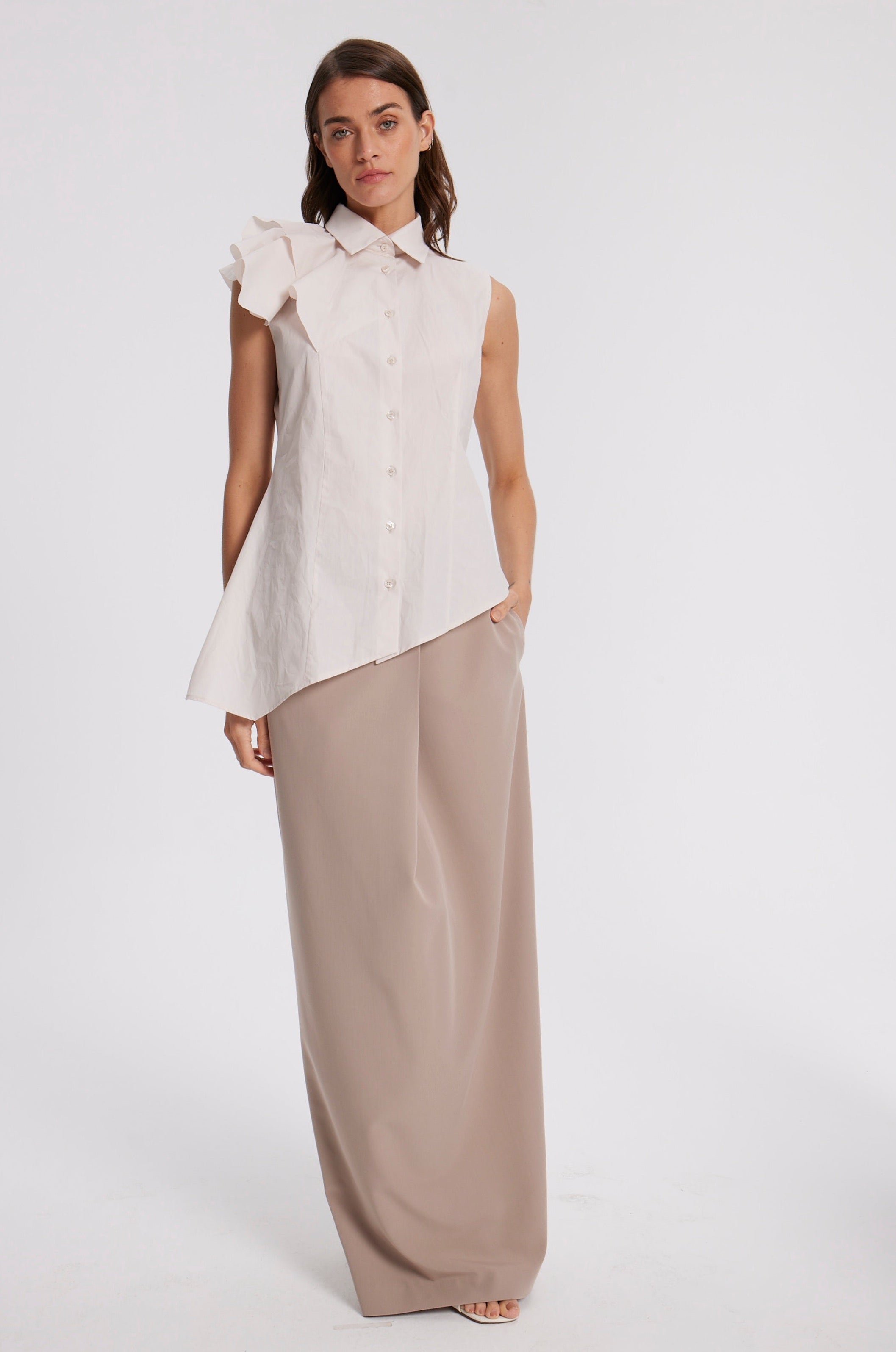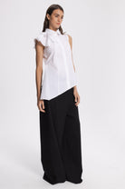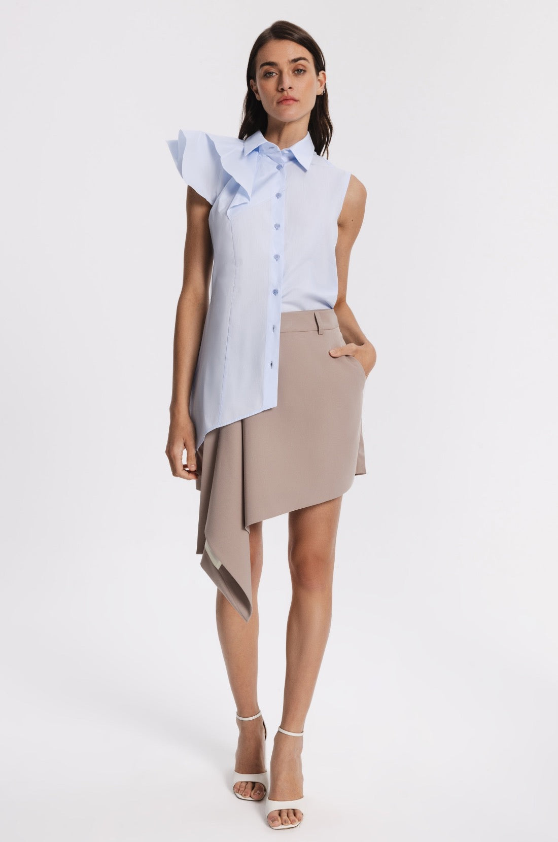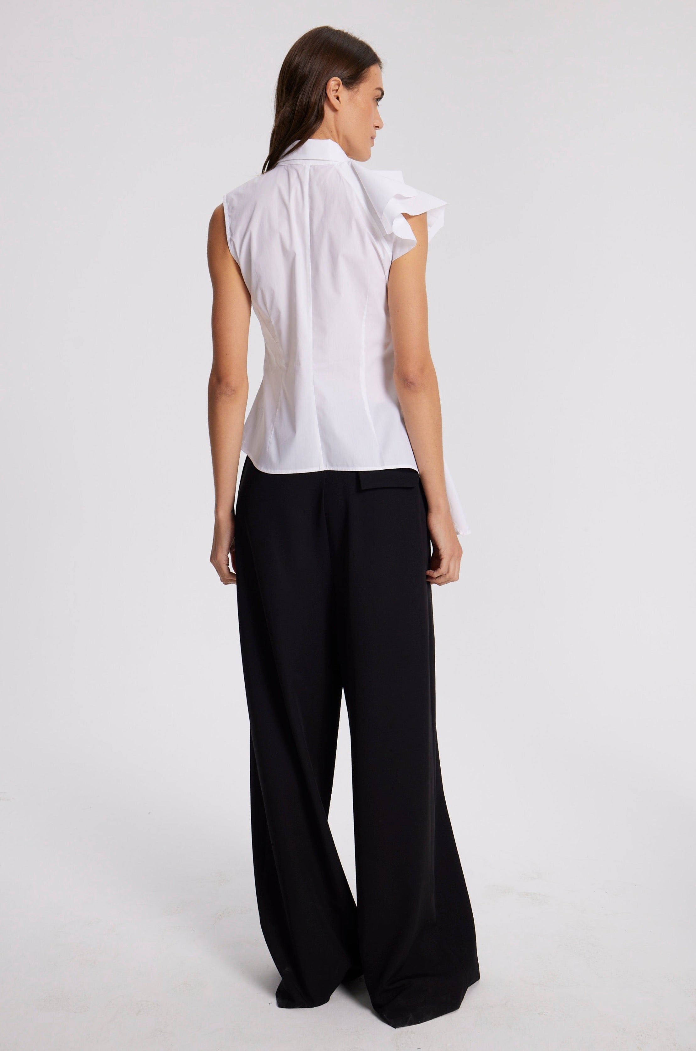 Sleeveless slim-fit poplin shirt with volant on the right shoulder. Asymmetric hem.