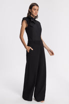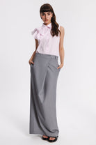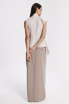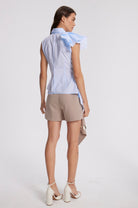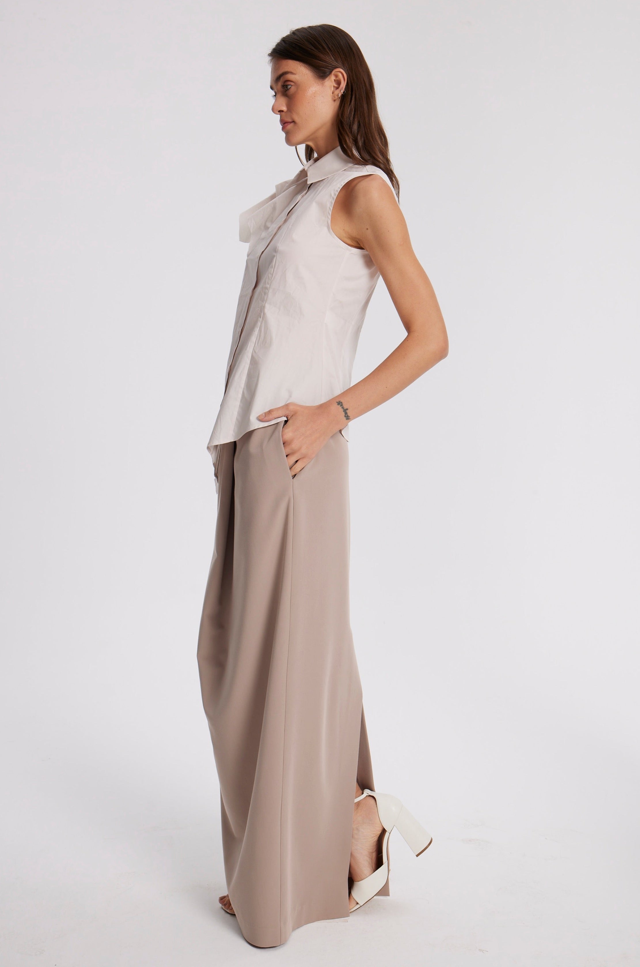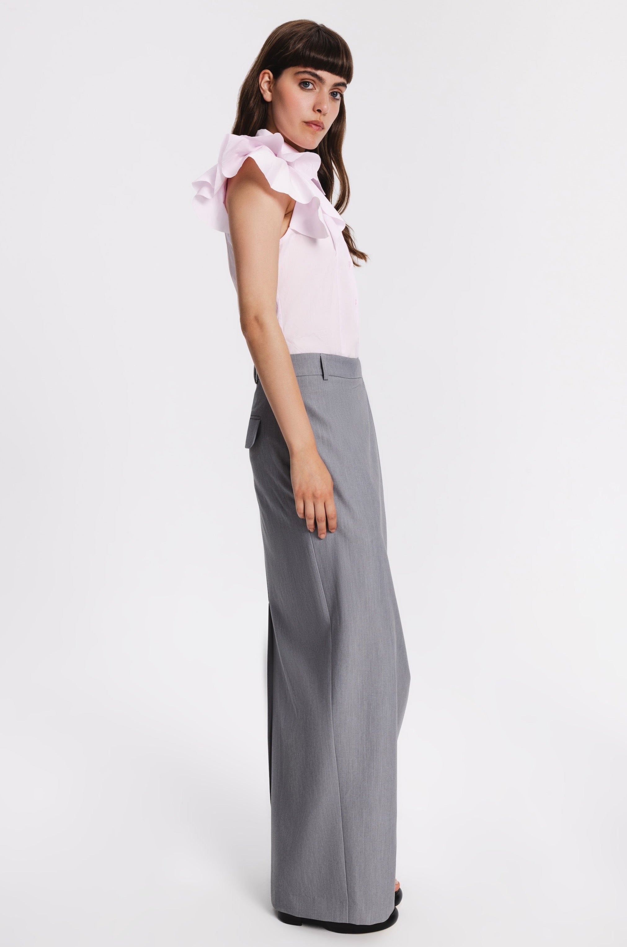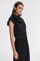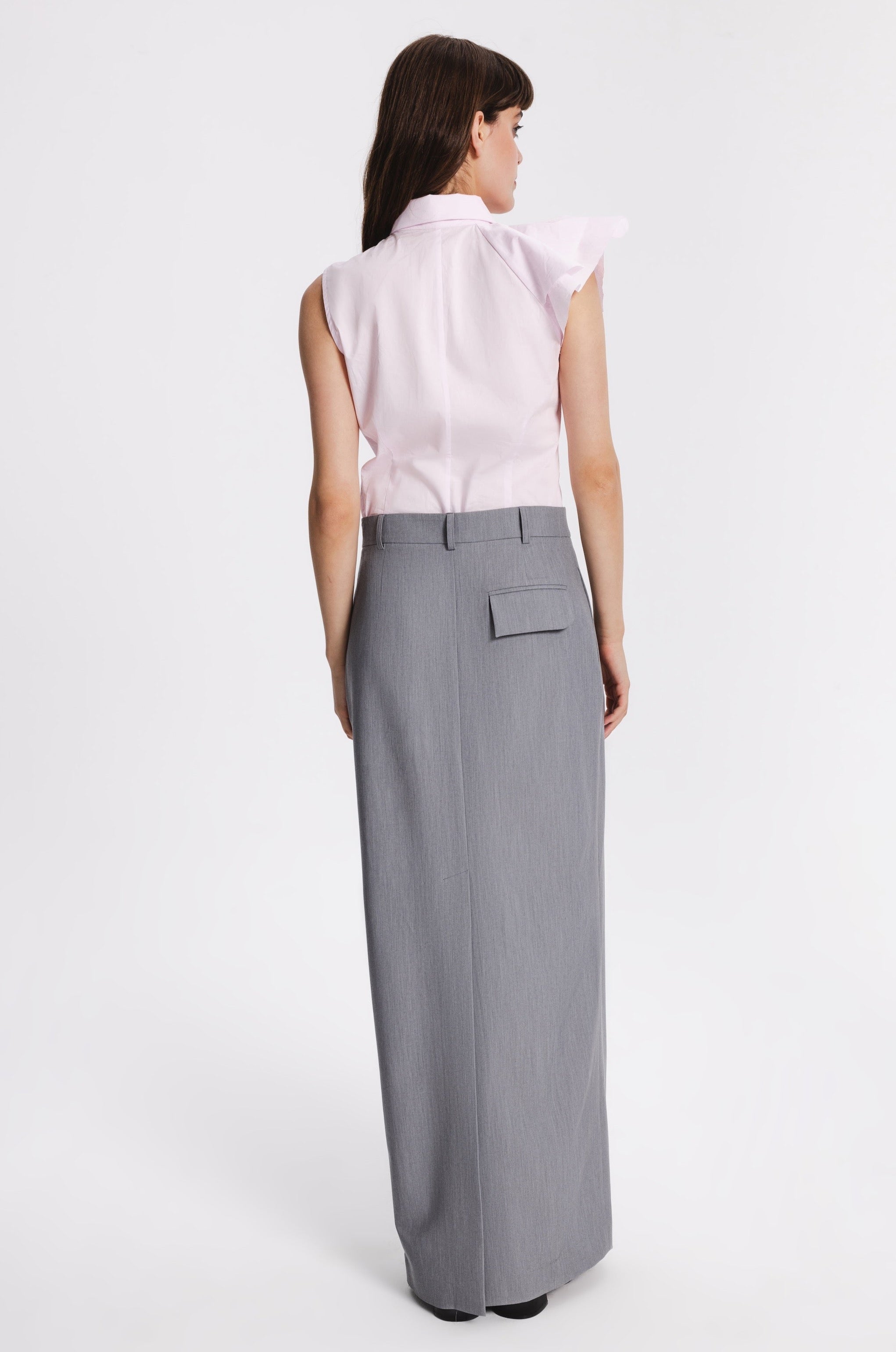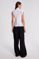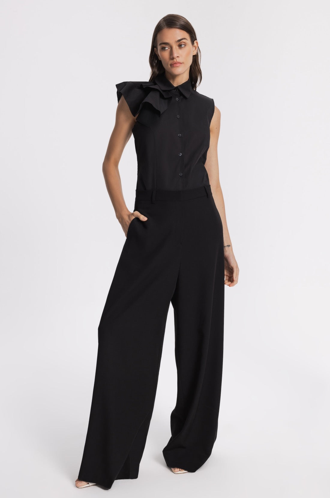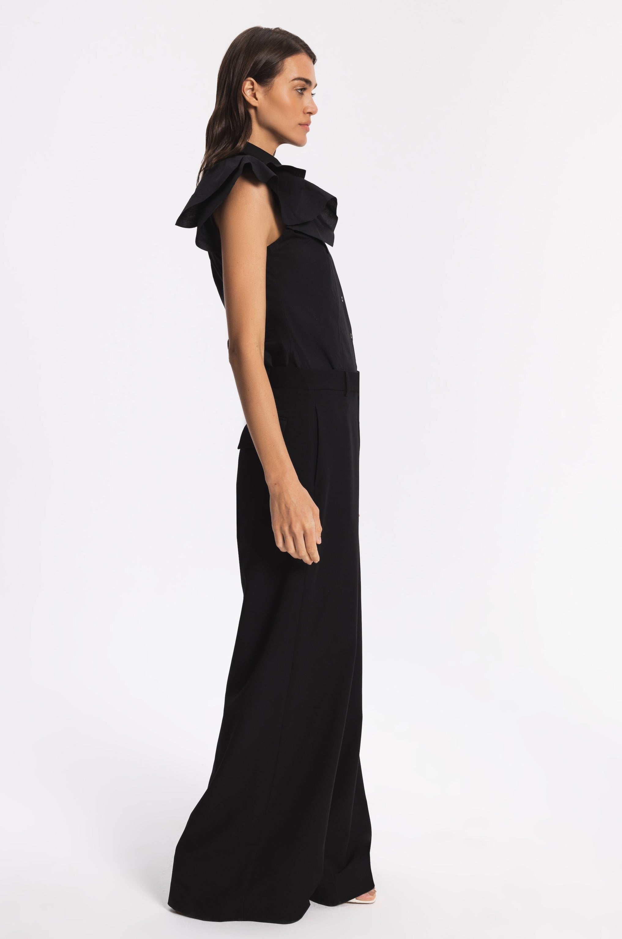 Sleeveless slim-fit poplin shirt with volant on the right shoulder. Asymmetric hem.