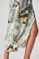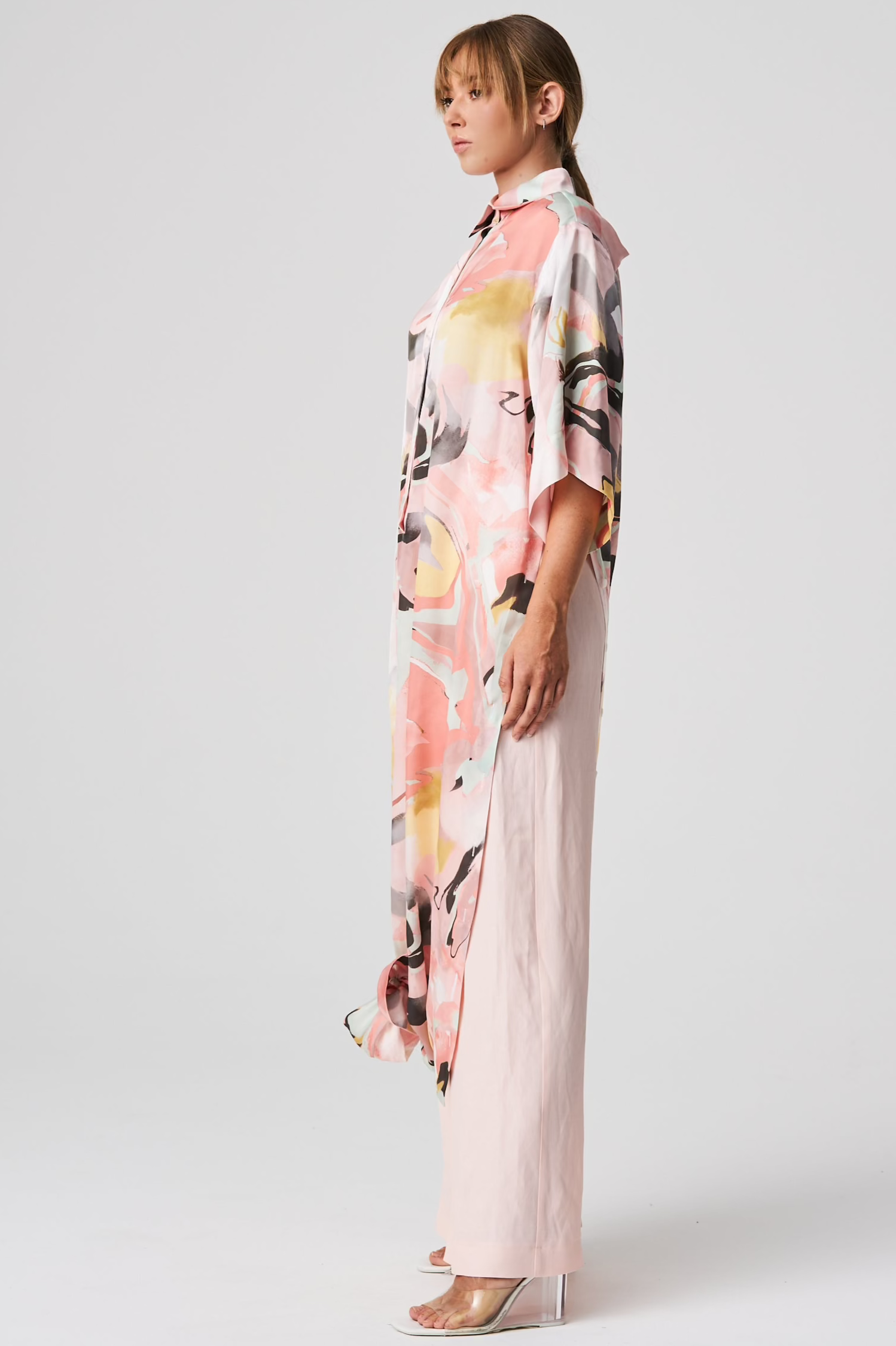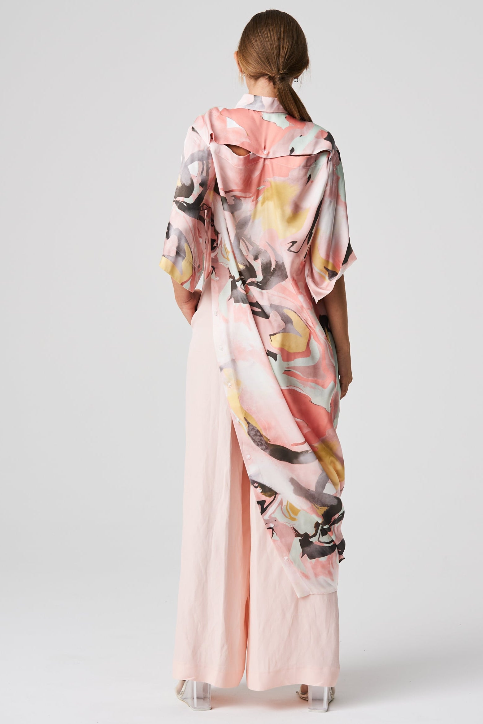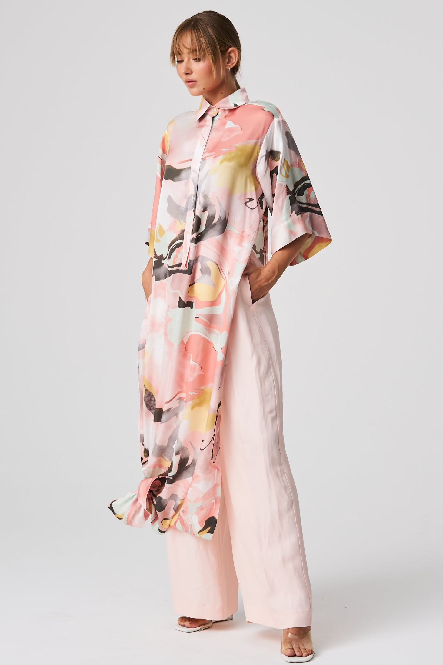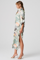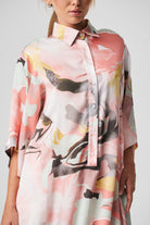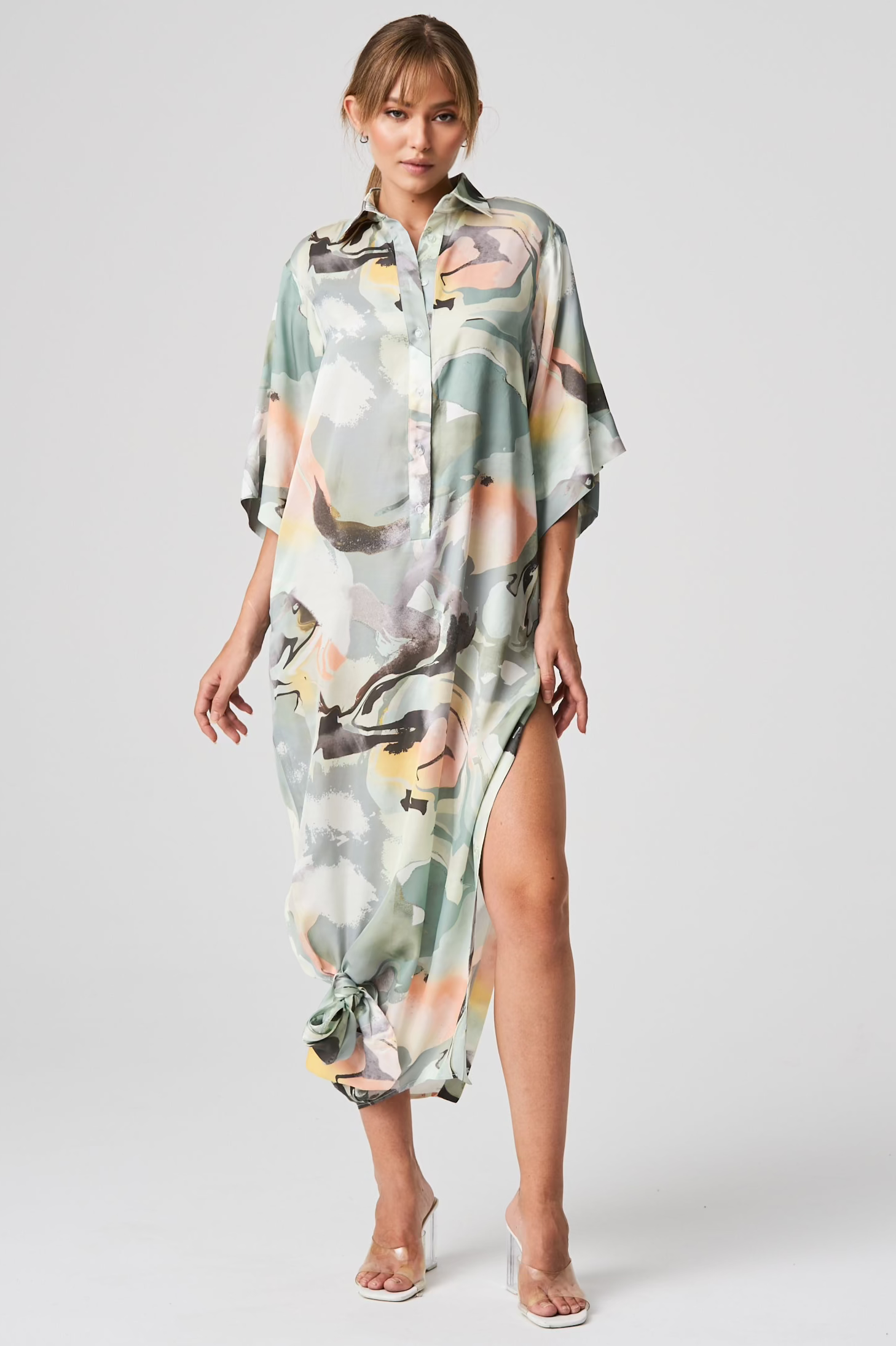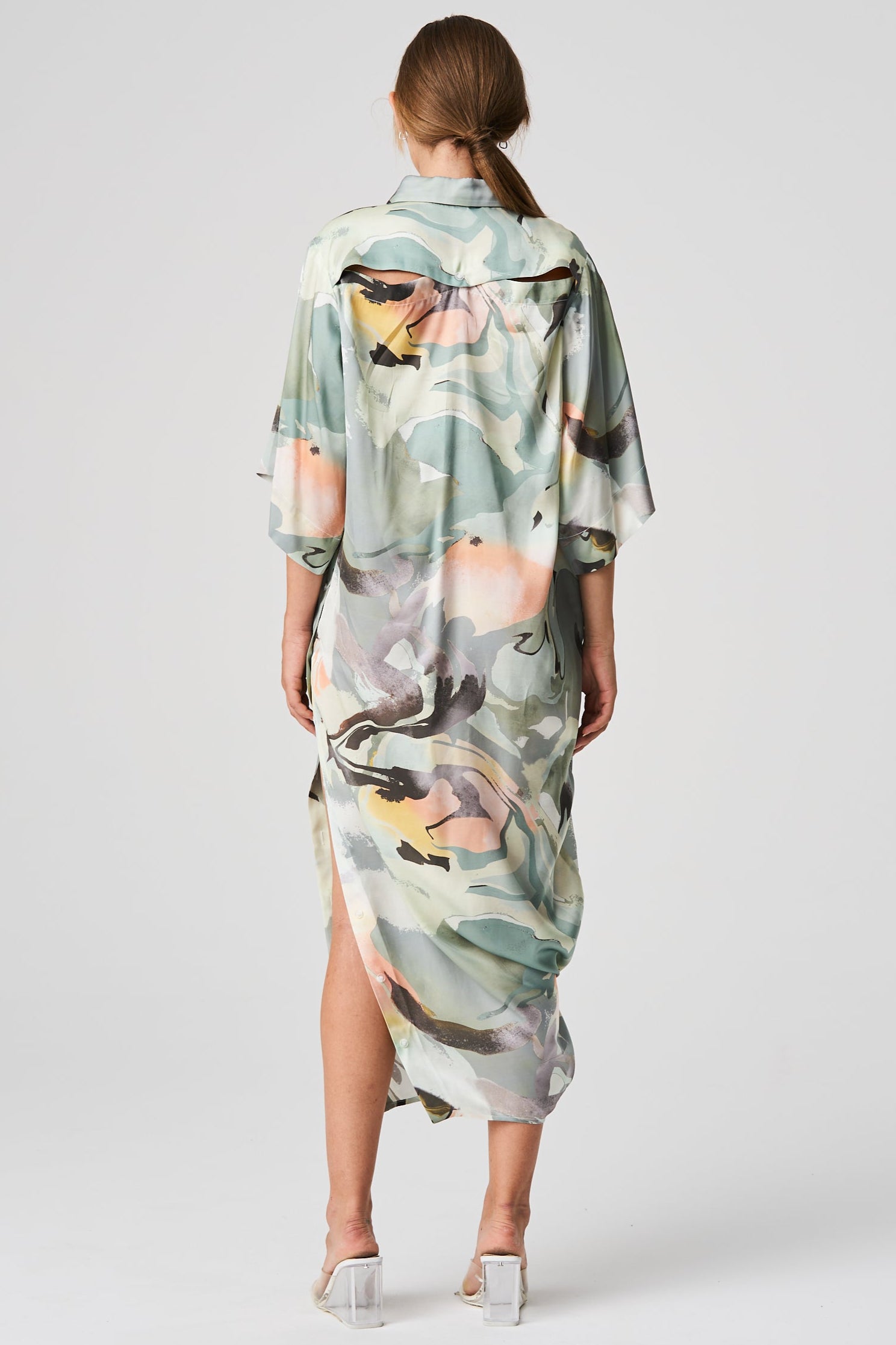 Straight-cut dress with wide three-quarter sleeves and a collar. This dress features a deep side slit that can be buttoned all the way to the bottom. The front has a button closure that goes halfway down. At the back, there is a detail: a horizontal cut in the shoulder area that opens with a button.