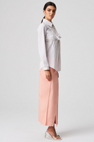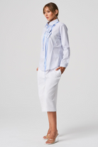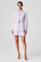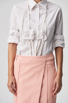 Classic-cut shirt with small cuffs and a regular collar. The shirt features floral decorations and tonal fabric ties on the front. These details allow for versatility, offering different styling options.