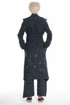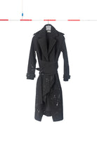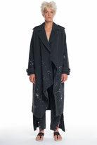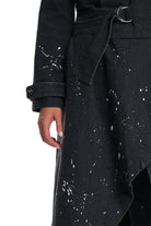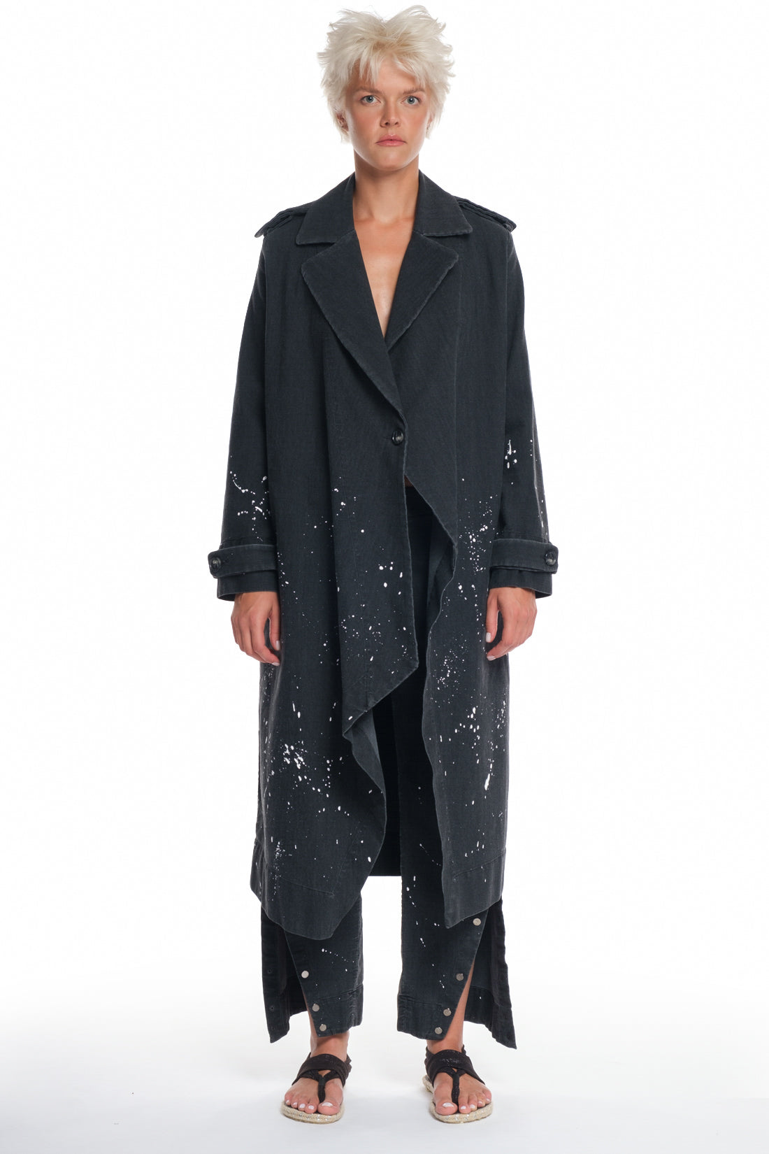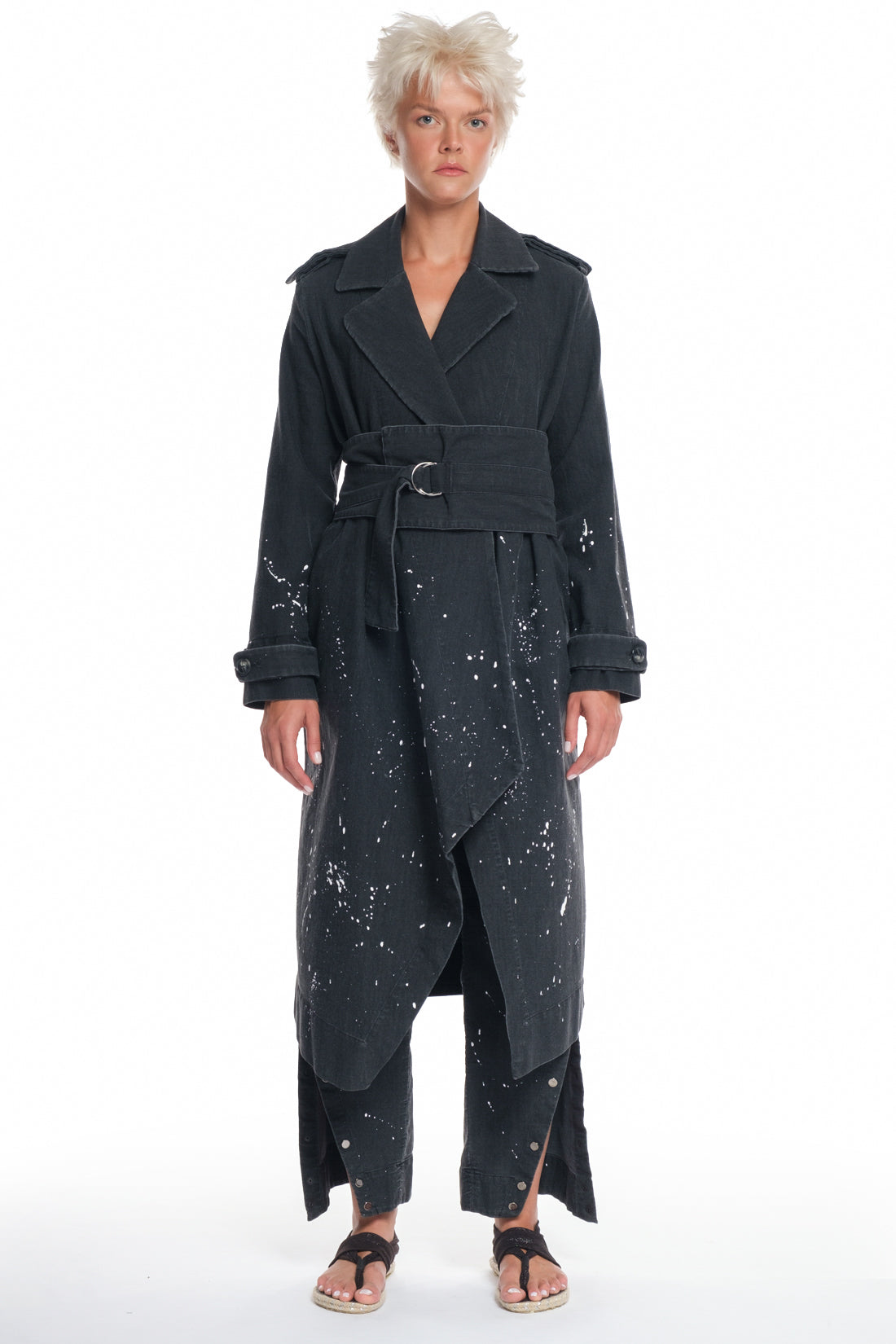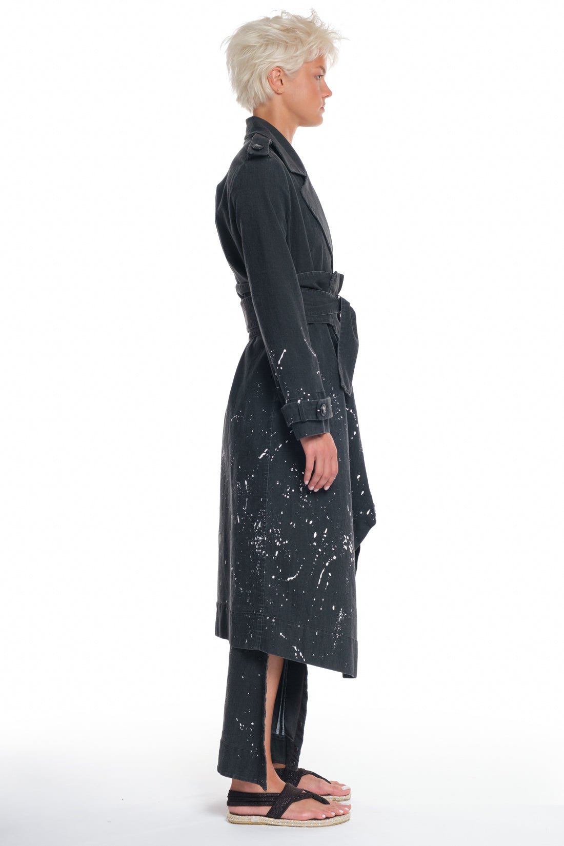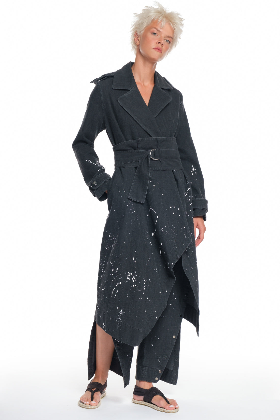 Asymmetric trench coat of a washed and sprayed elastic denim, with belt and two side pockets