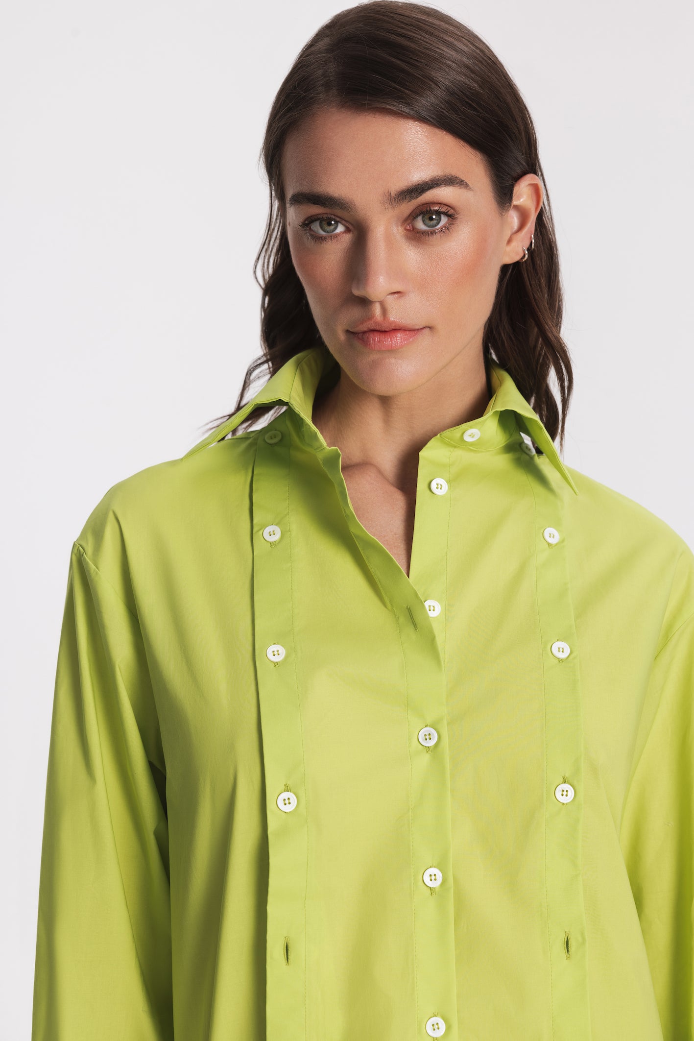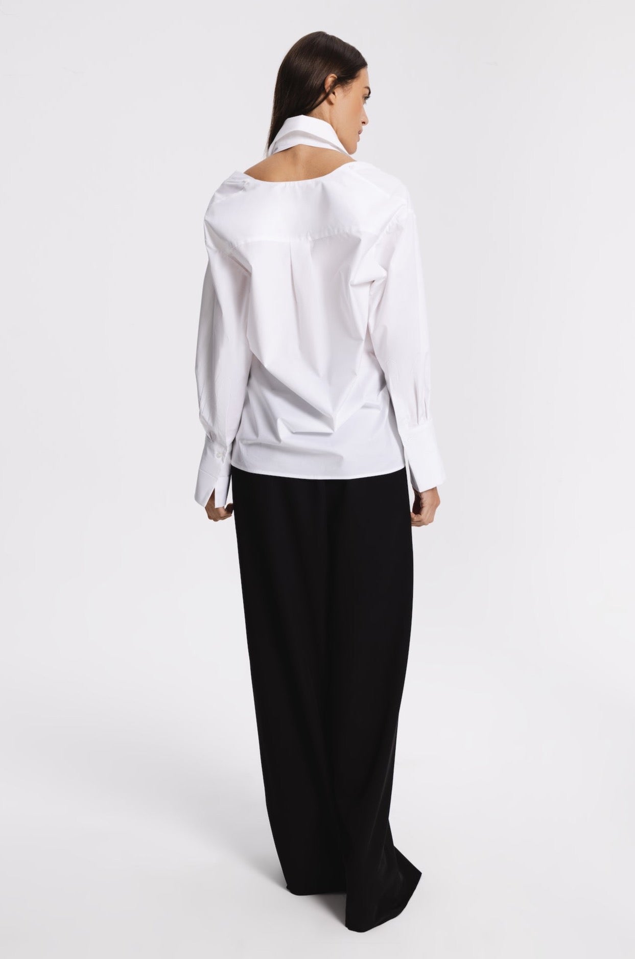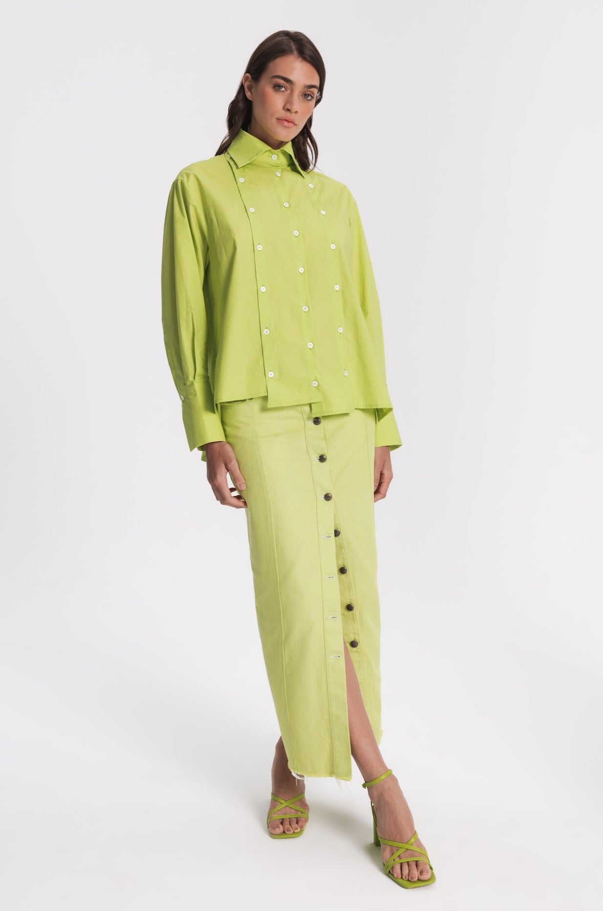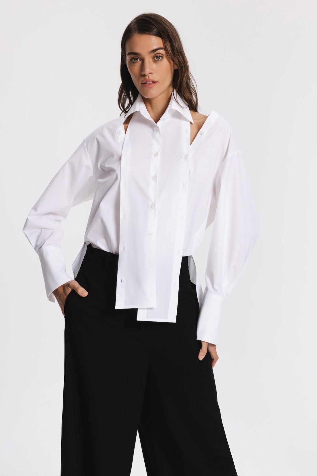 Over fit shirt with large cuffs, the front part can be opened and customised by the buttons. Regular collar separated from the main part. The hem in the left front side is slightly longer. Cuts on side hem.