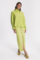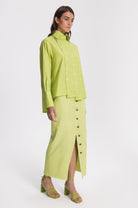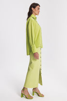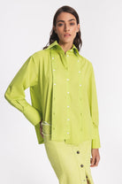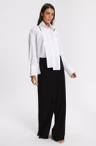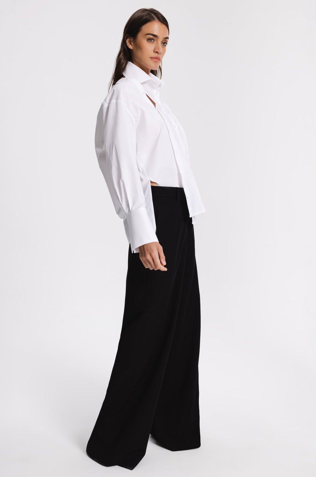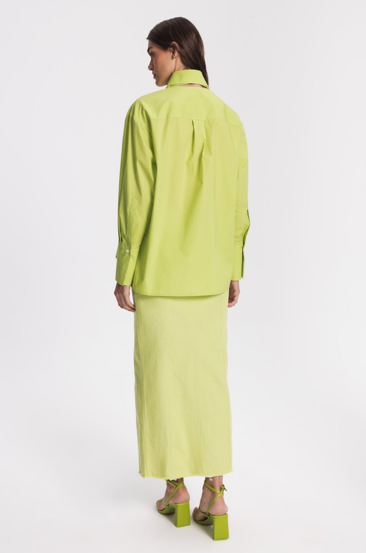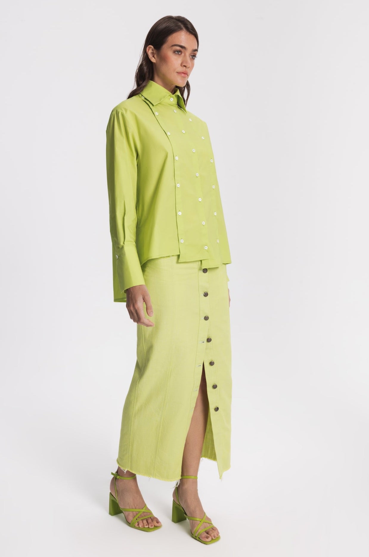 Over fit shirt with large cuffs, the front part can be opened and customised by the buttons. Regular collar separated from the main part. The hem in the left front side is slightly longer. Cuts on side hem.