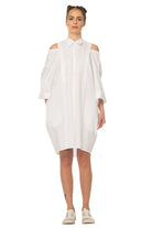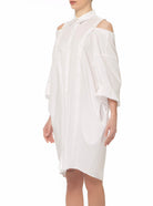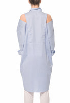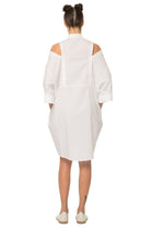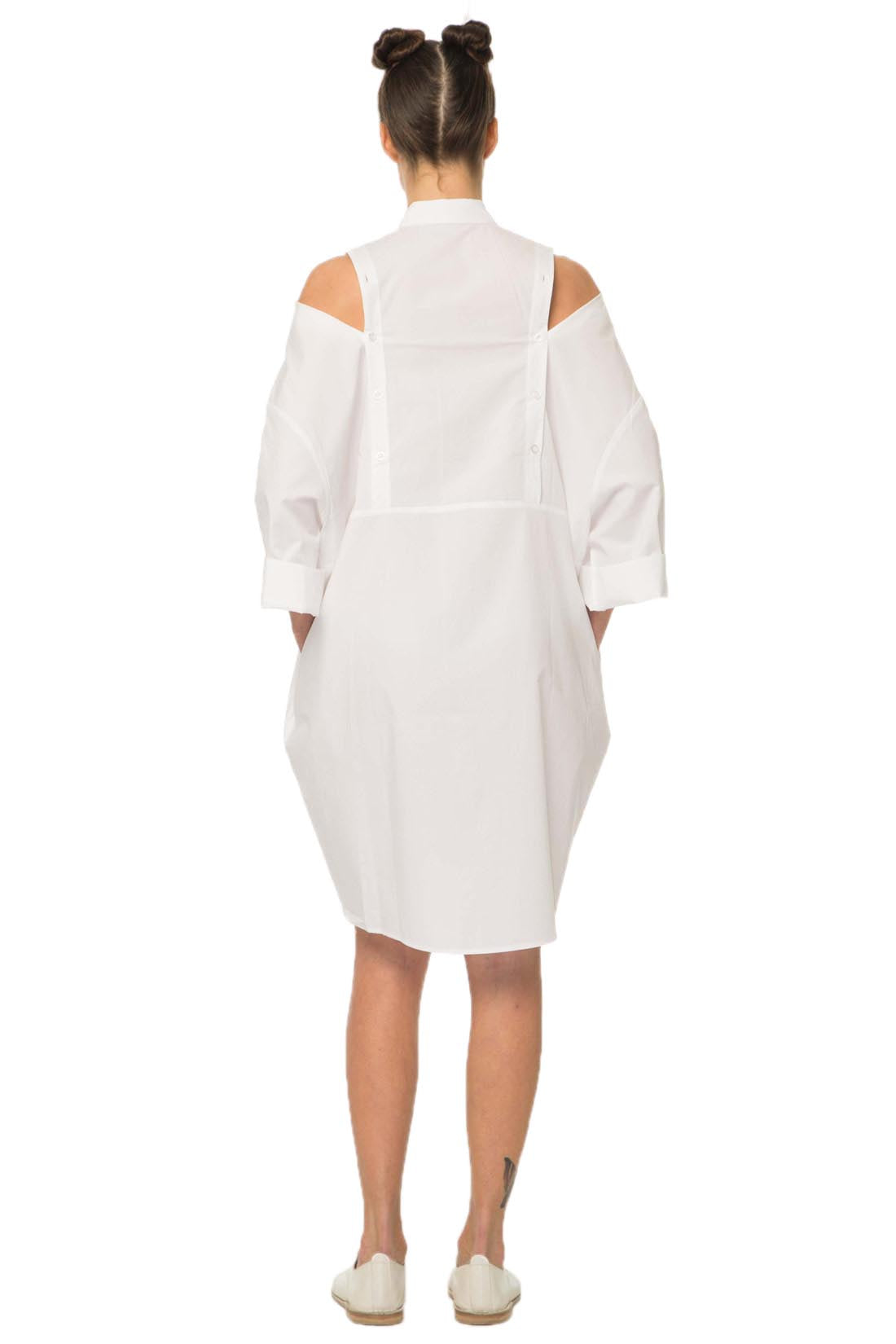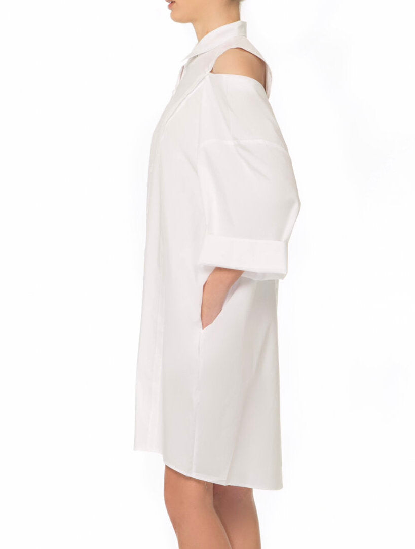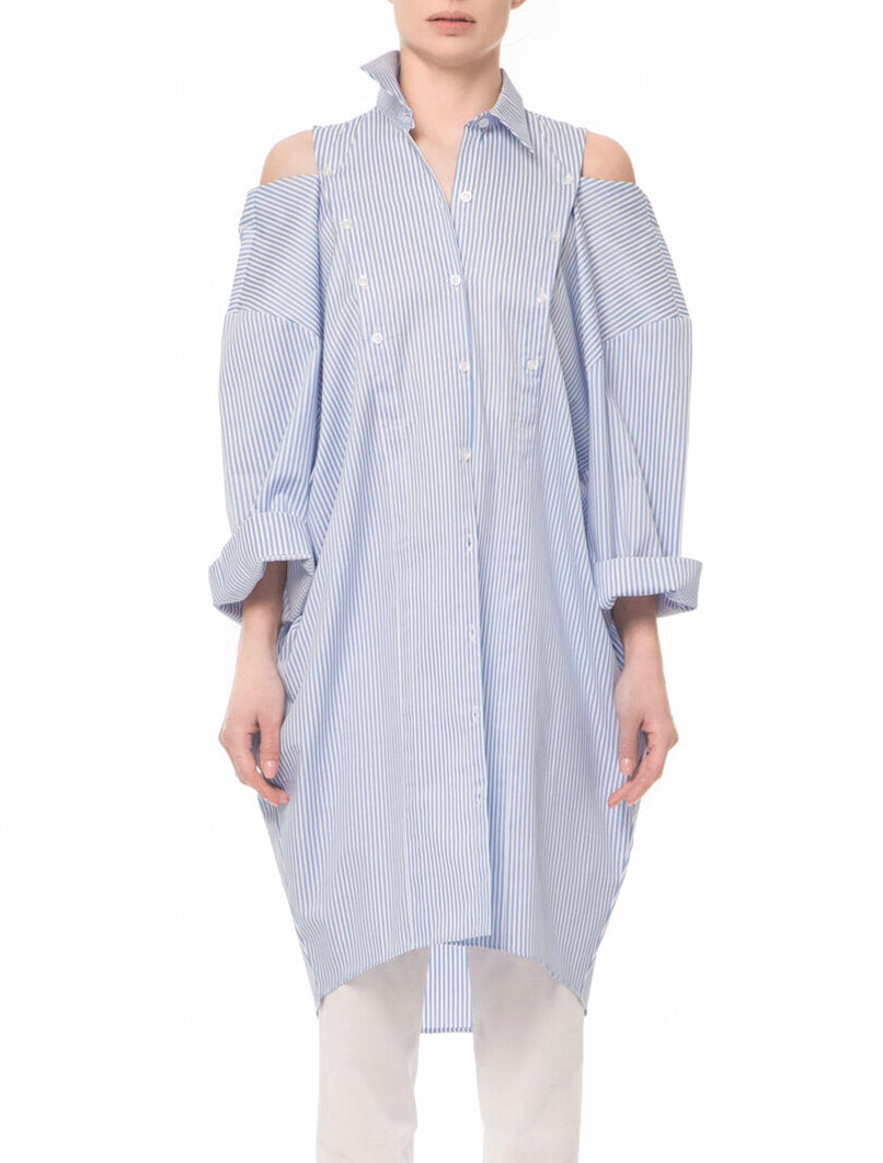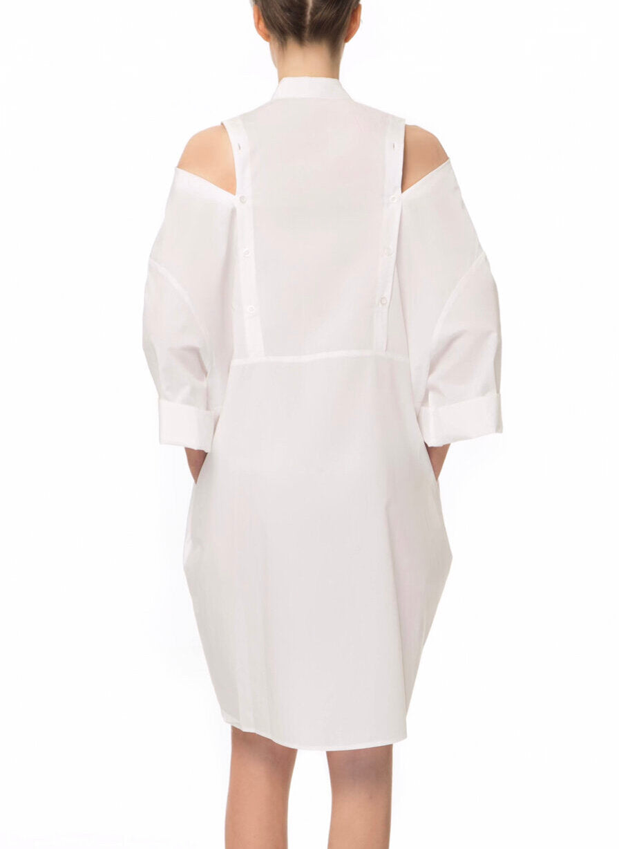 OVERSIZED COTTON POPLIN SHIRT WITH THREE-QUARTERS-LENGHT SLEEVES AND TWO ADDICTIONAL BUTTON PLACKETS WHICH RUN FROM FRONT TO BACK AND REVEAL THE SHOULDERS.