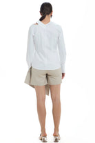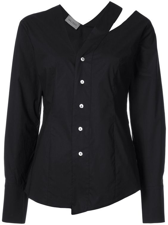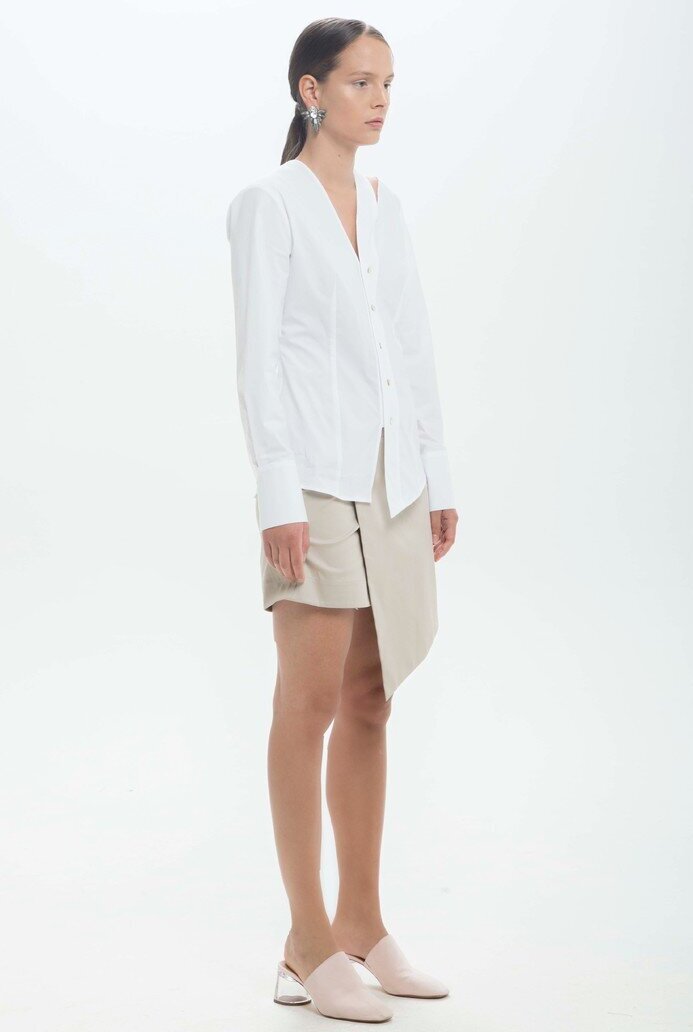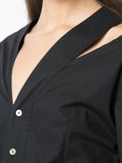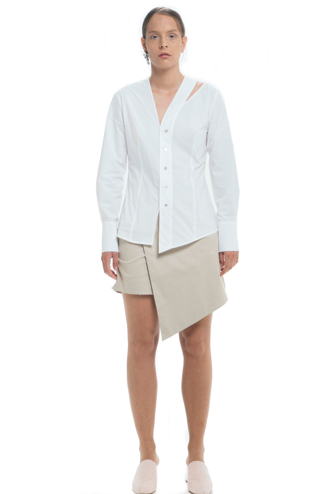 COLARLESS SLIM FIT COTTON SHIRT WITH LONG SLEEVES AND ASYMMETRICAL V NECKLINE. MOTHER-OF PEARL BUTTONS.