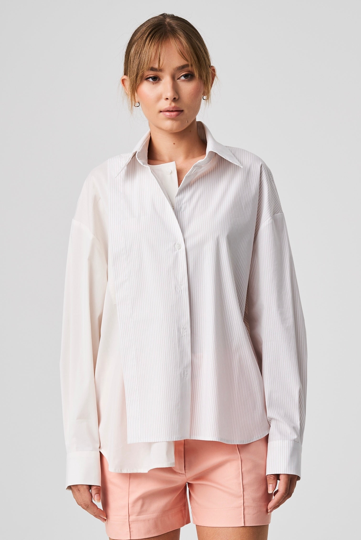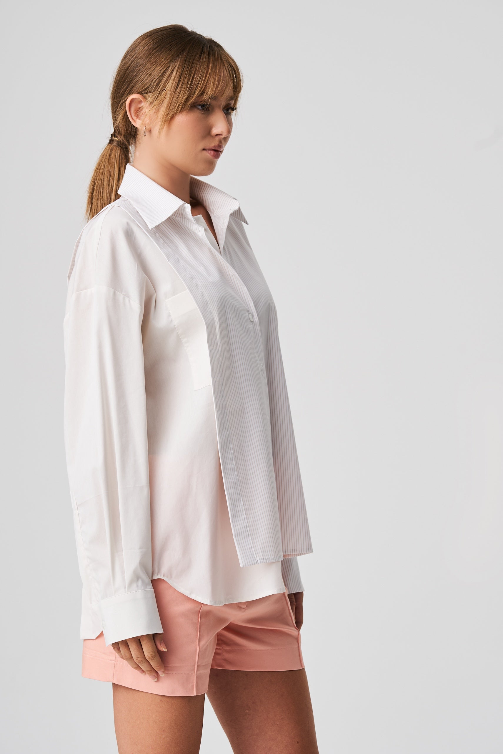Regular-fit cotton shirt. The unique feature of this shirt is the double layer at the front, which can be detached and buttoned in different ways, creating a playful ruffle. The panels on the front are asymmetrical. The hem at the back is rounded with side slits.