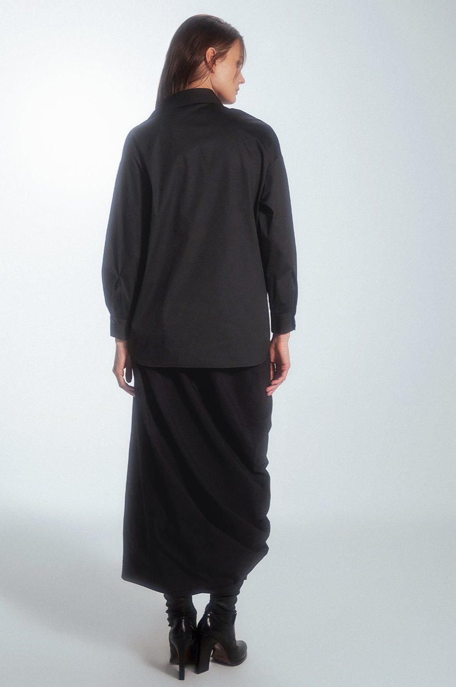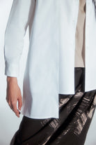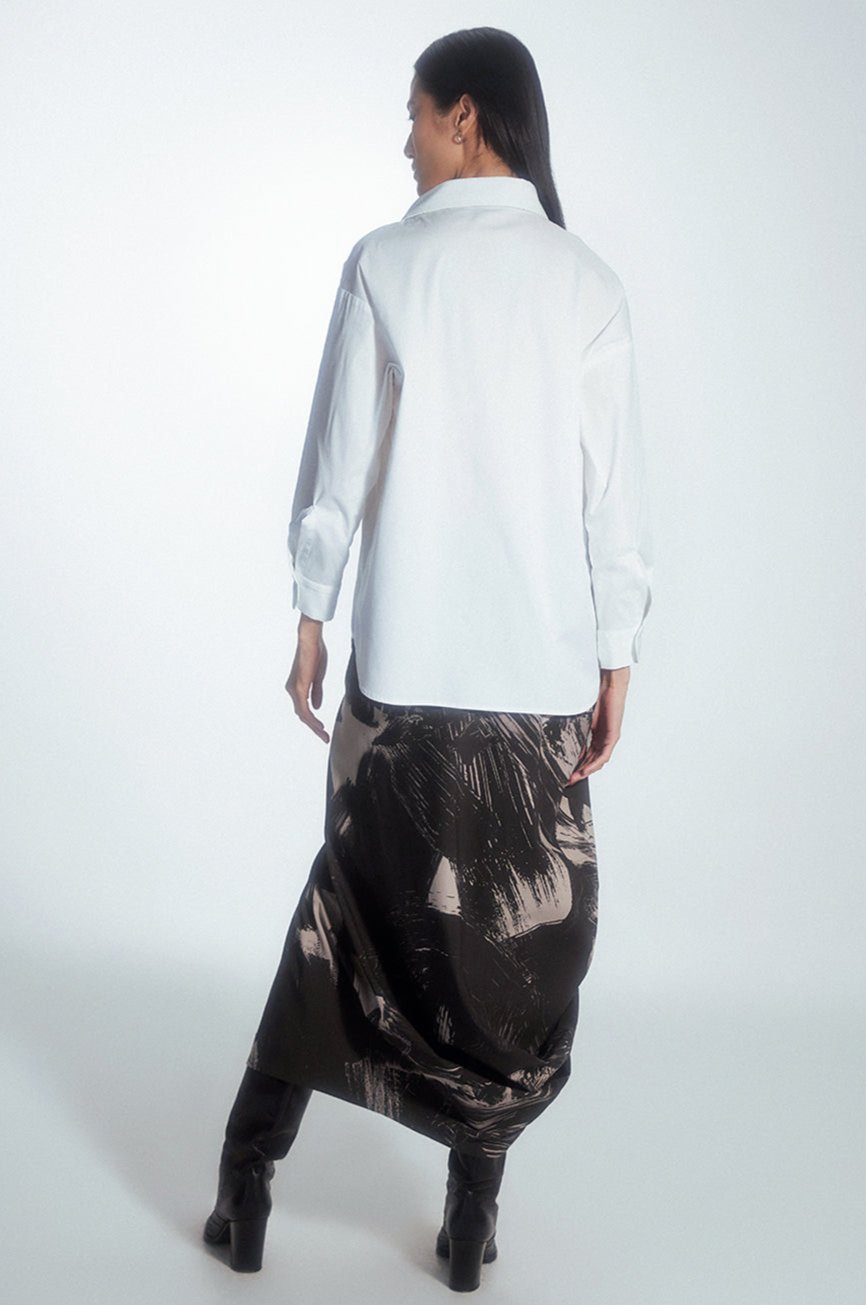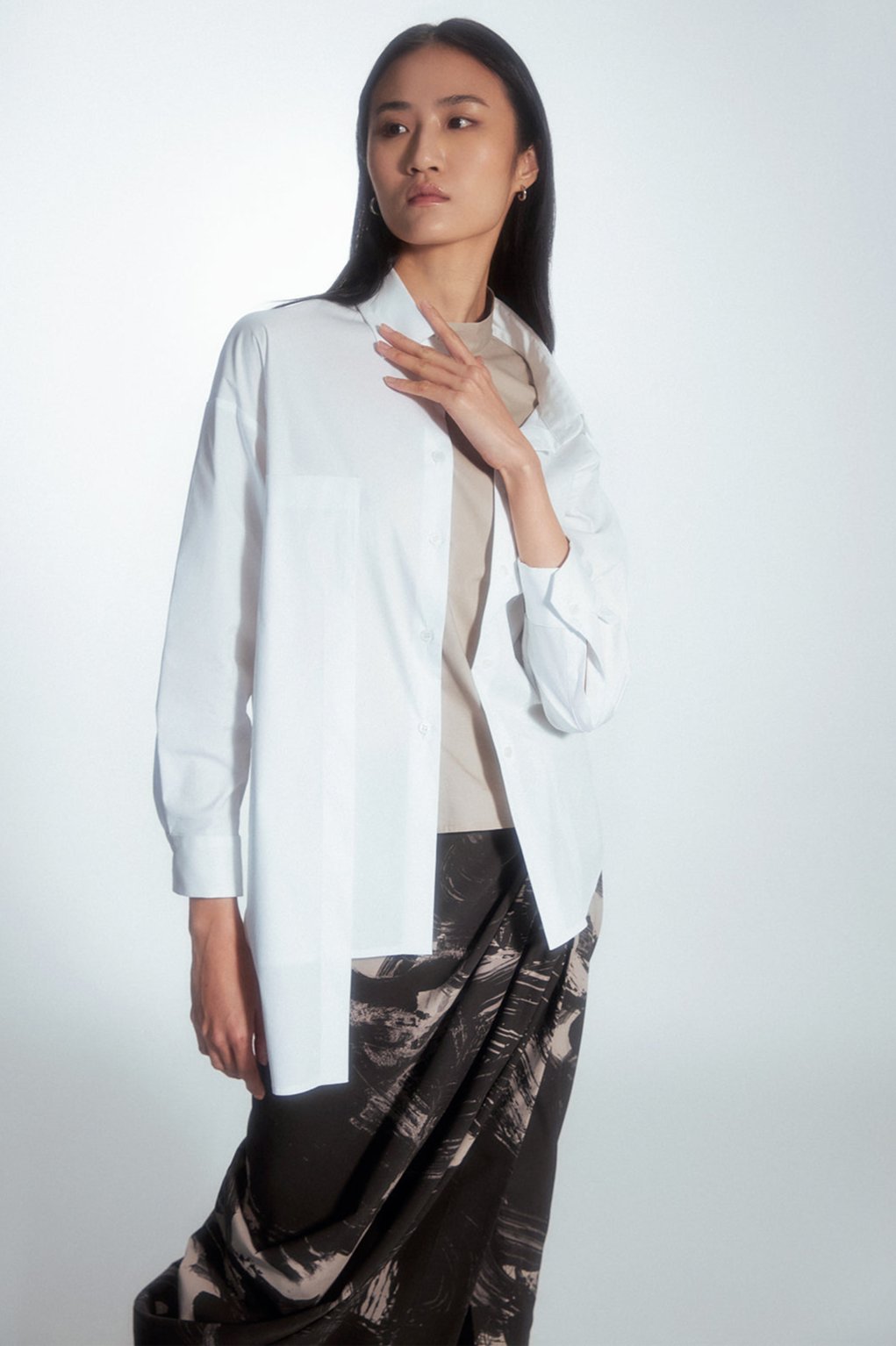 Regular-cut shirt with a minimalist style. The uniqueness of this shirt is an extra layer of beige color on one side only. On the front, there is a tone-on-tone panel with a prolonged hem, creating an asymmetric look. The shirt can be customized by buttoning both layers as desired.