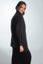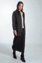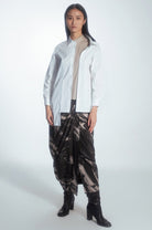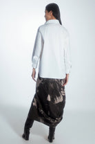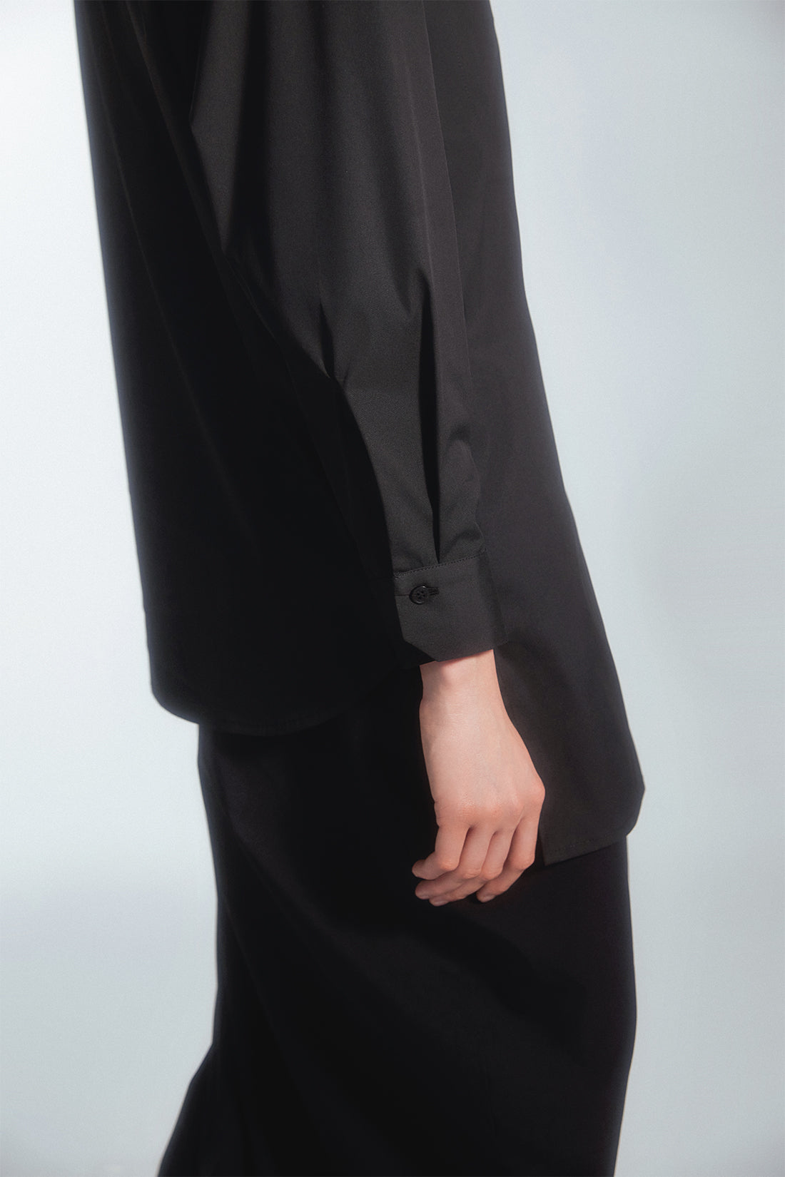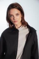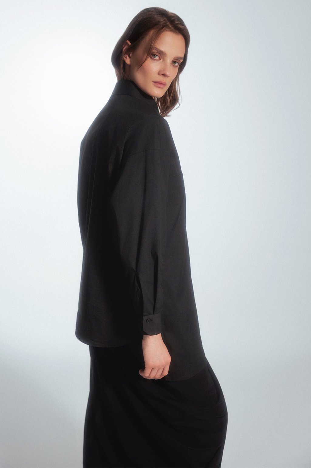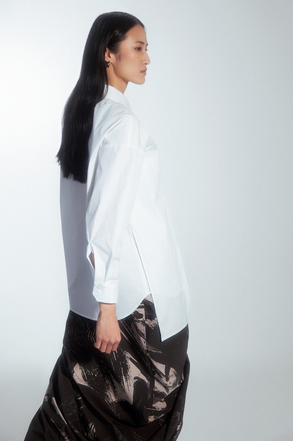 Regular-cut shirt with a minimalist style. The uniqueness of this shirt is an extra layer of beige color on one side only. On the front, there is a tone-on-tone panel with a prolonged hem, creating an asymmetric look. The shirt can be customized by buttoning both layers as desired.