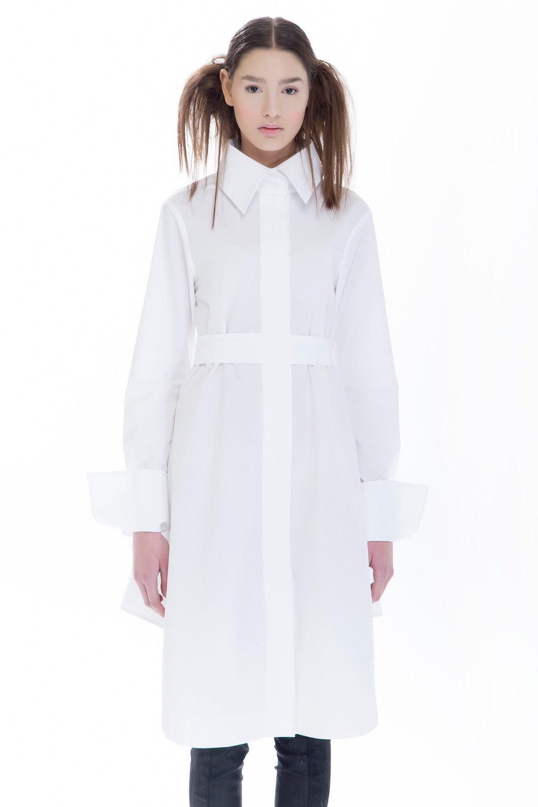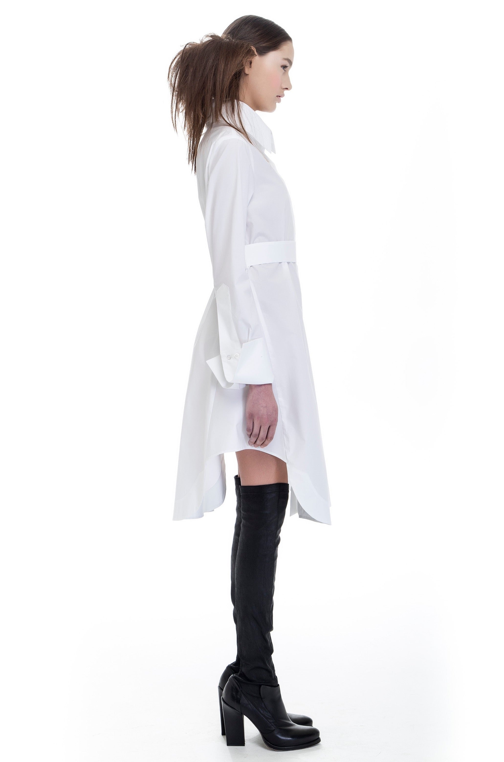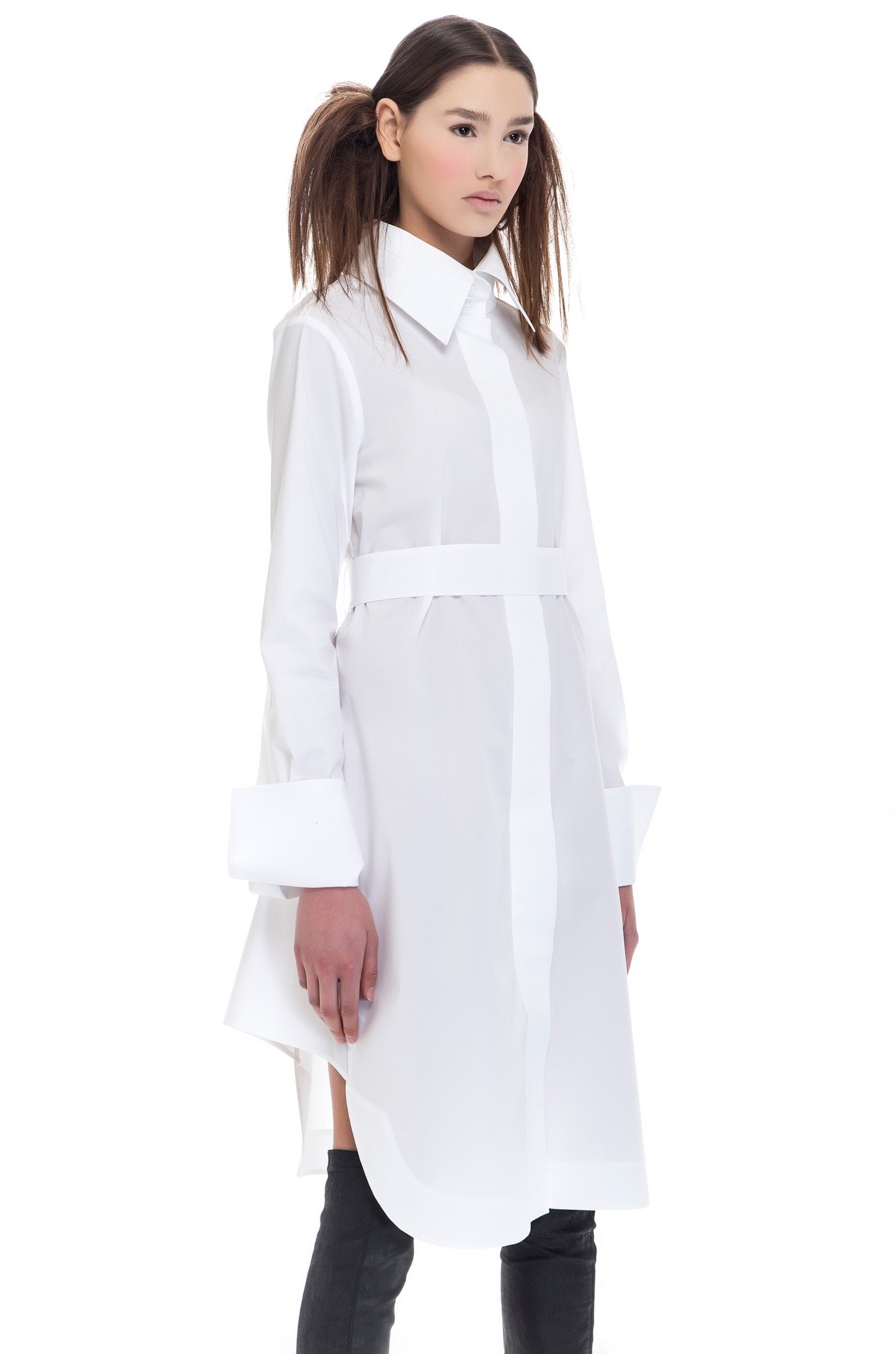 STRETCH COTTON POPLIN SHIRT-DRESS WITH LONG SLEEVES, FLARED FROM THE WAIST DOWN, DISTINCTIVE CUFFS AND GIANT COLLAR. WAIST BELT.