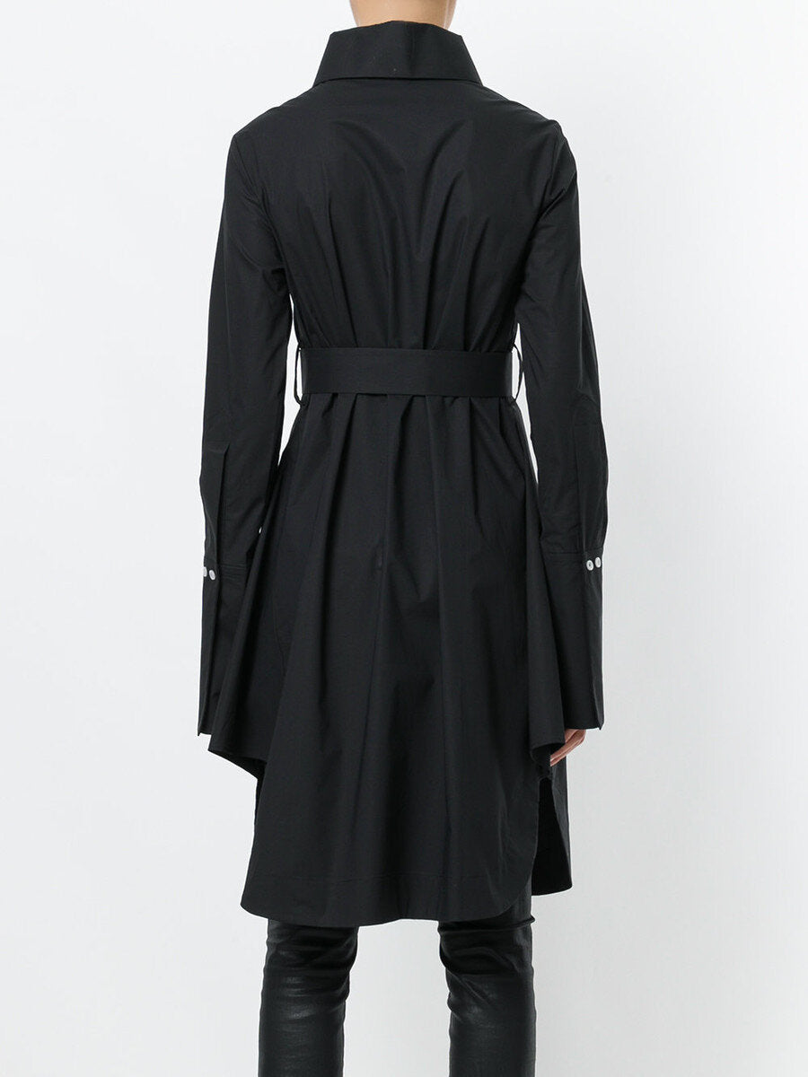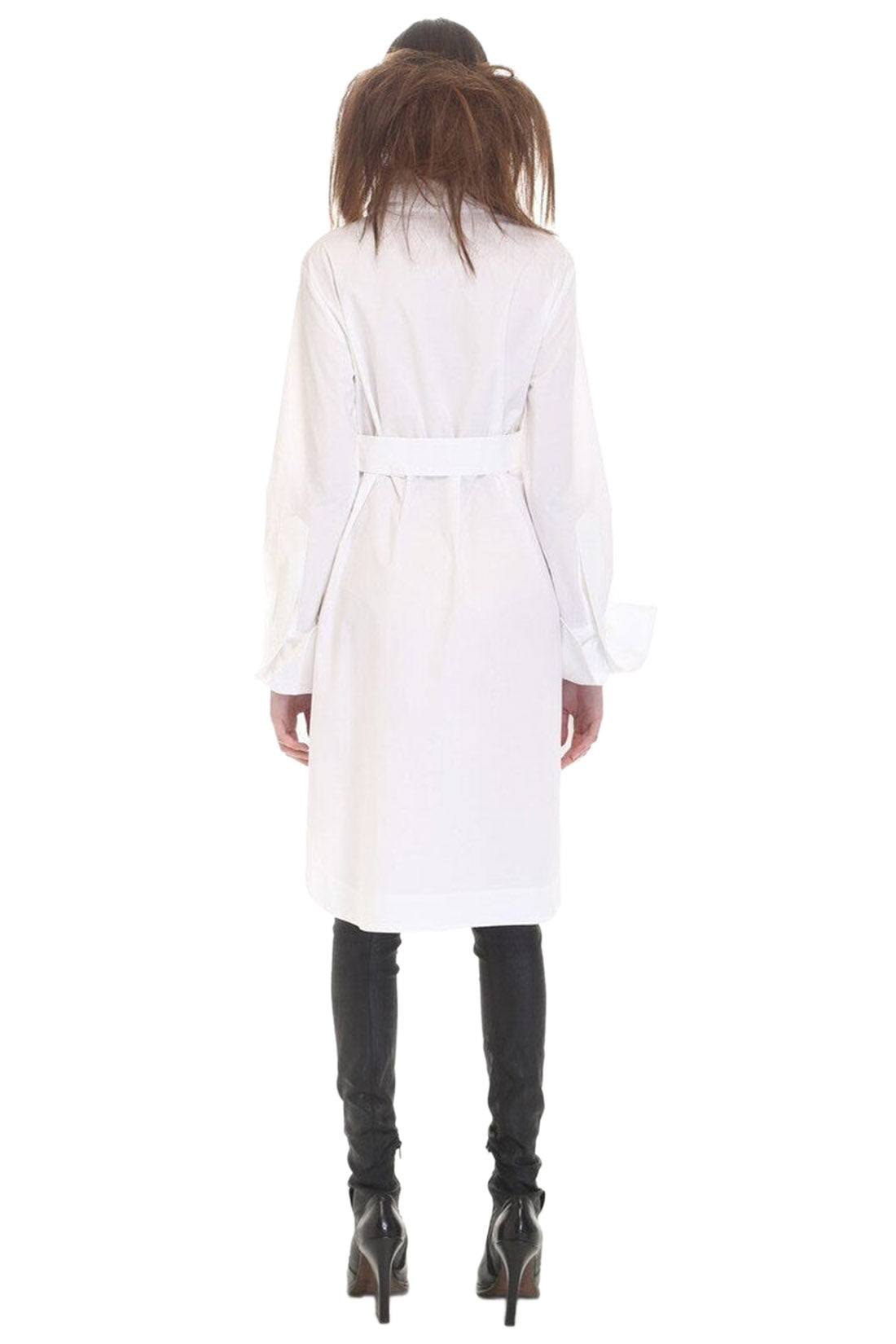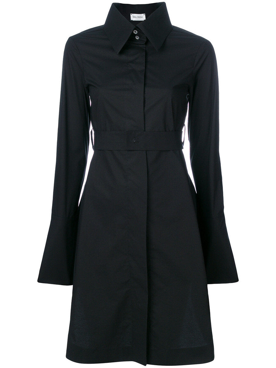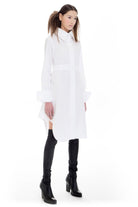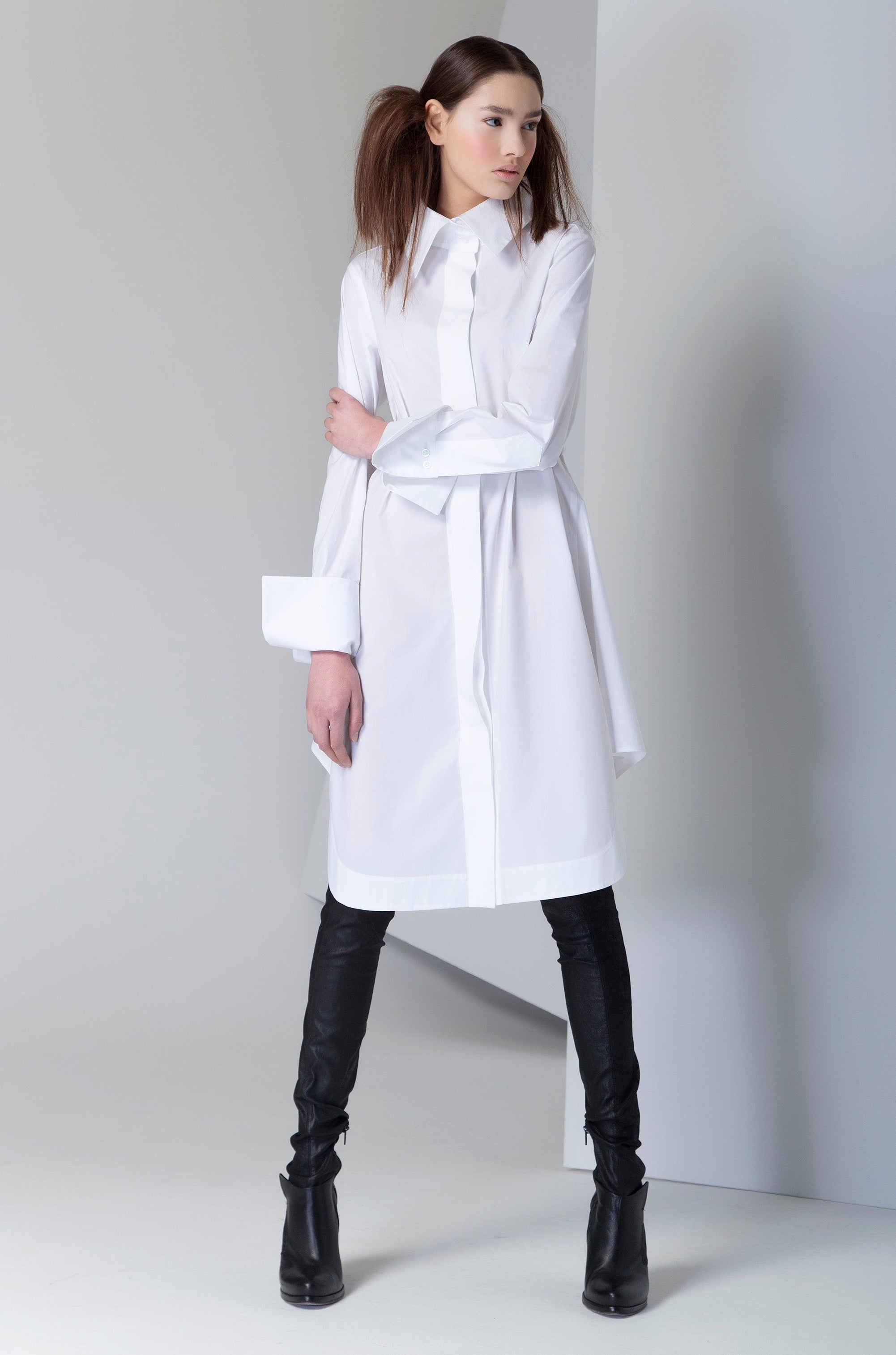 STRETCH COTTON POPLIN SHIRT-DRESS WITH LONG SLEEVES, FLARED FROM THE WAIST DOWN, DISTINCTIVE CUFFS AND GIANT COLLAR. WAIST BELT.