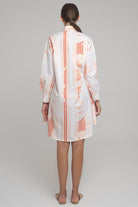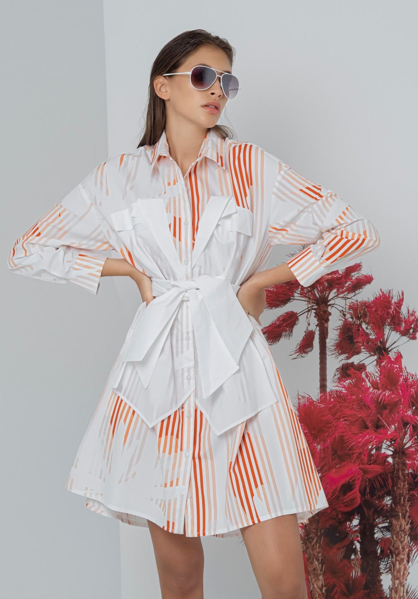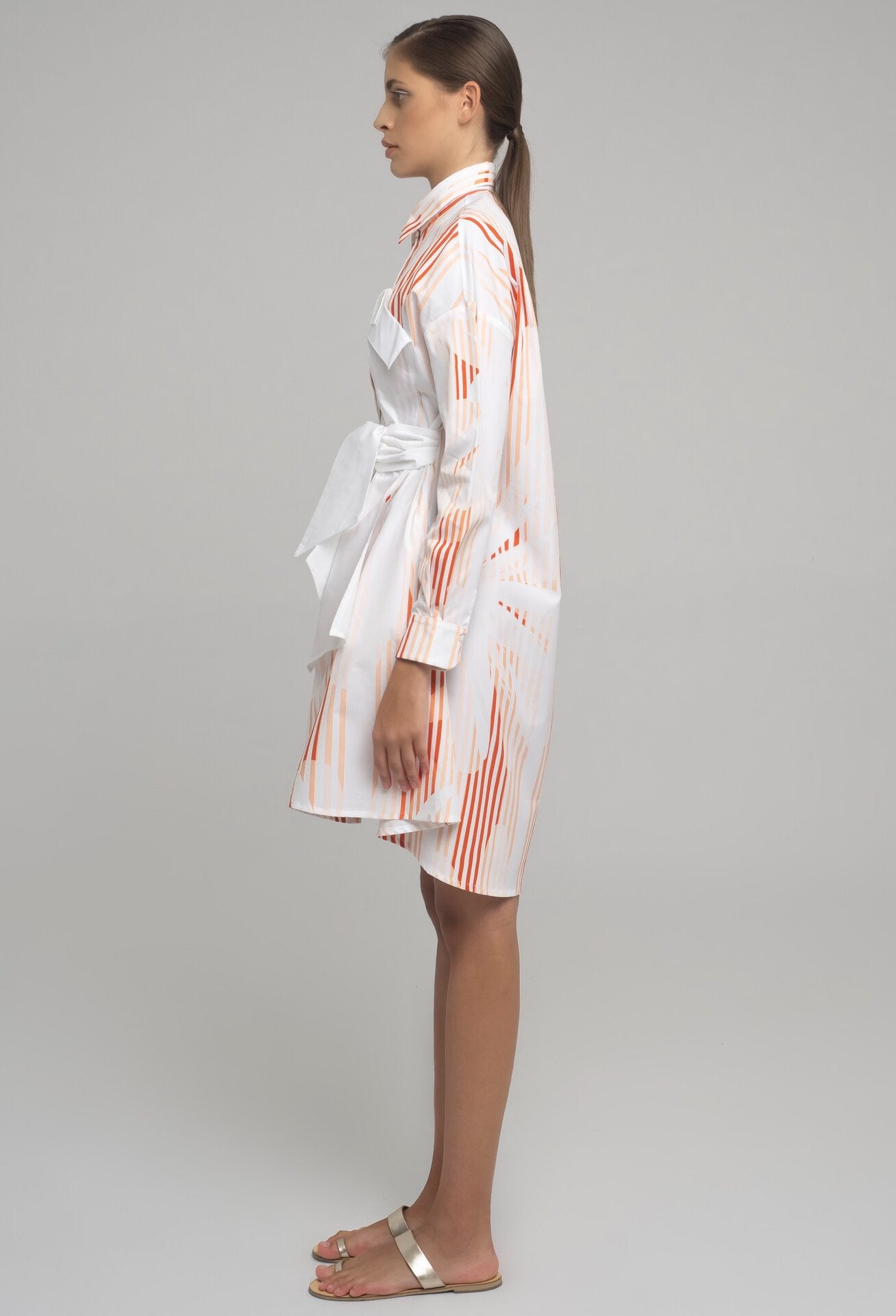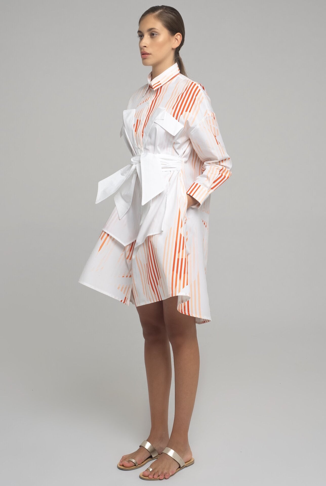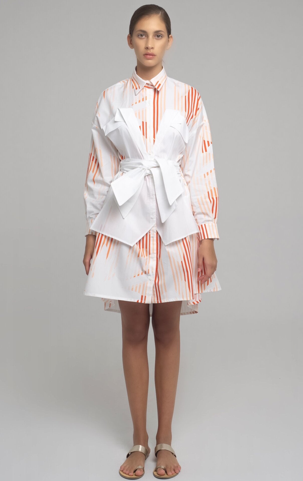 SHORT COTTON POPLIN SHIRT-DRESS WITH LONG SLEEVES AND BOW APPLICATION IN CONTRASTING FABRIC. THE BELT CAN BE TIED AT EITHER FRON OR BEHIND.