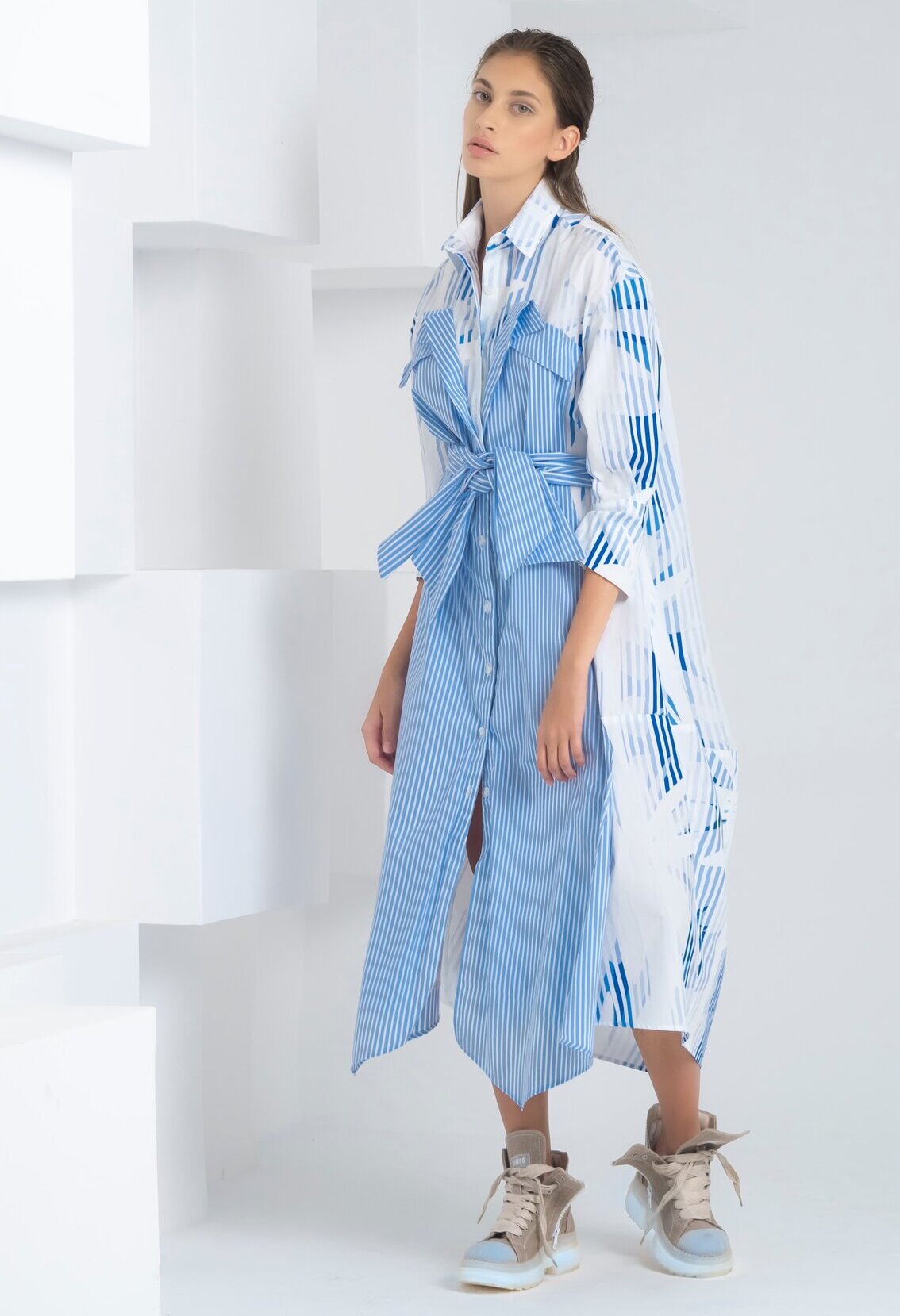 LONG COTTON POPLIN DRESS WITH LONG SLEEVES AND BOW APPLICATION IN CONTRASTING FABRICS. THE BELT CAN BE TIED AT THE EITHER THE FRONT OR BACK SIDES.