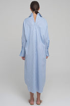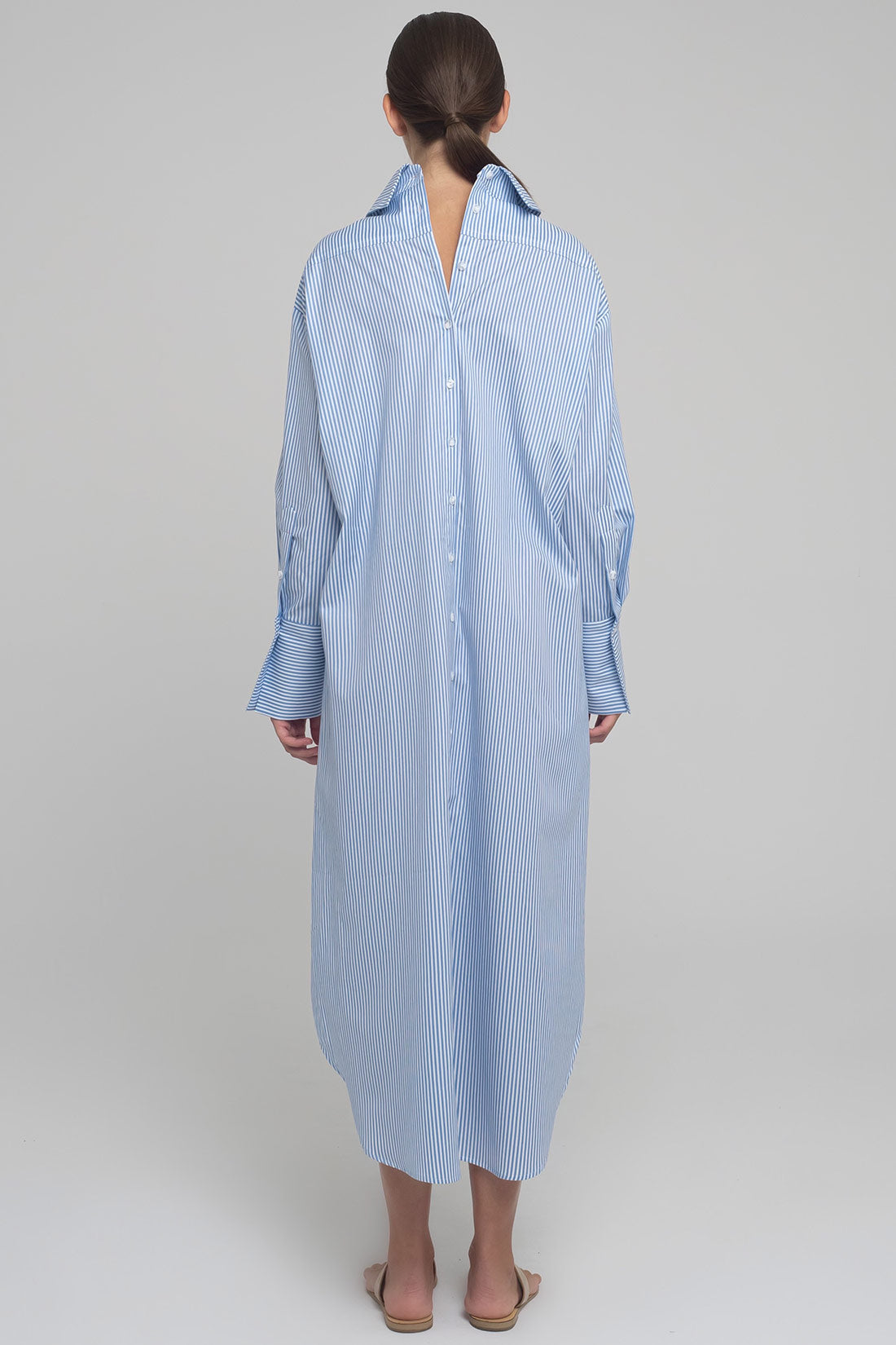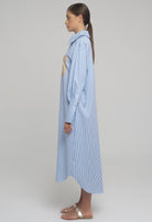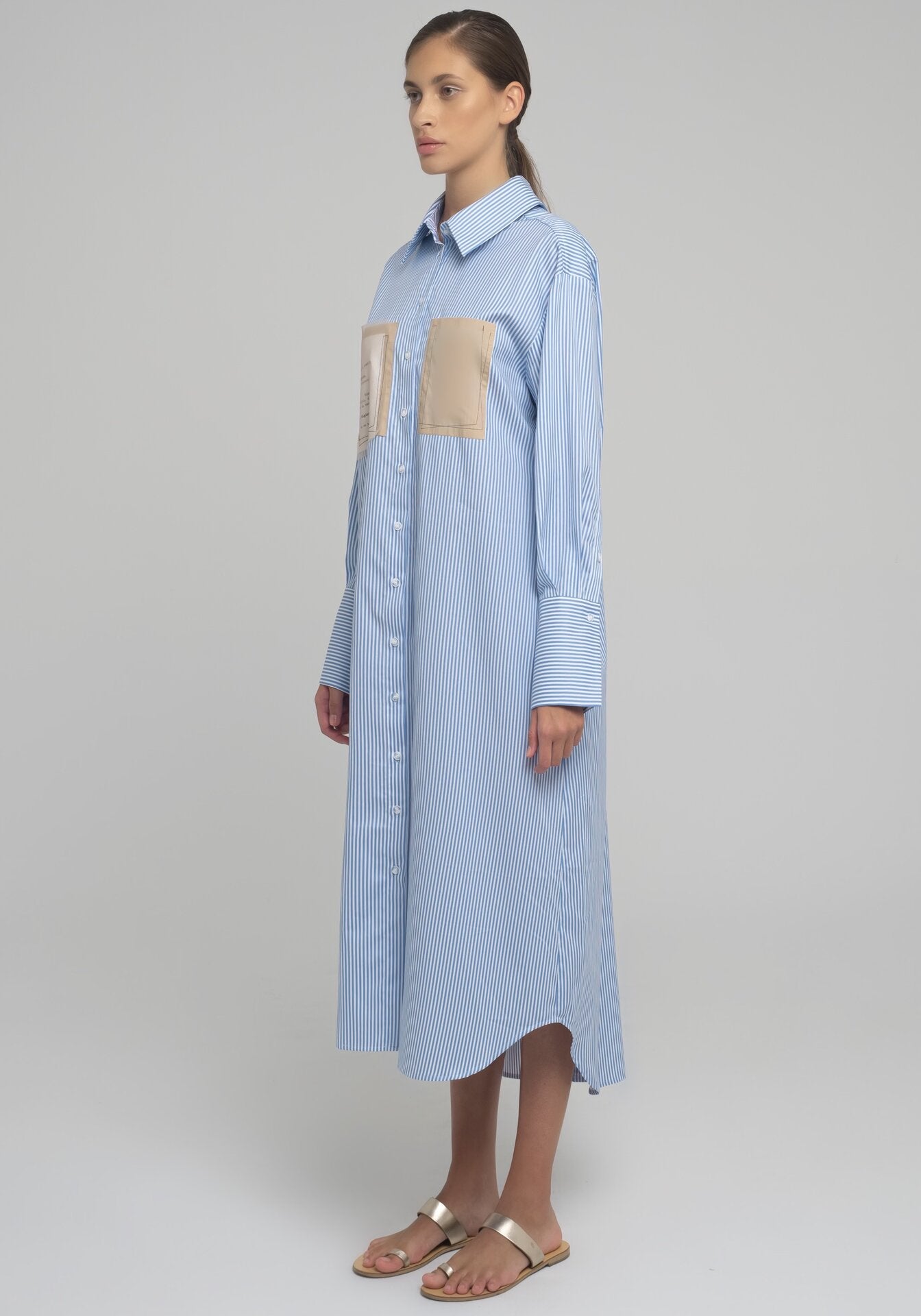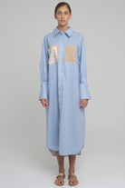 LONG, STRIPED COTTON SHIRT-DRESS WITH OPENING AT THE FRONT AND BACK. PATTERNED POCKETS ON FRONT SIDE.