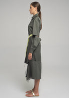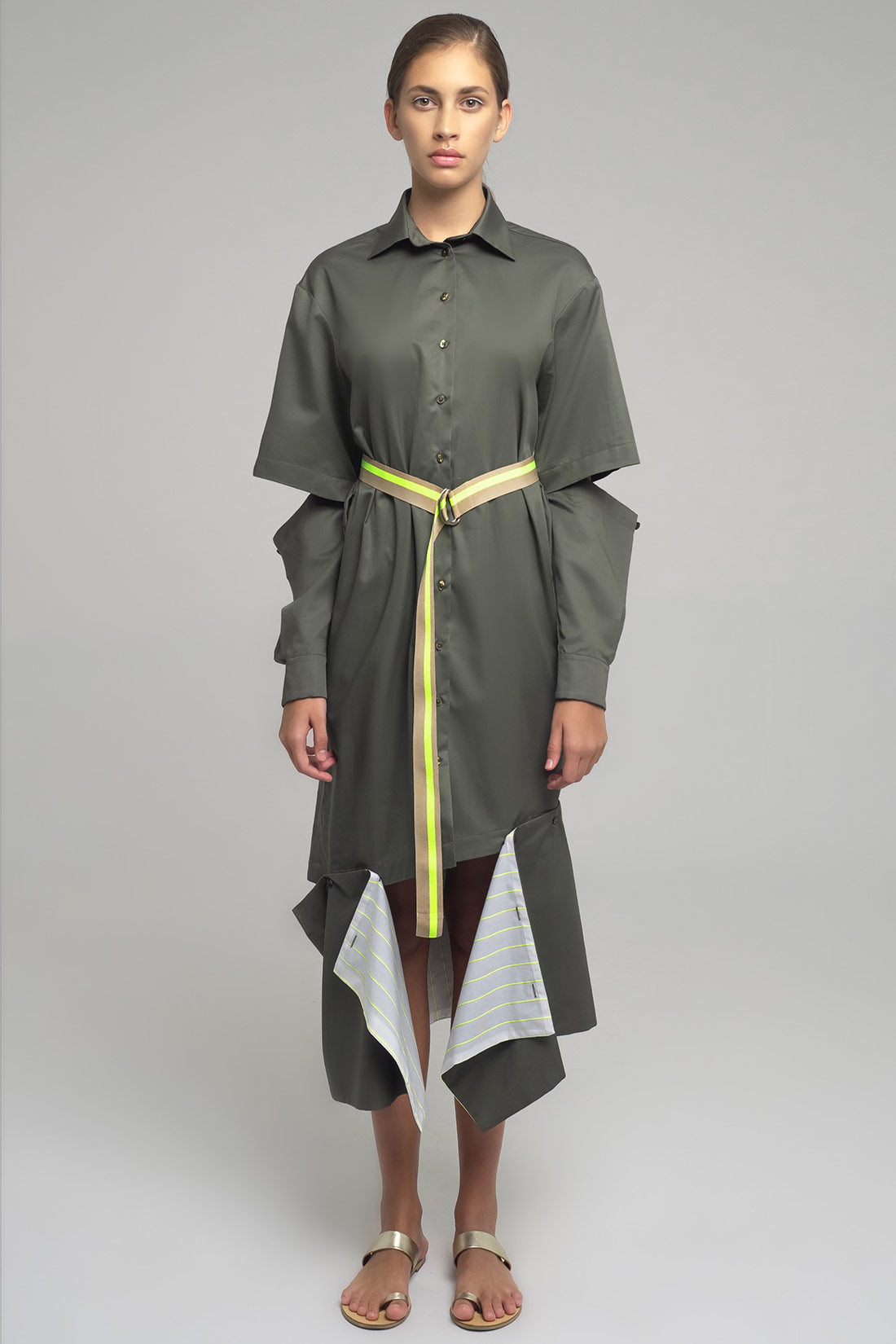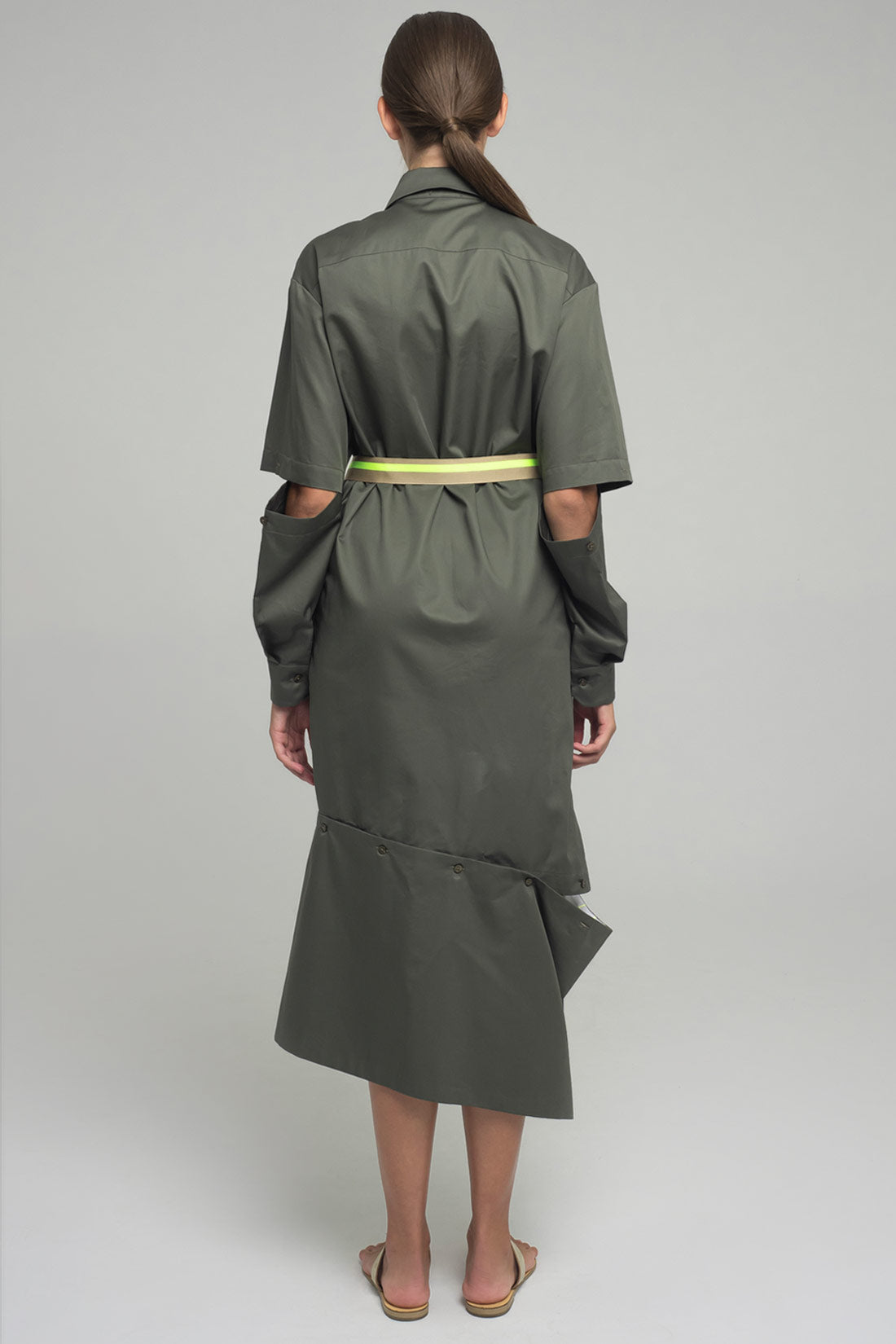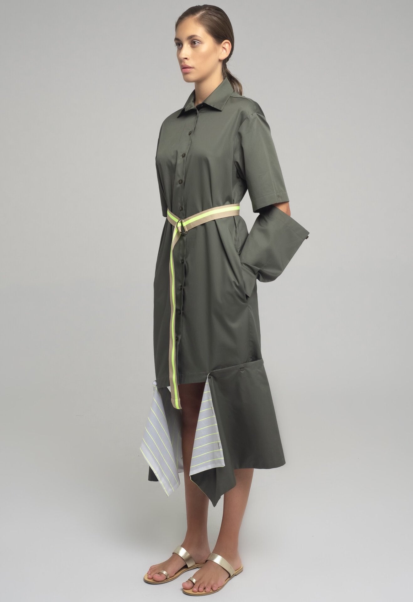 Dress with detachable buttoned panel that provides transformable length. Classic open front collar, matching buttons, long half-cut sleeves. Belt included.