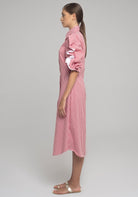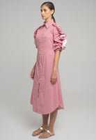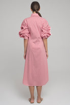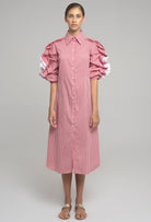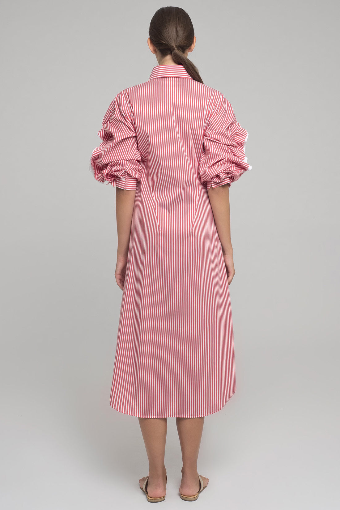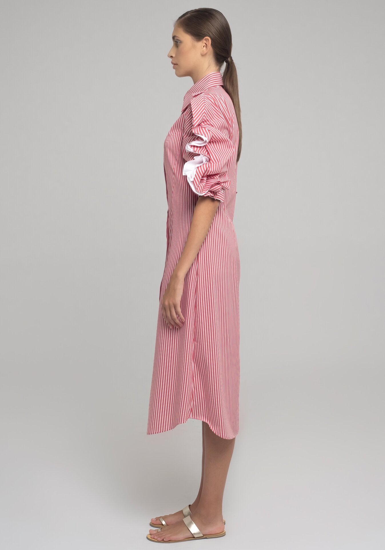 MIDI-DRESS IN STRETCH COTTON WITH CLASSIC COLLAR AND MOTHER-OF-PEARL BUTTONS. THE LONG SLEEVES HAVE A GATHERED CURL OF CONTRASTING FABRIC FROM SHOULDER TO CUFF. INTERIOR RIBBON ALLOWS THE SLEEVE TO BE CURLED AND ADJUSTED TO DIFFERENT LENGHTS.