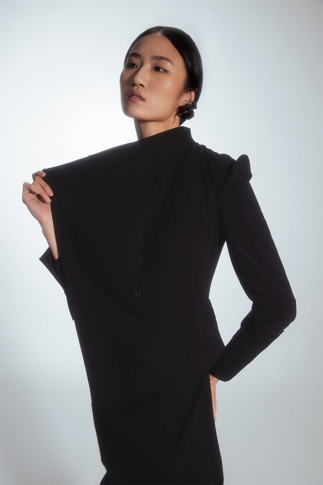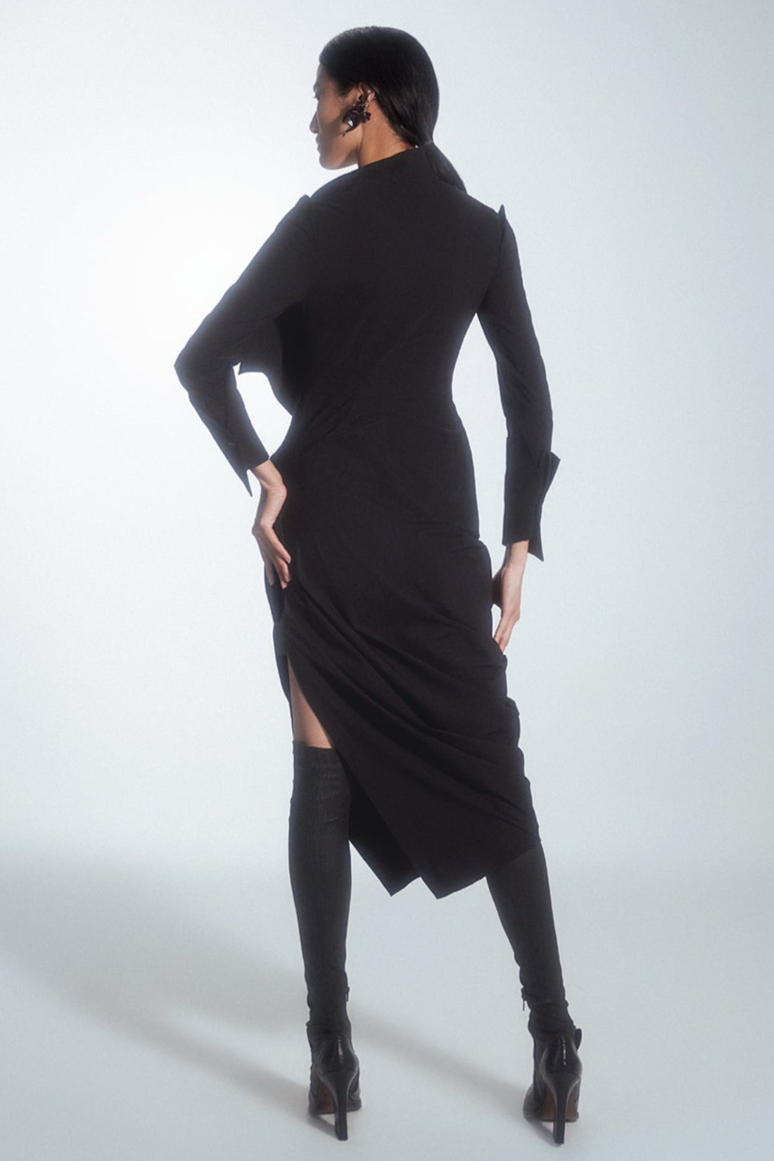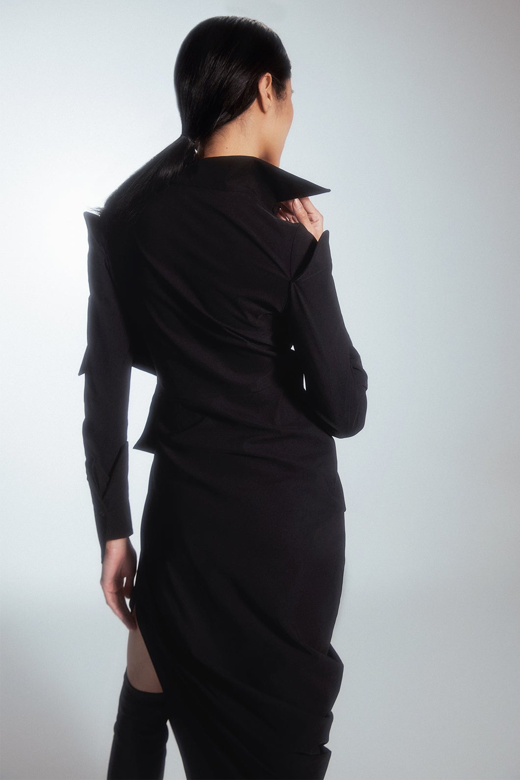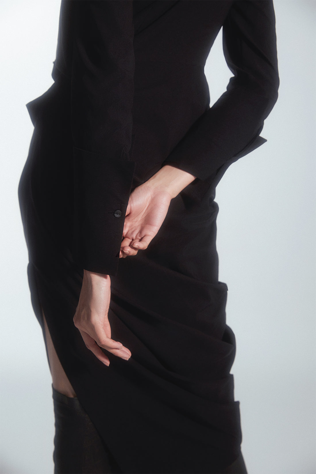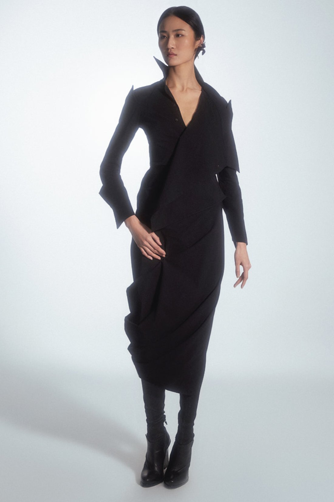 Deconstructed slim-fit dress. The front features an irregular wrap-around panel with button closure. The collar is asymmetric and customizable in various ways. Sleeves are tapered with wide cuffs. The uniqueness of this dress lies in the pointed shoulder, creating a bold and dramatic effect. The bottom part of the dress is tapered with a side slit and fabric ruching for a cascade effect.