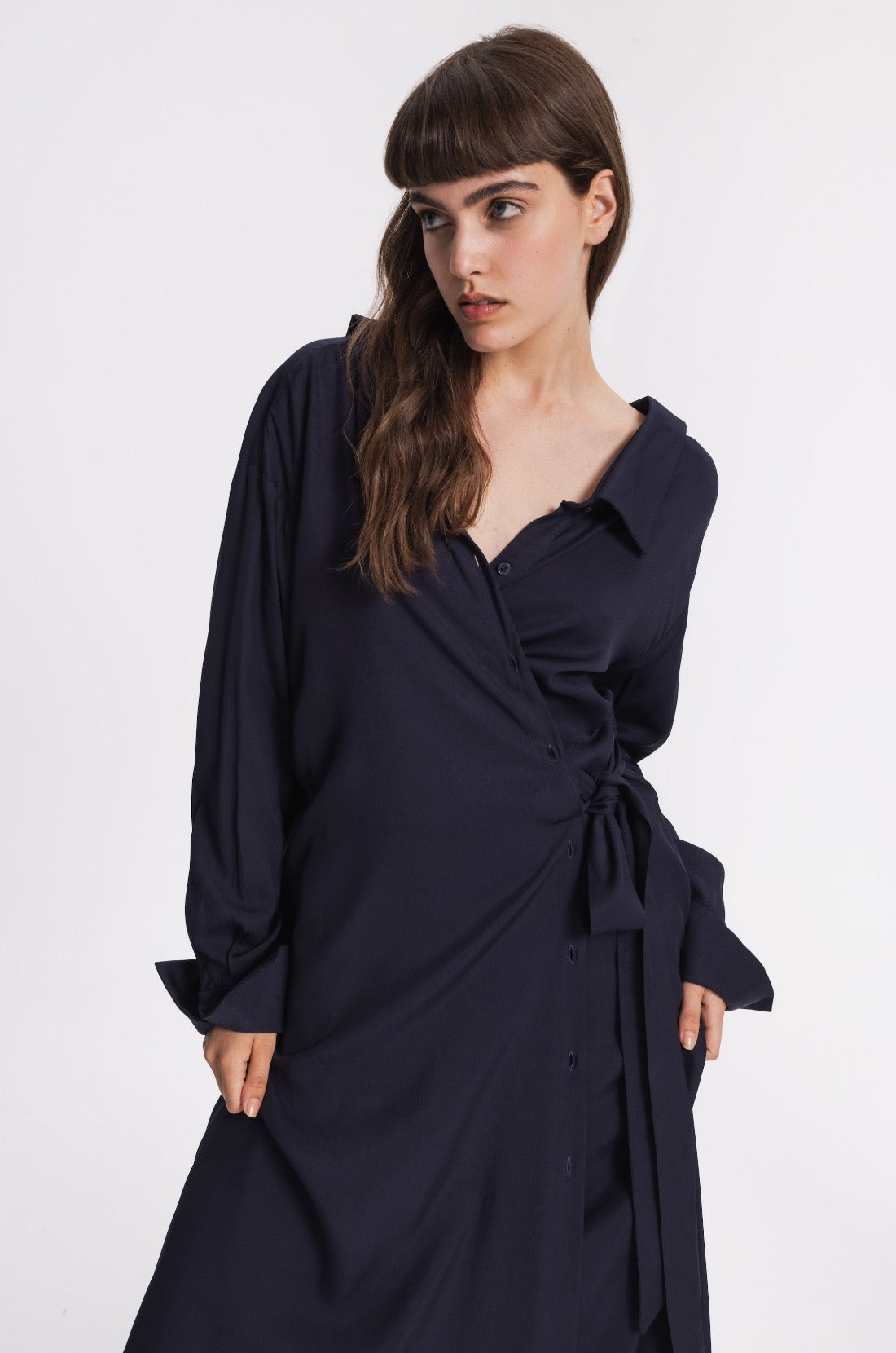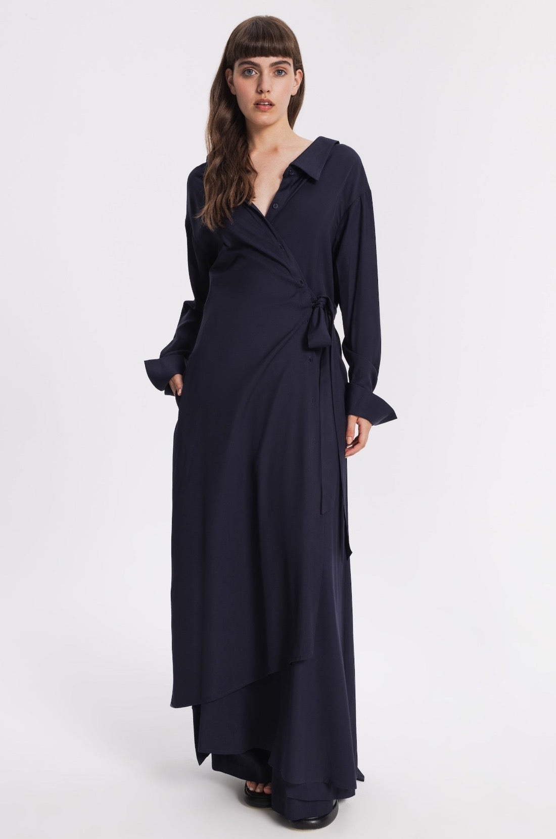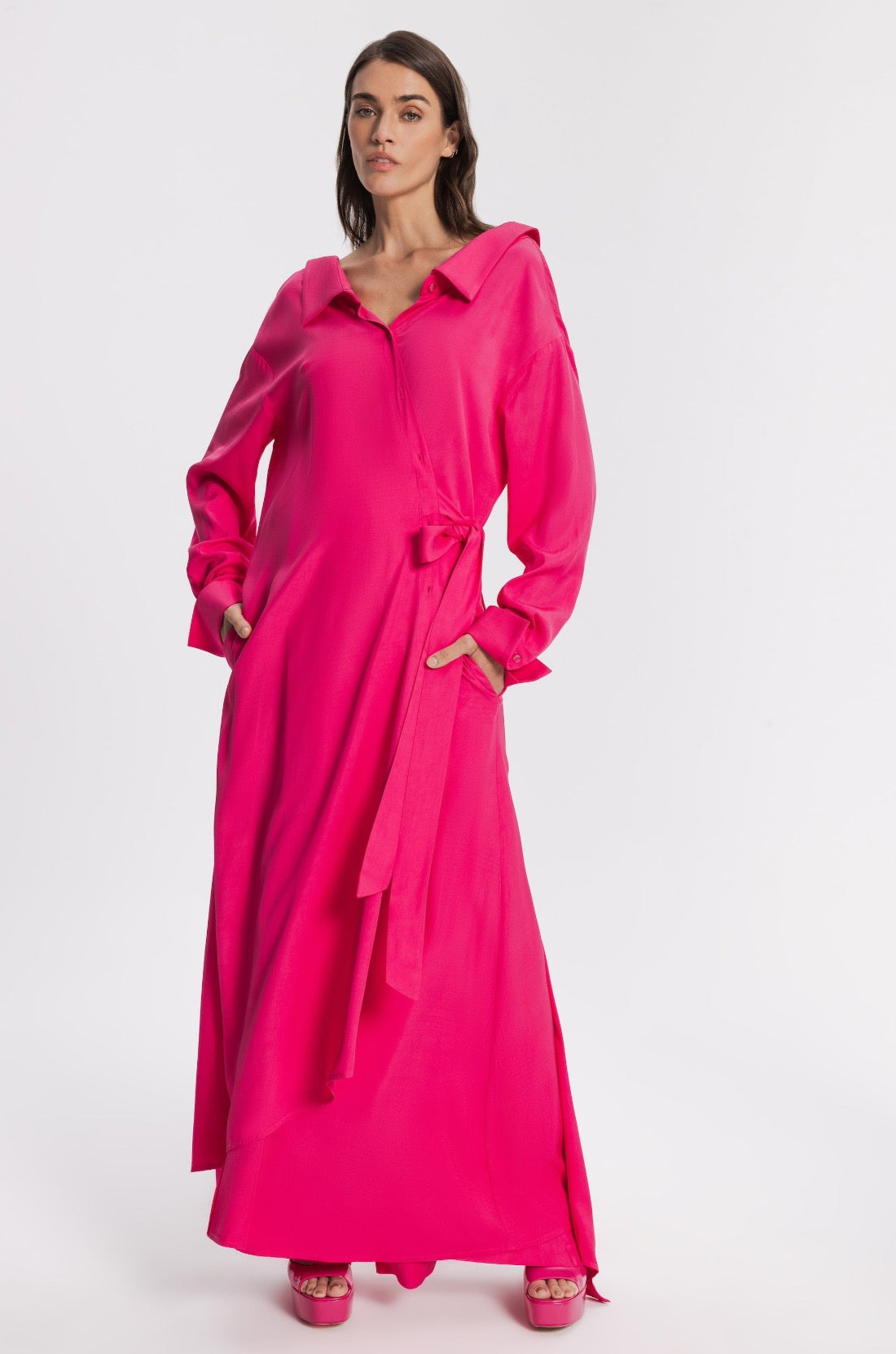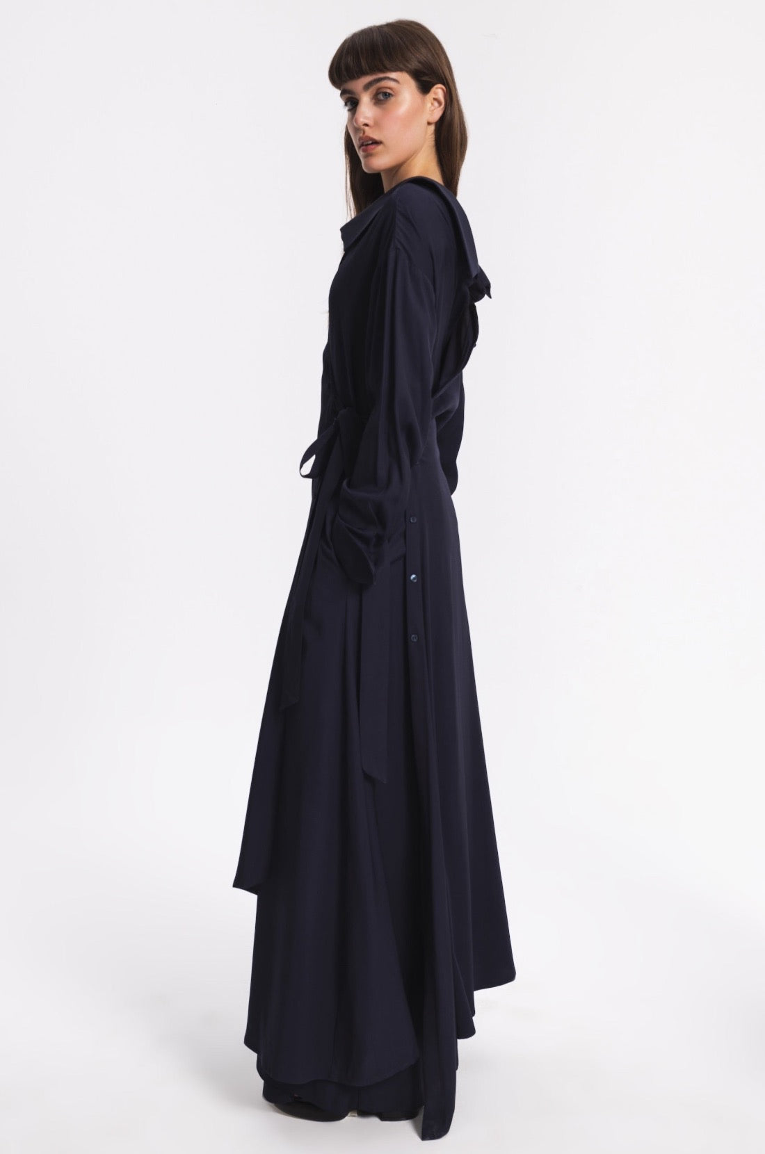 Wrap maxi dress with collar. The back is also overlapped with the v-shoulderline. Maxi cuffs , two side pockets. Fabric belt fixed on the sides. Asymmetrical hem.