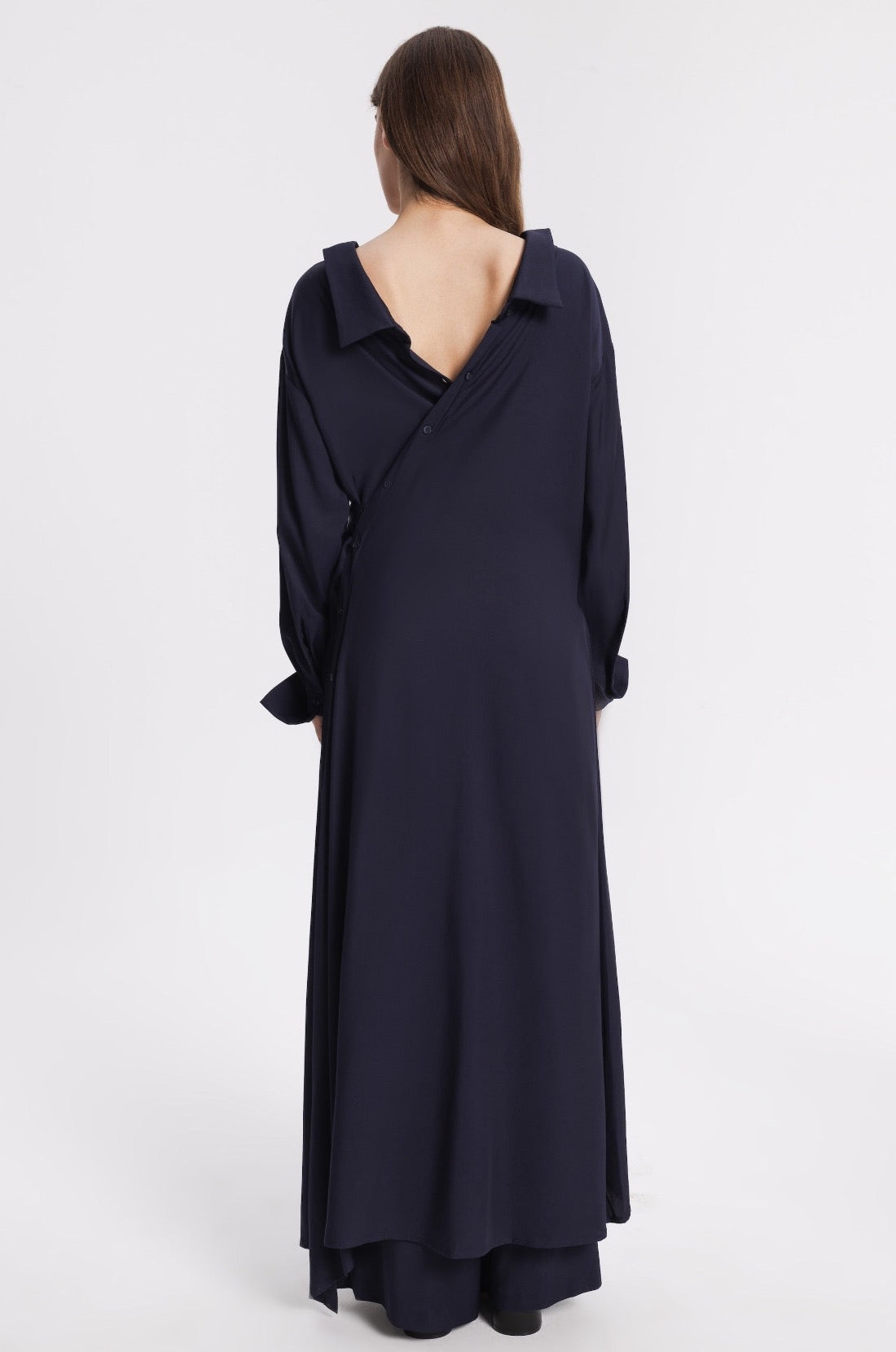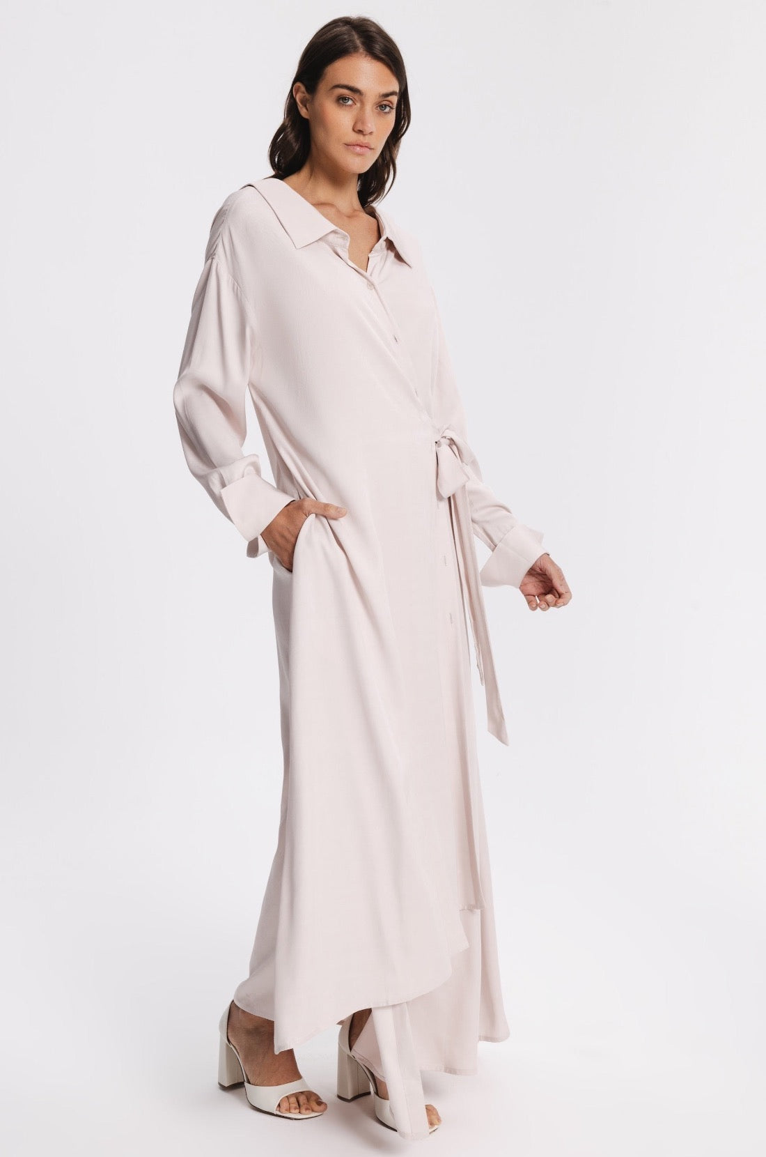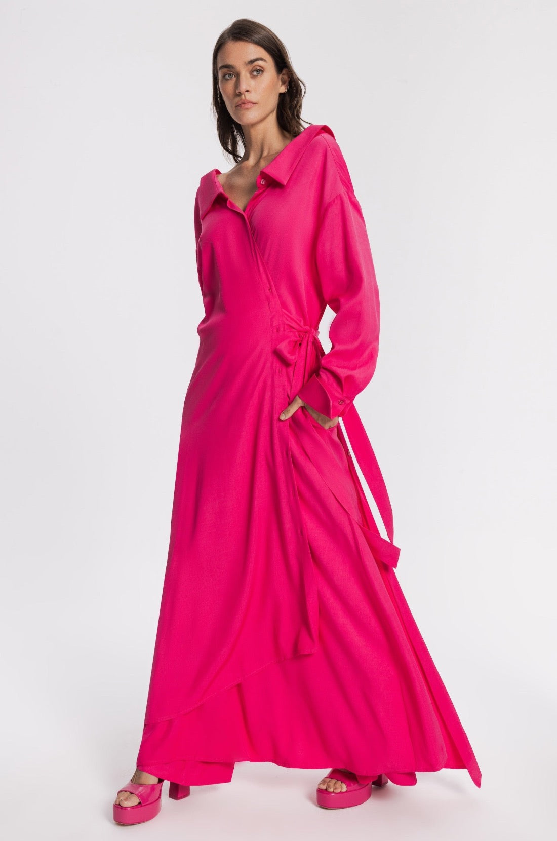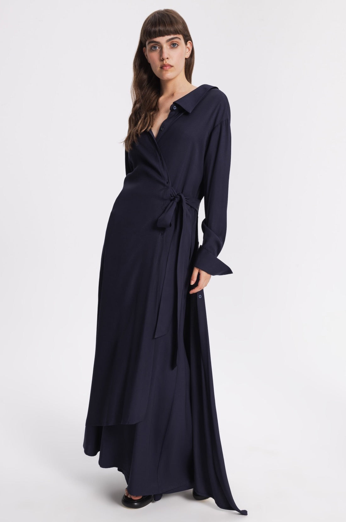 Wrap maxi dress with collar. The back is also overlapped with the v-shoulderline. Maxi cuffs , two side pockets. Fabric belt fixed on the sides. Asymmetrical hem.