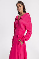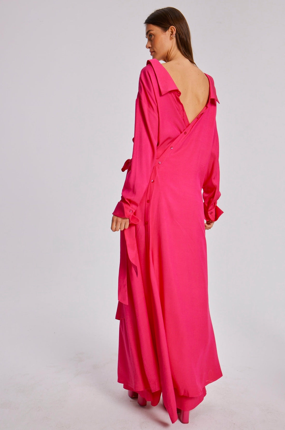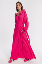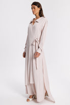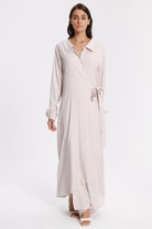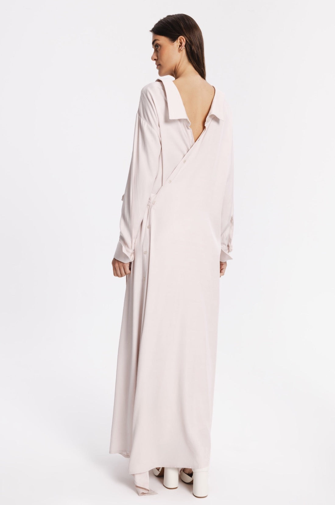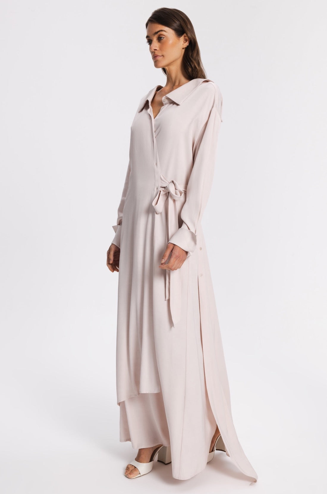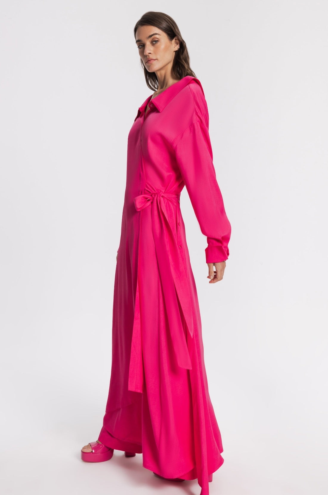 Wrap maxi dress with collar. The back is also overlapped with the v-shoulderline. Maxi cuffs , two side pockets. Fabric belt fixed on the sides. Asymmetrical hem.