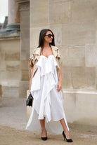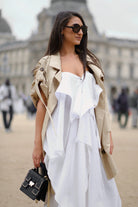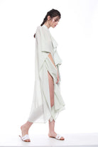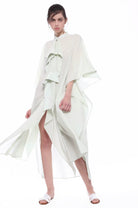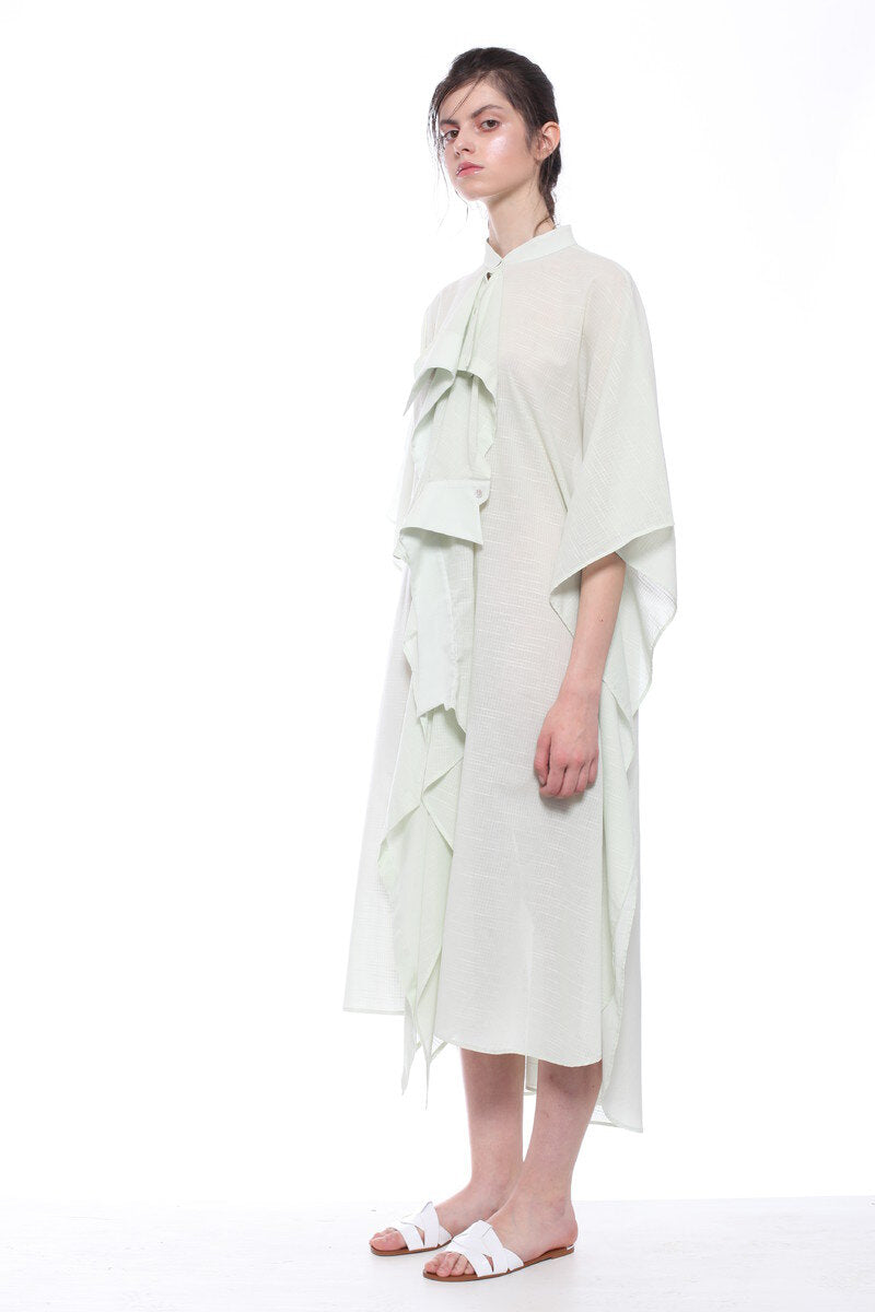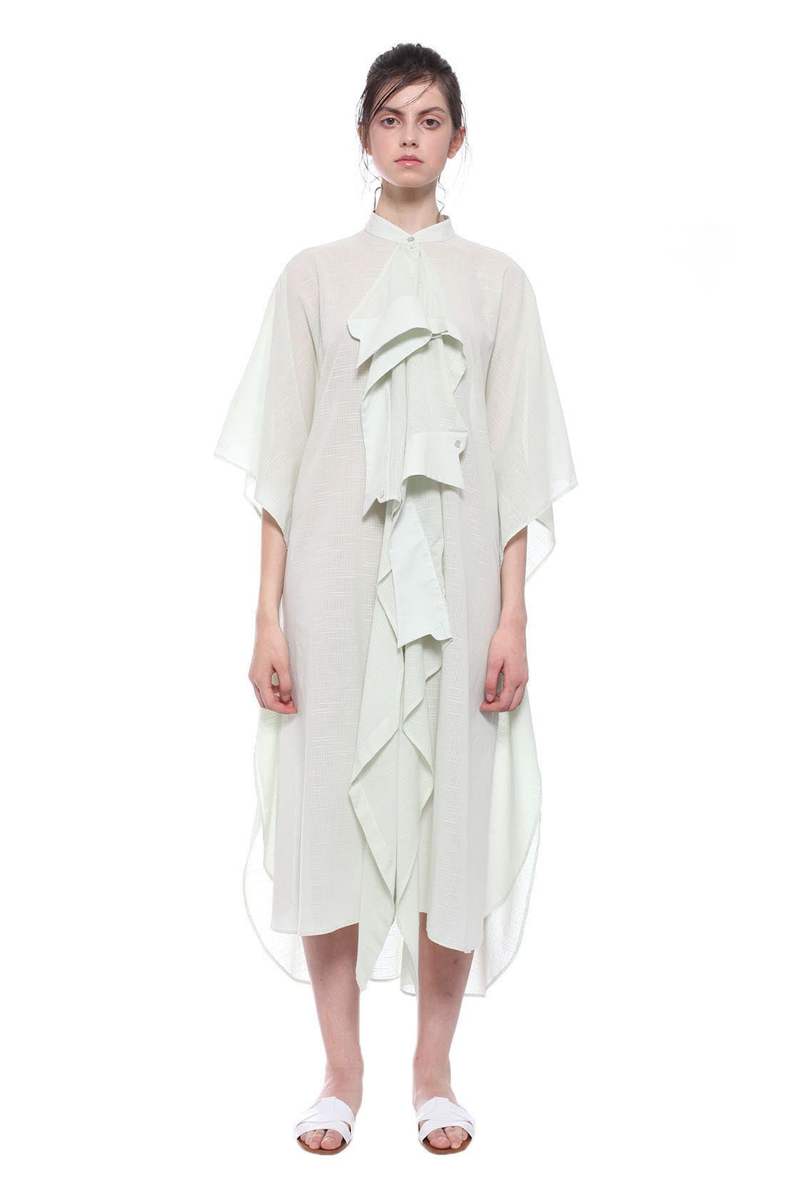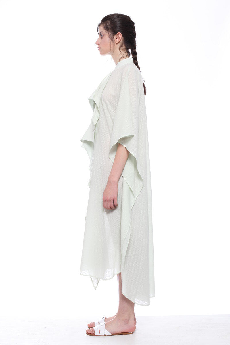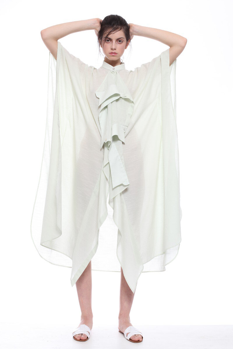 OVERSIZE SHIRT IN SHAPE OF KAFTAN, MADE IN A TRANSPARENT ORGANIC COTTON THAT GIVES A SENSE OF FREEDOM AND FRESHNESS. FRONT RIFFLES FORMED BY A COLLAR. DESIGNED TO BE WORN OVER TROUSERS, SWIMSUIT OR AS A DRESS PAIRED WITH A PETTICOAT.