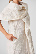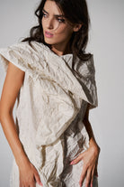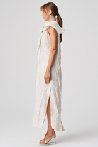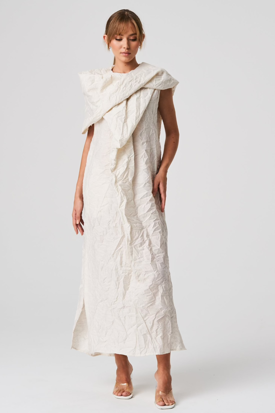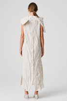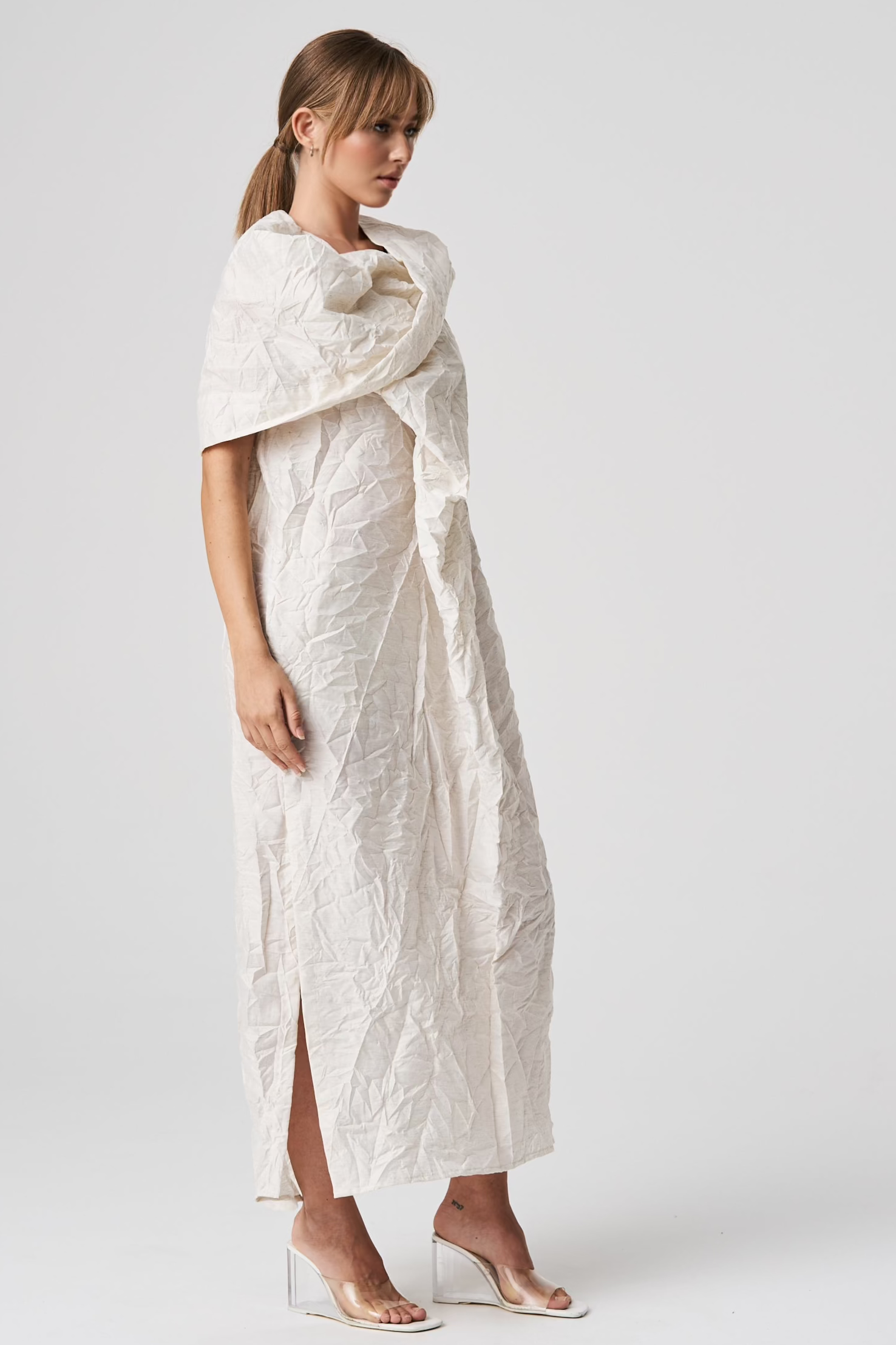 Maxi sleeveless dress in crinkled and crispy fabric, with a side slit. The unique detail of this garment is a voluminous insert on the front, at chest height that creates a scarf-like detail to style as desired. The back is simple with a small central slit at the bottom.