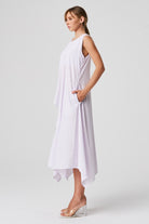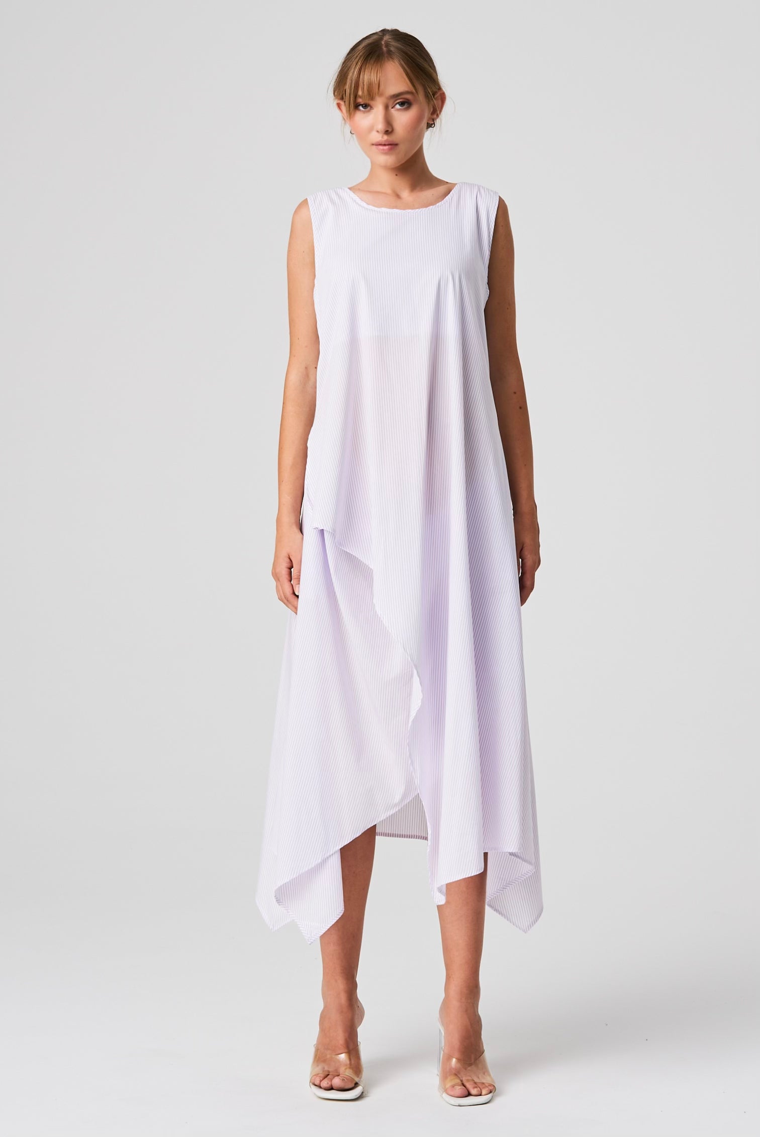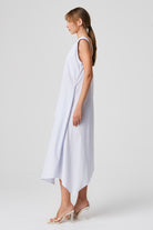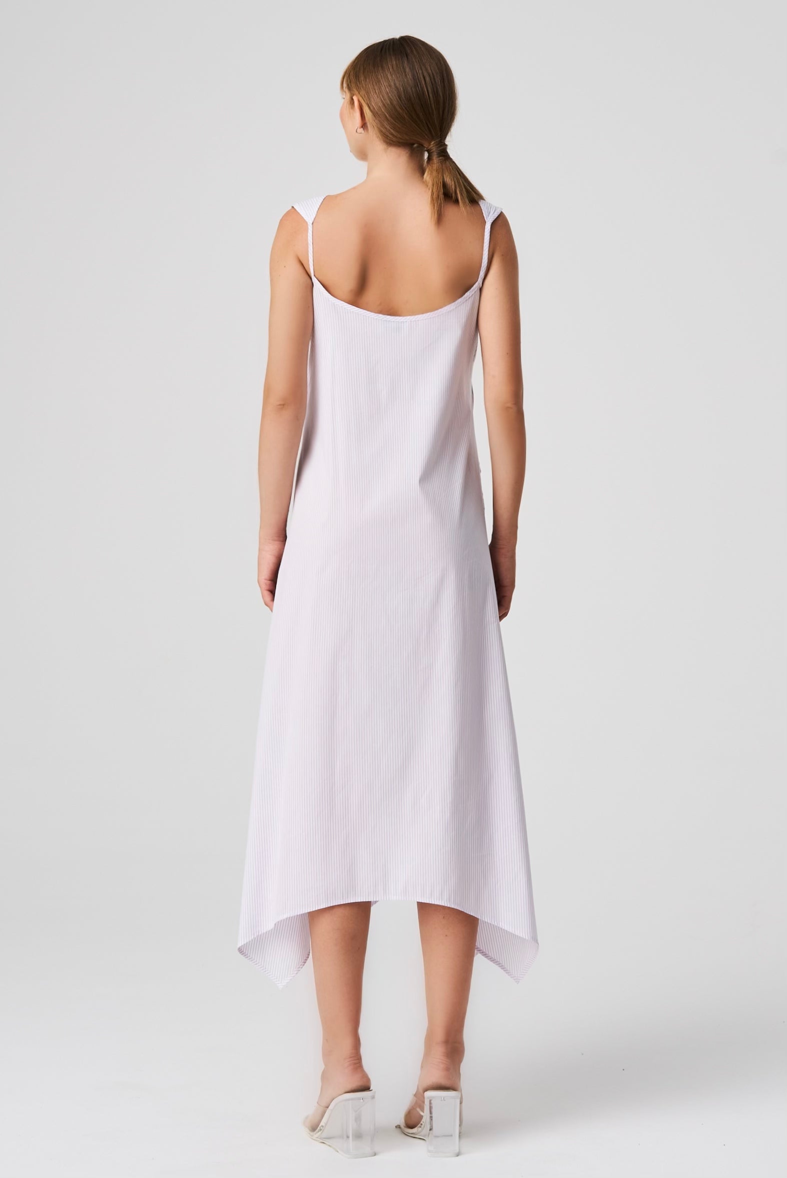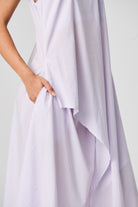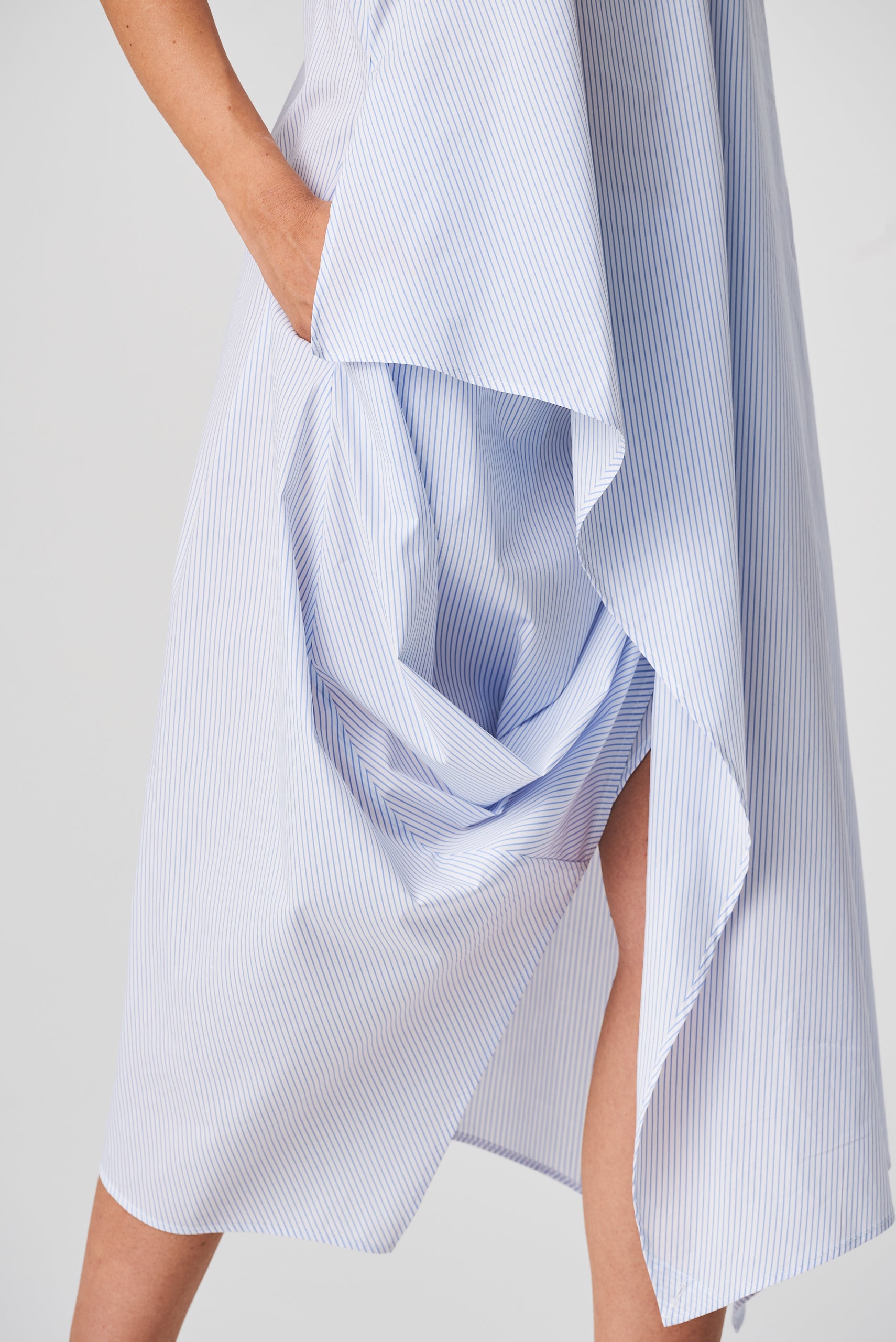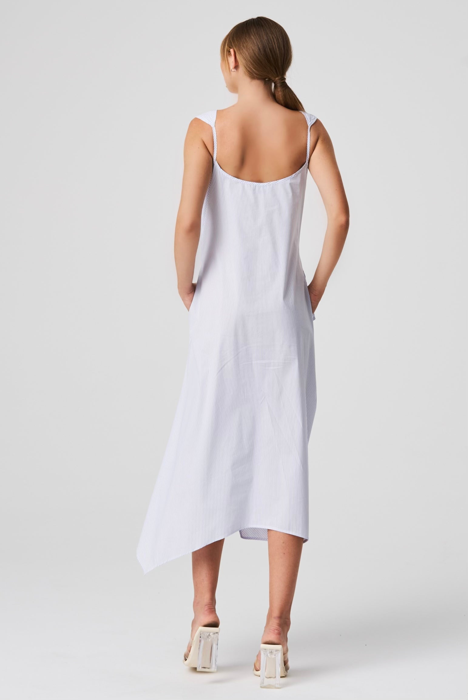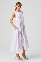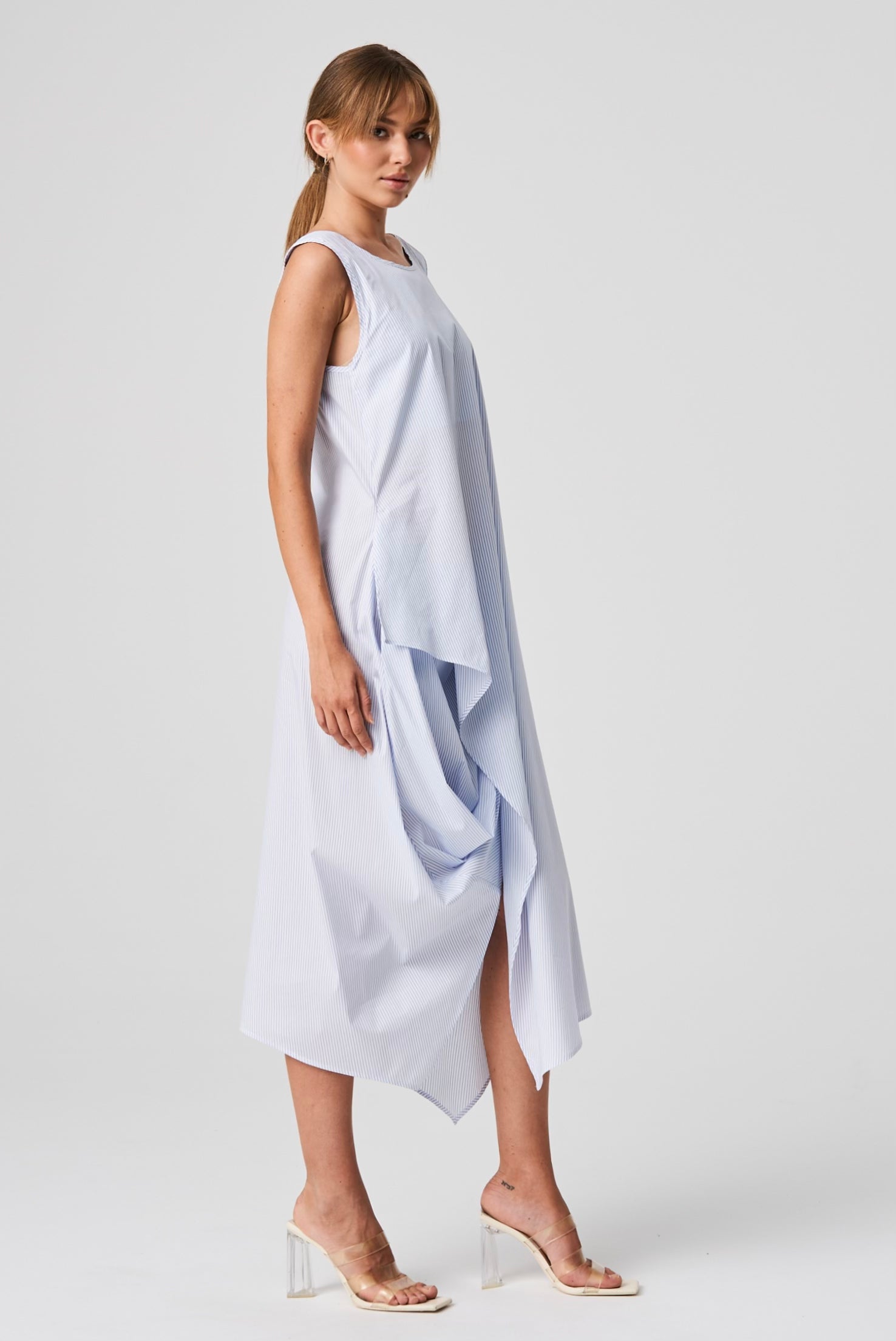 Midi dress with a flared cut from the waist down, sleeveless. The neckline is regular, while the back features a wide opening with thin straps. The unique feature of this dress is the two overlapping layers at the front. The right corner of the hem can be fastened to the inside of the opposite side with a button to create a wave effect at the front. At the junction of the layers at the bottom, a moderate slit is formed. Hidden side pockets.