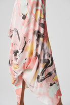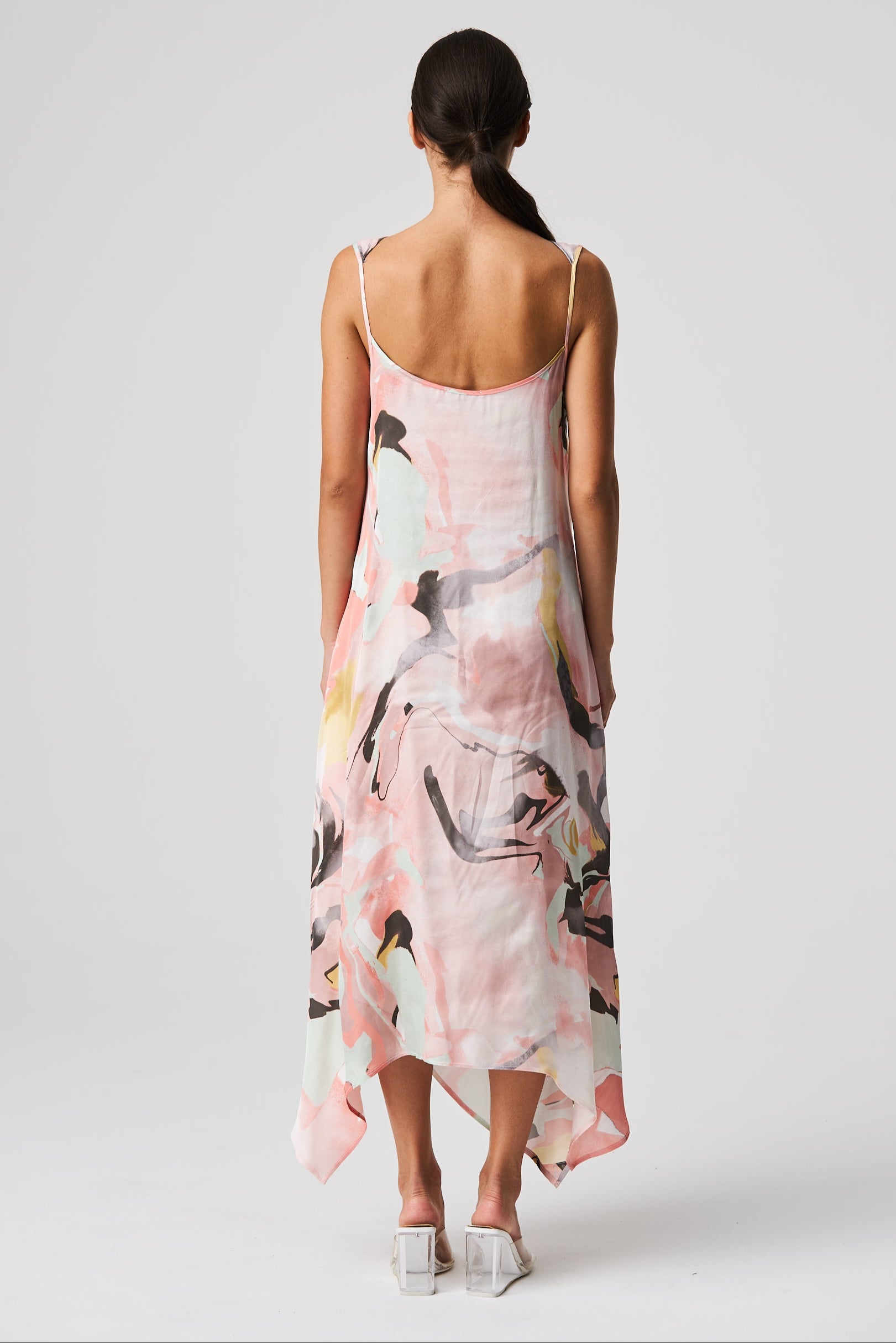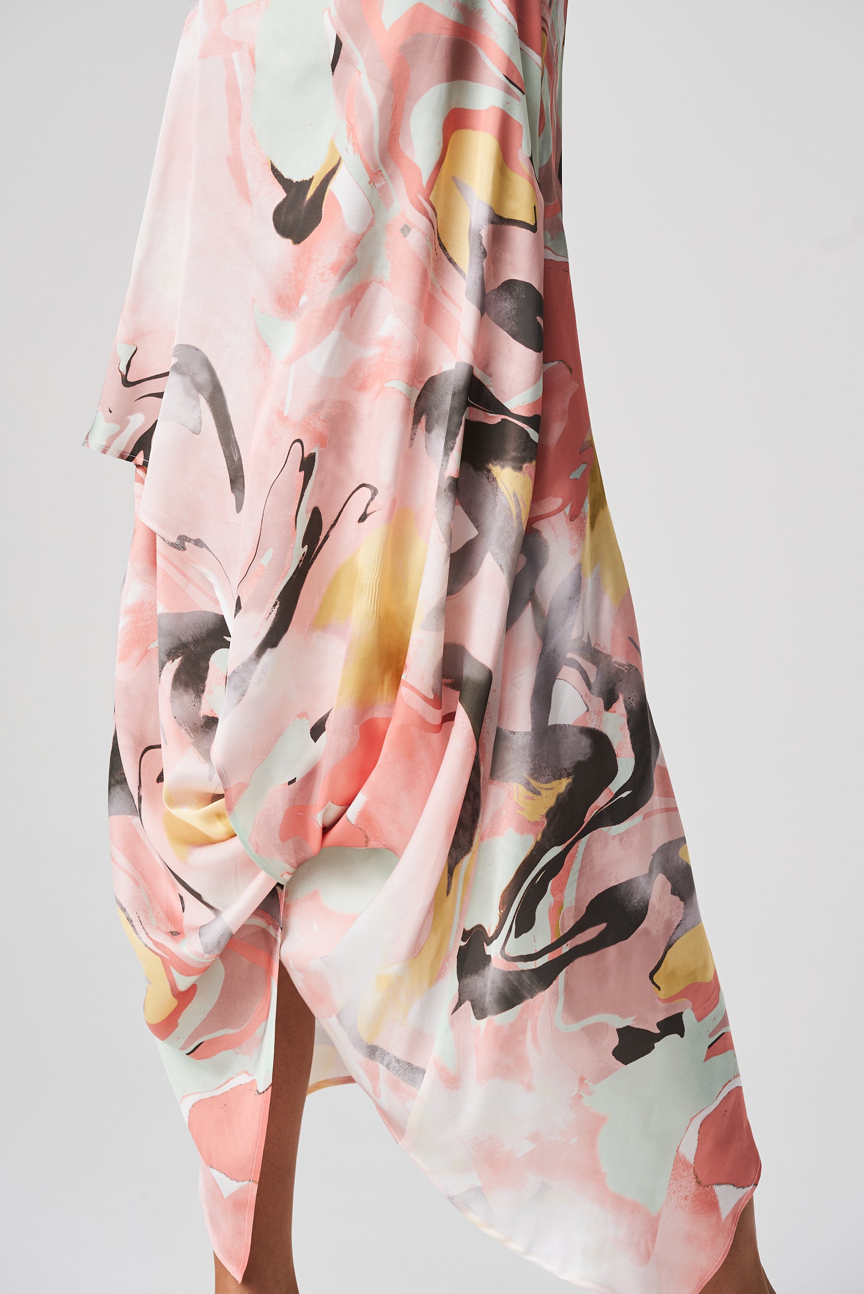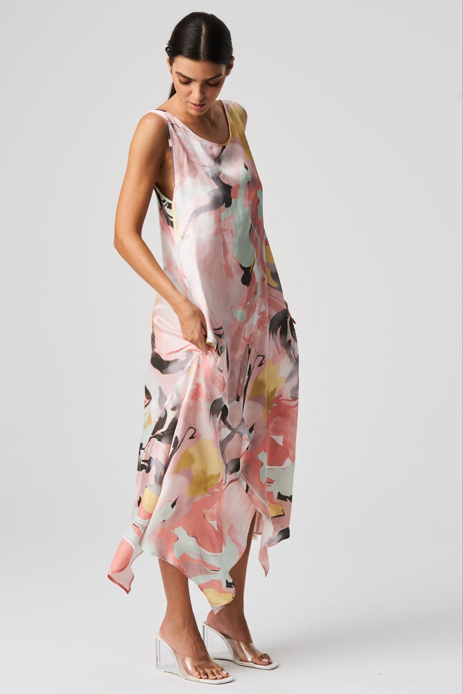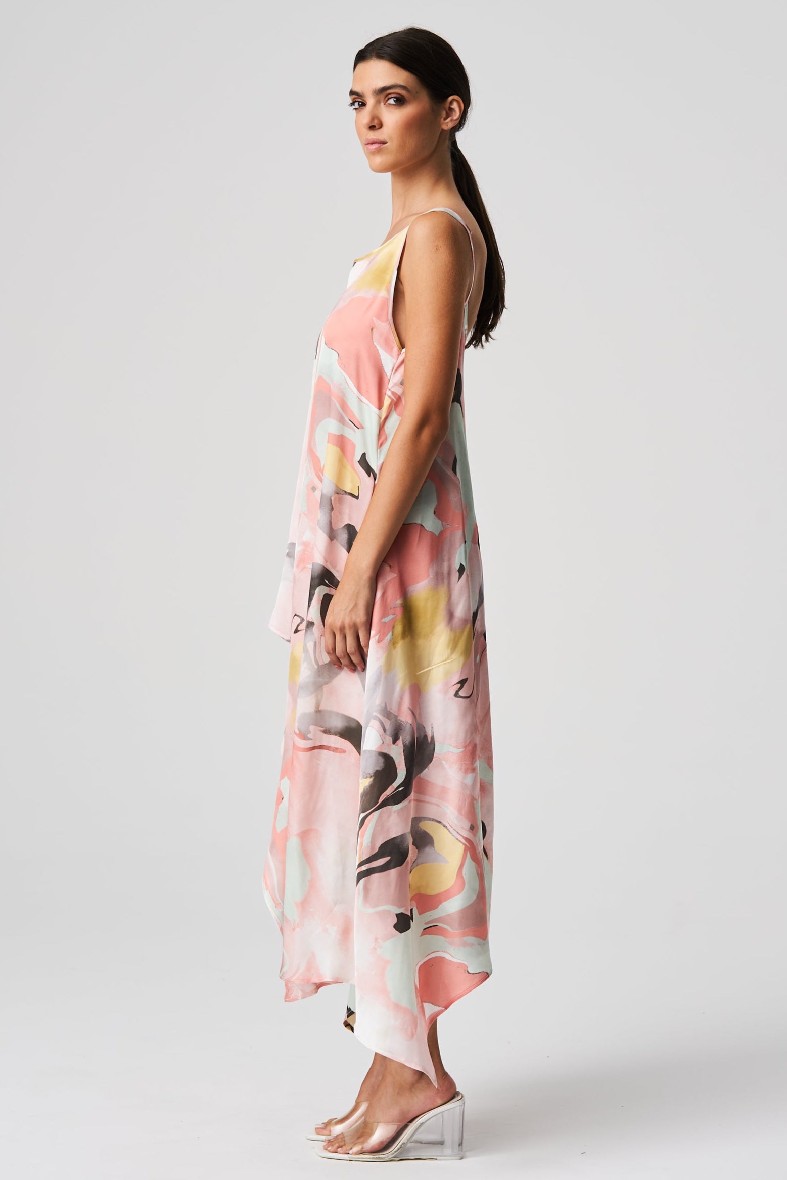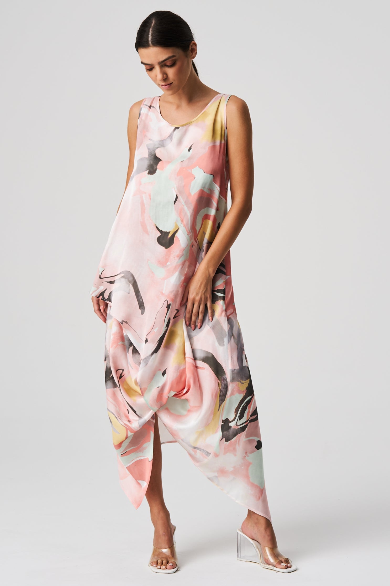 MIDI DRESS in printed fabric with a flared cut from the waist down, sleeveless. The neckline is regular, while the back features a wide opening with thin straps. The unique feature of this dress is the two overlapping layers at the front. The right corner of the hem can be fastened to the inside of the opposite side with a button to create a wave effect at the front. At the junction of the layers at the bottom, a moderate slit is formed. Hidden side pockets.