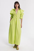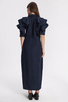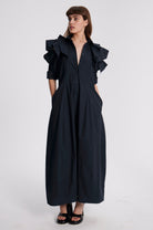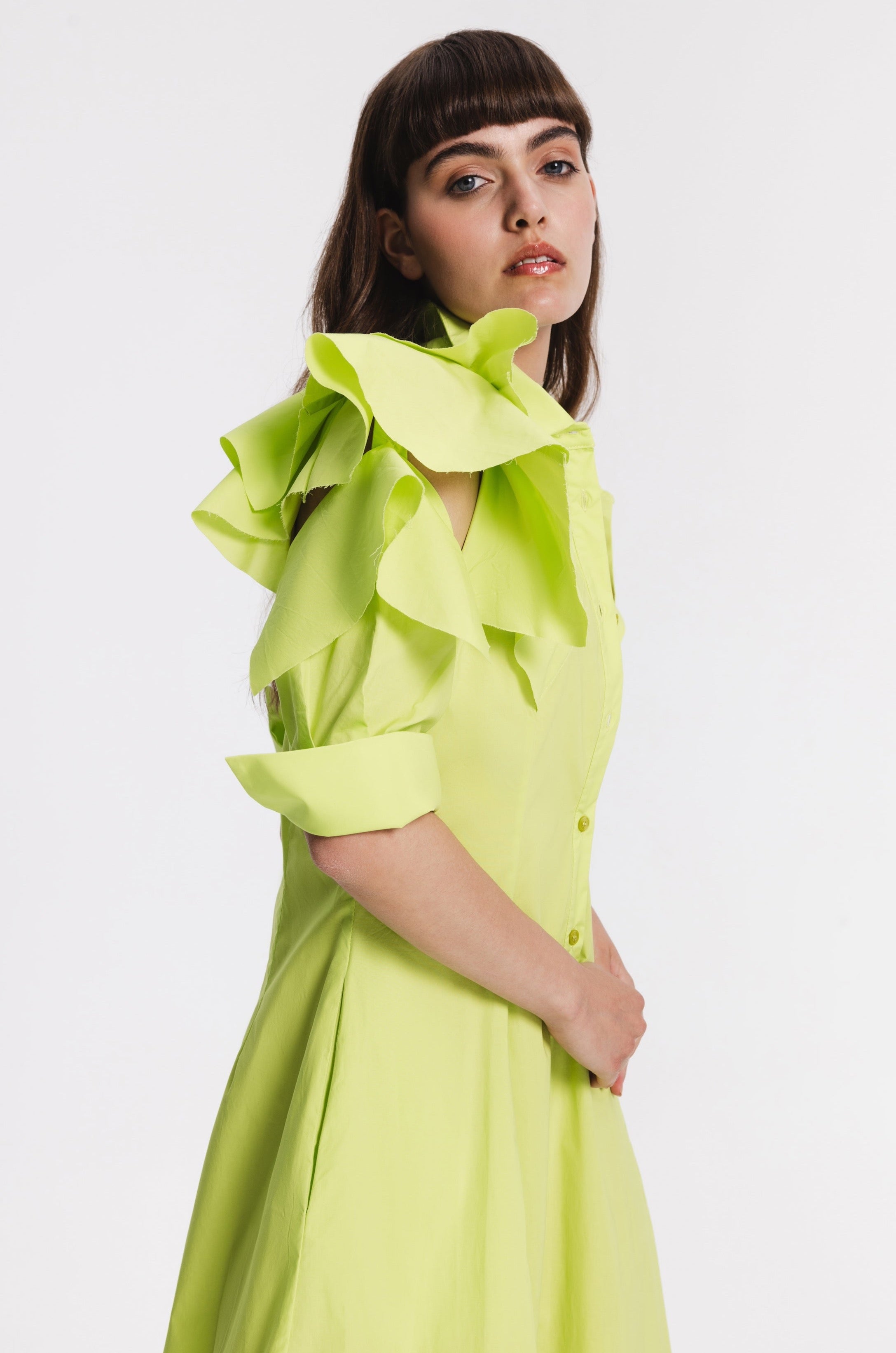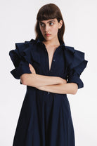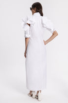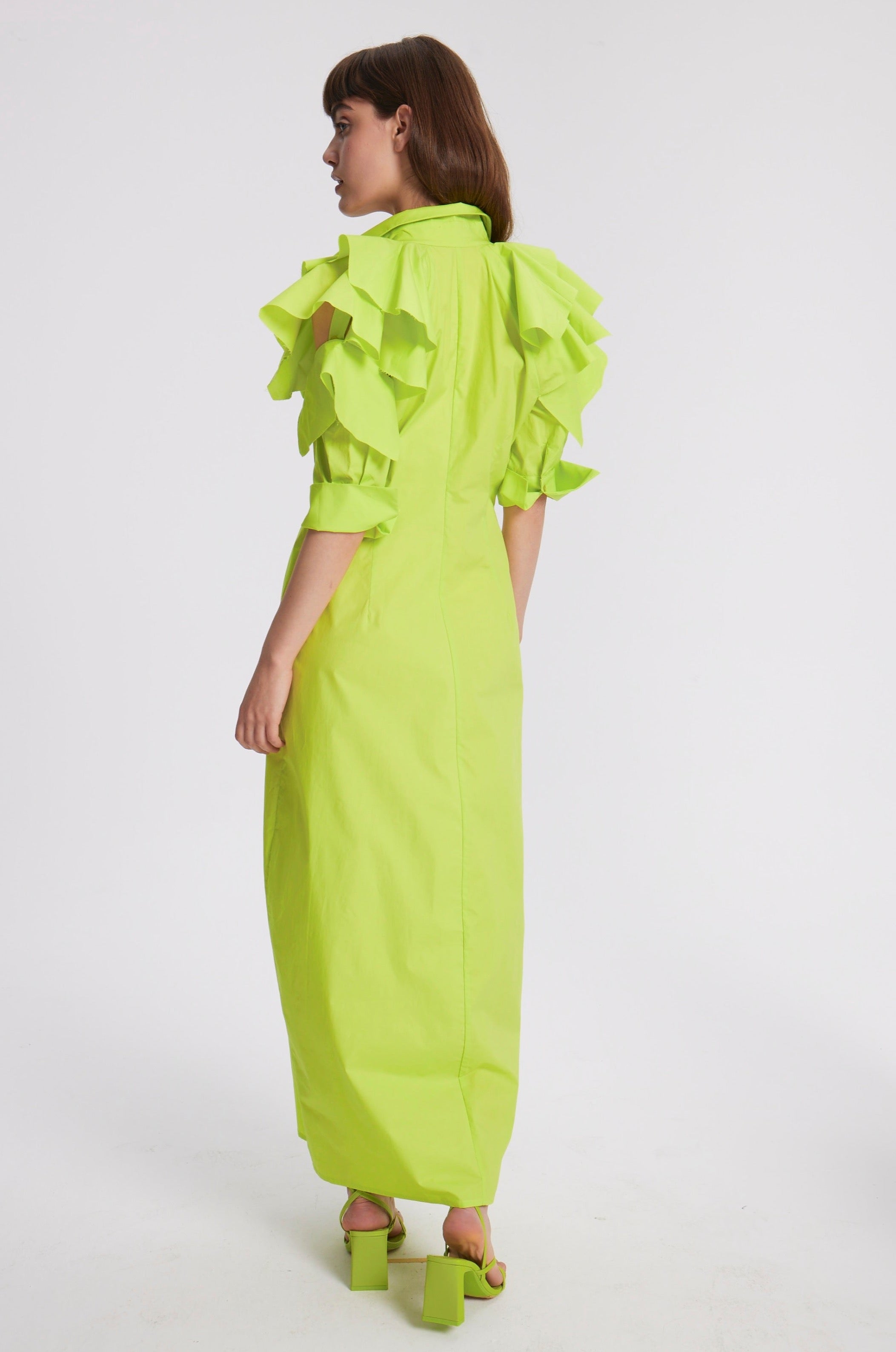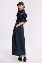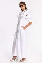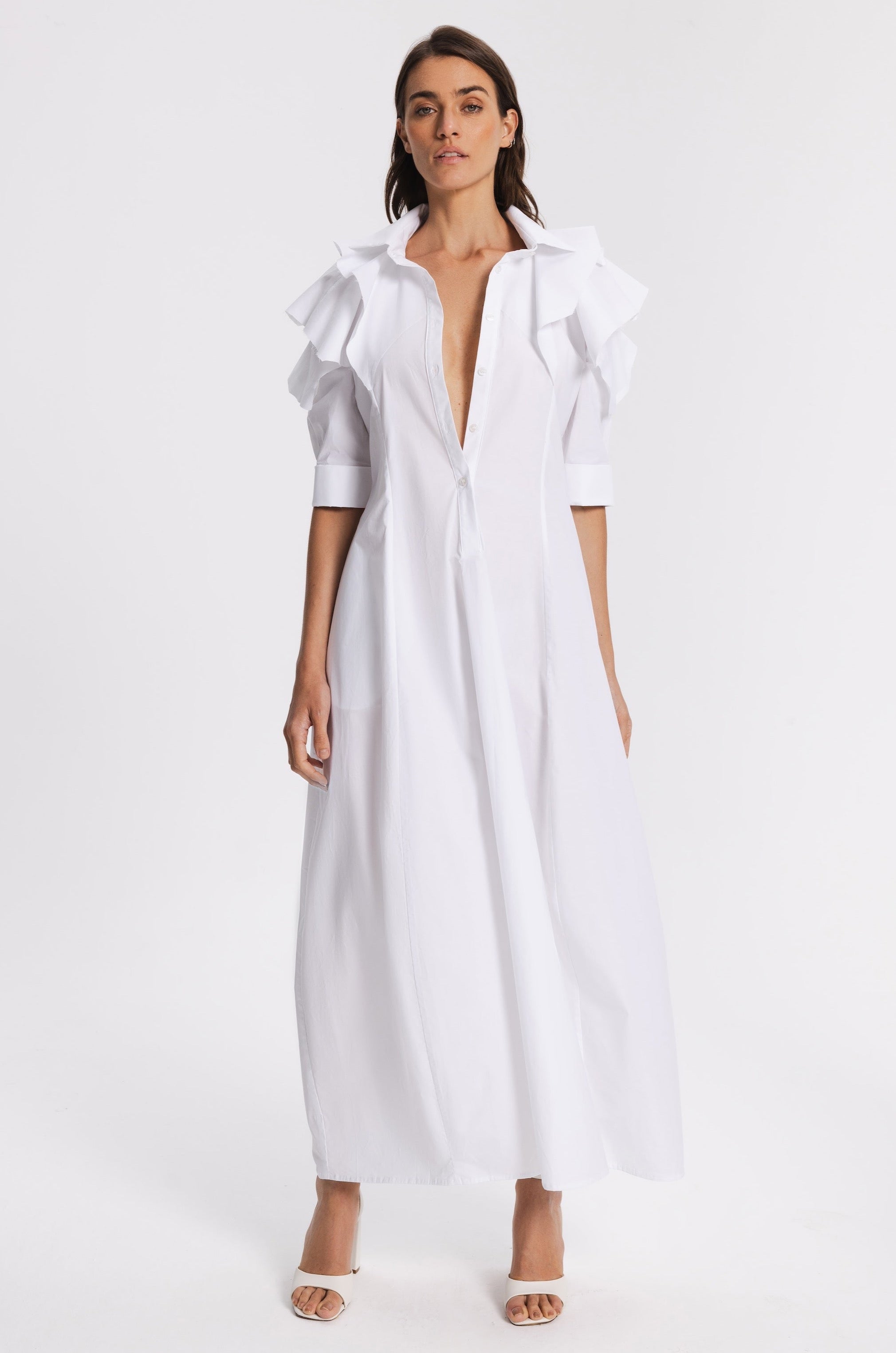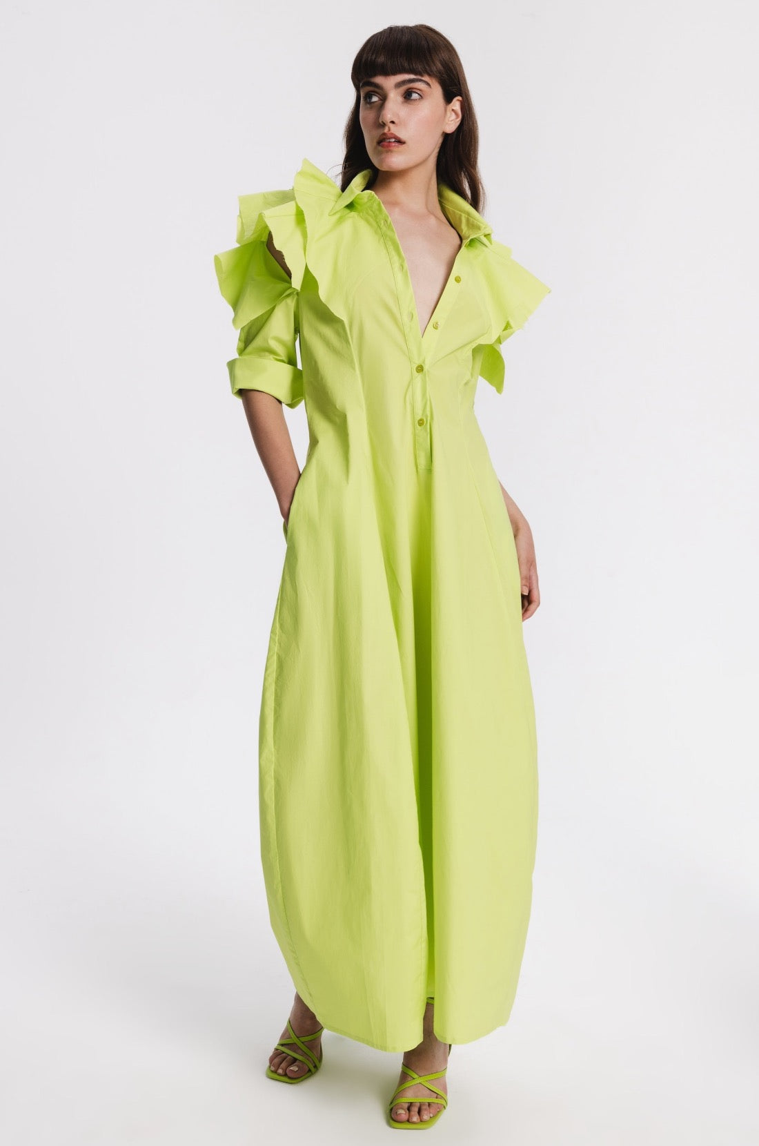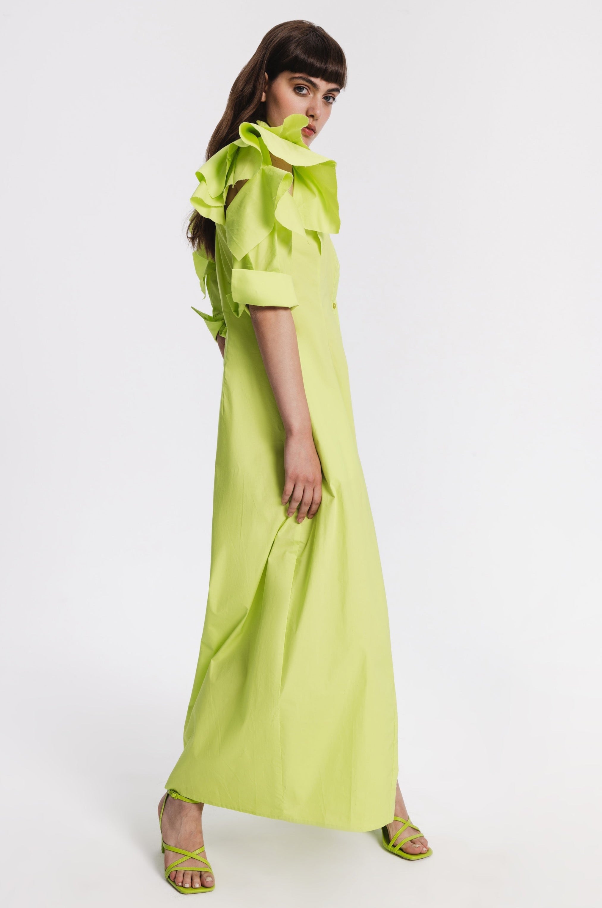 Maxi stretch poplin dress with puffy volant on the shoulders. Detachable elbow-length sleeves with regular cuffs.