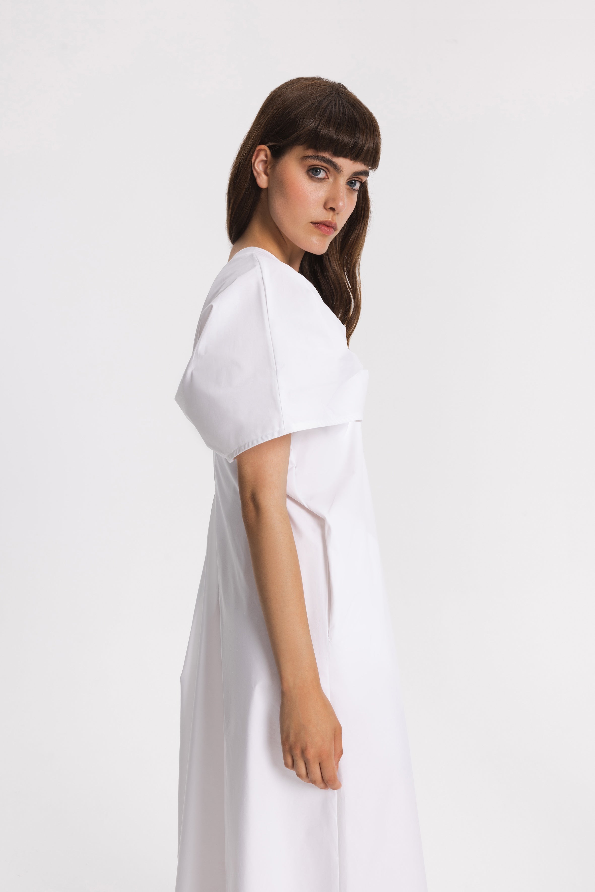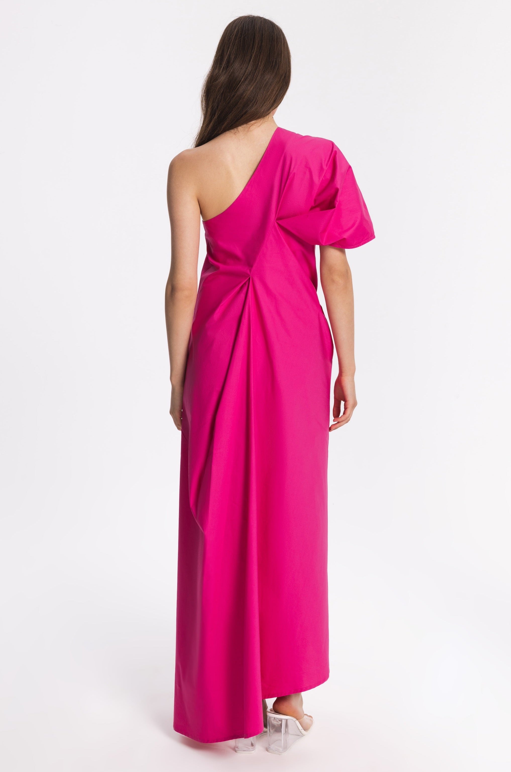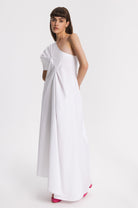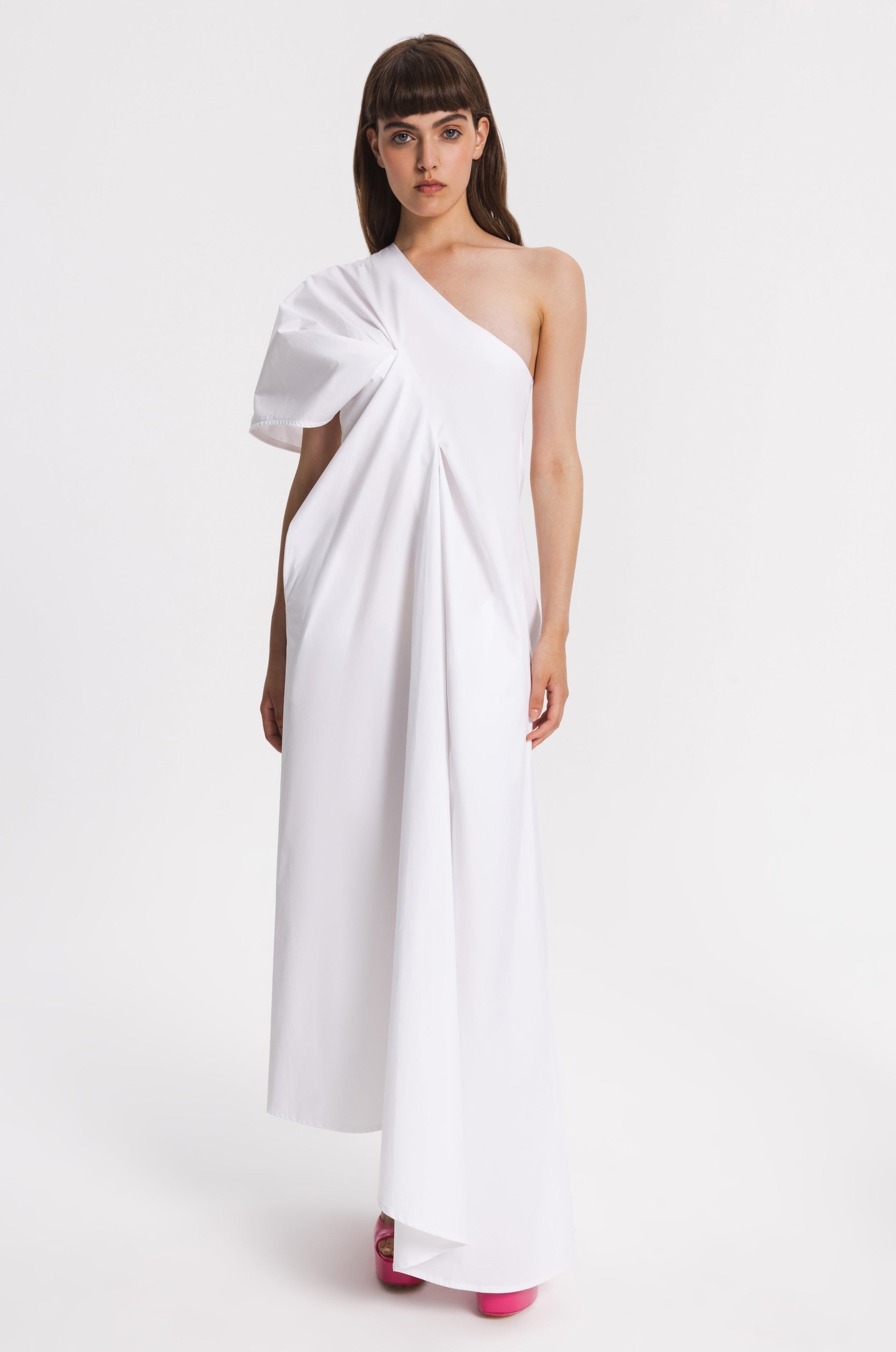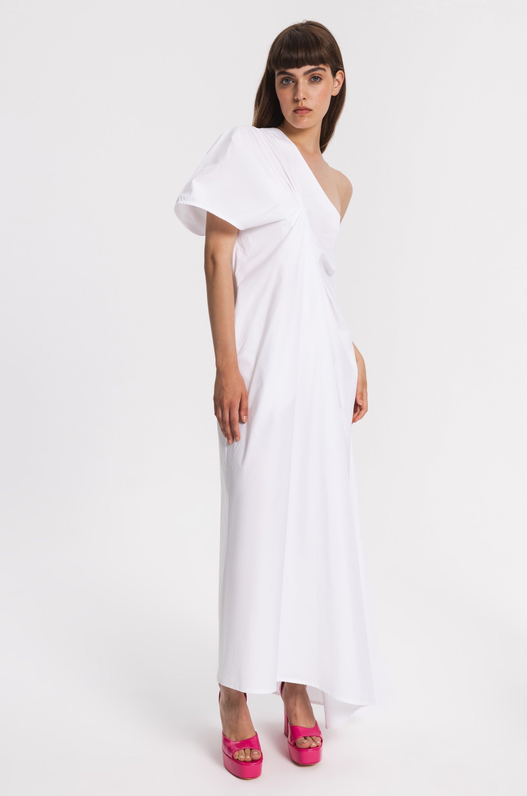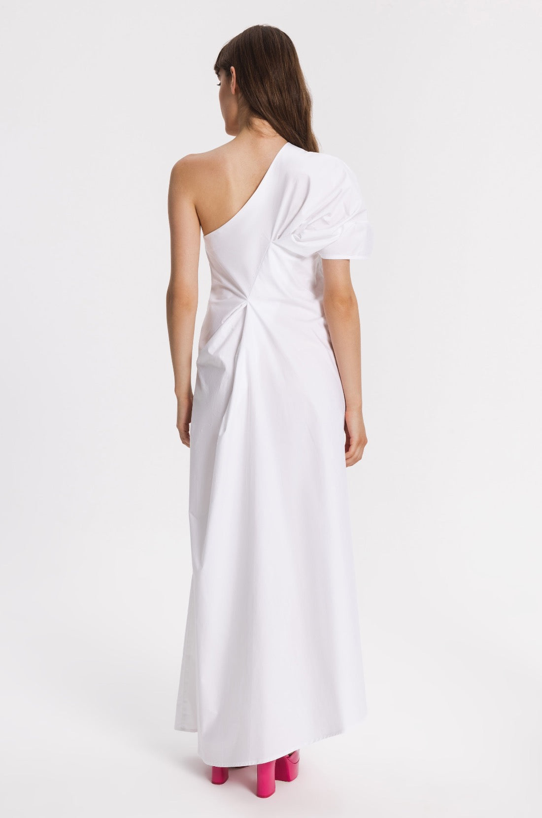 One shoulder draped maxi poplin dress. Irregular length hem, side in-seam pockets.