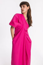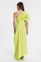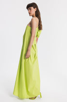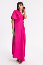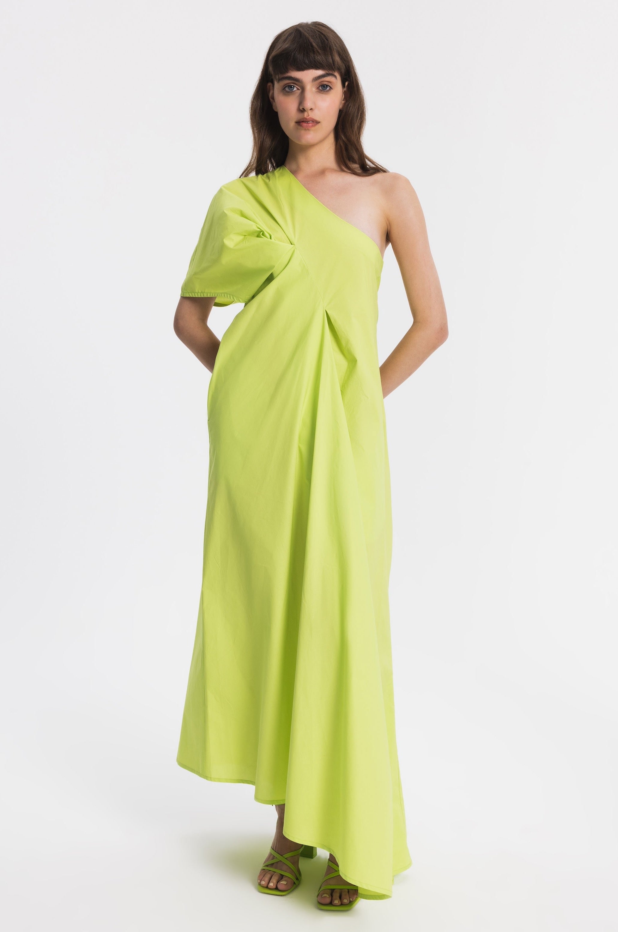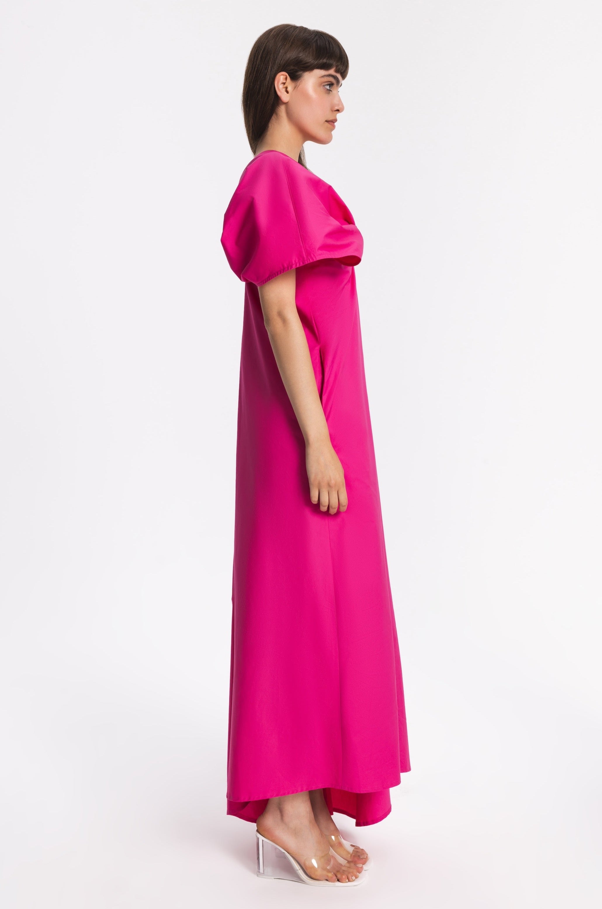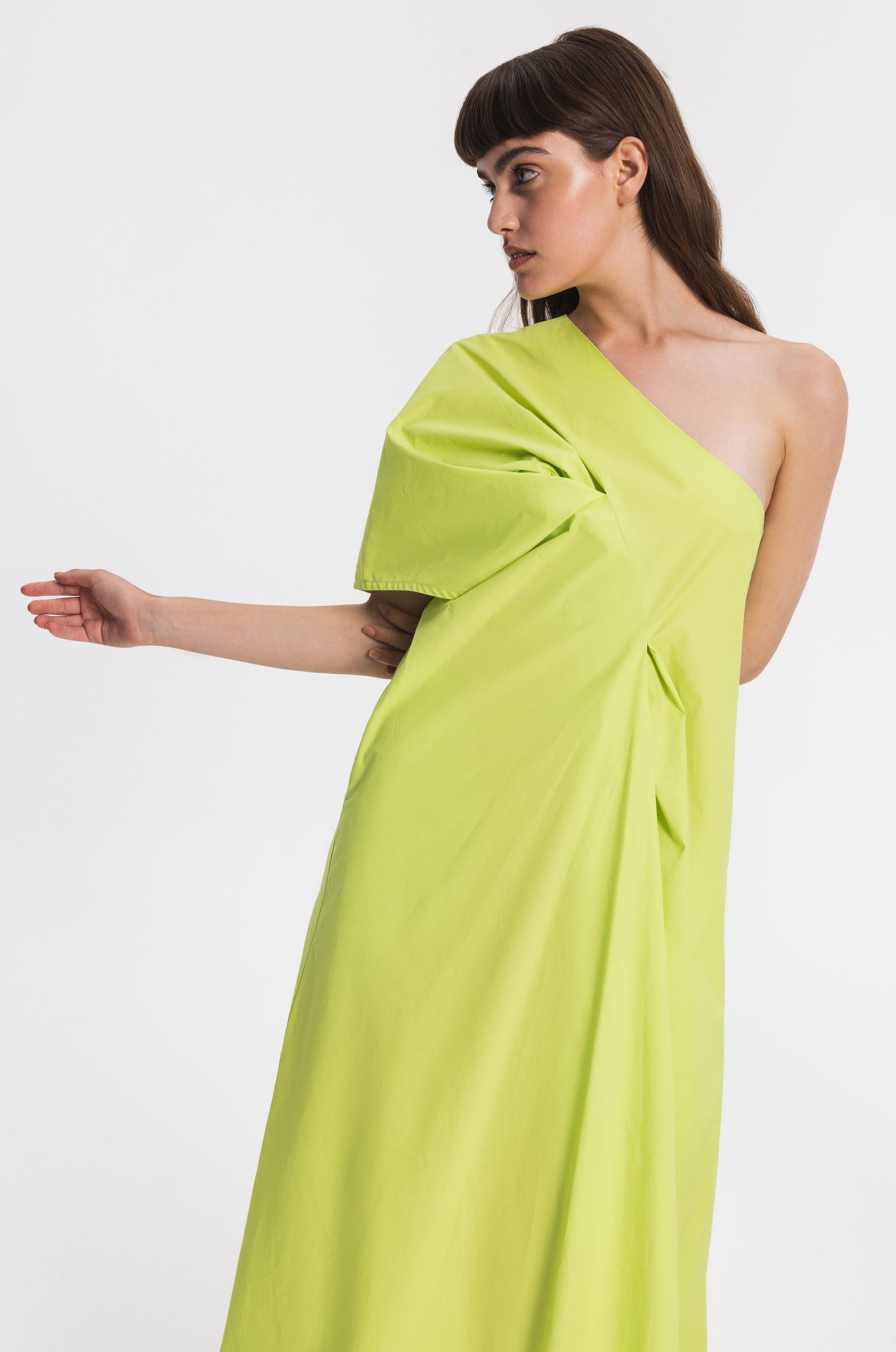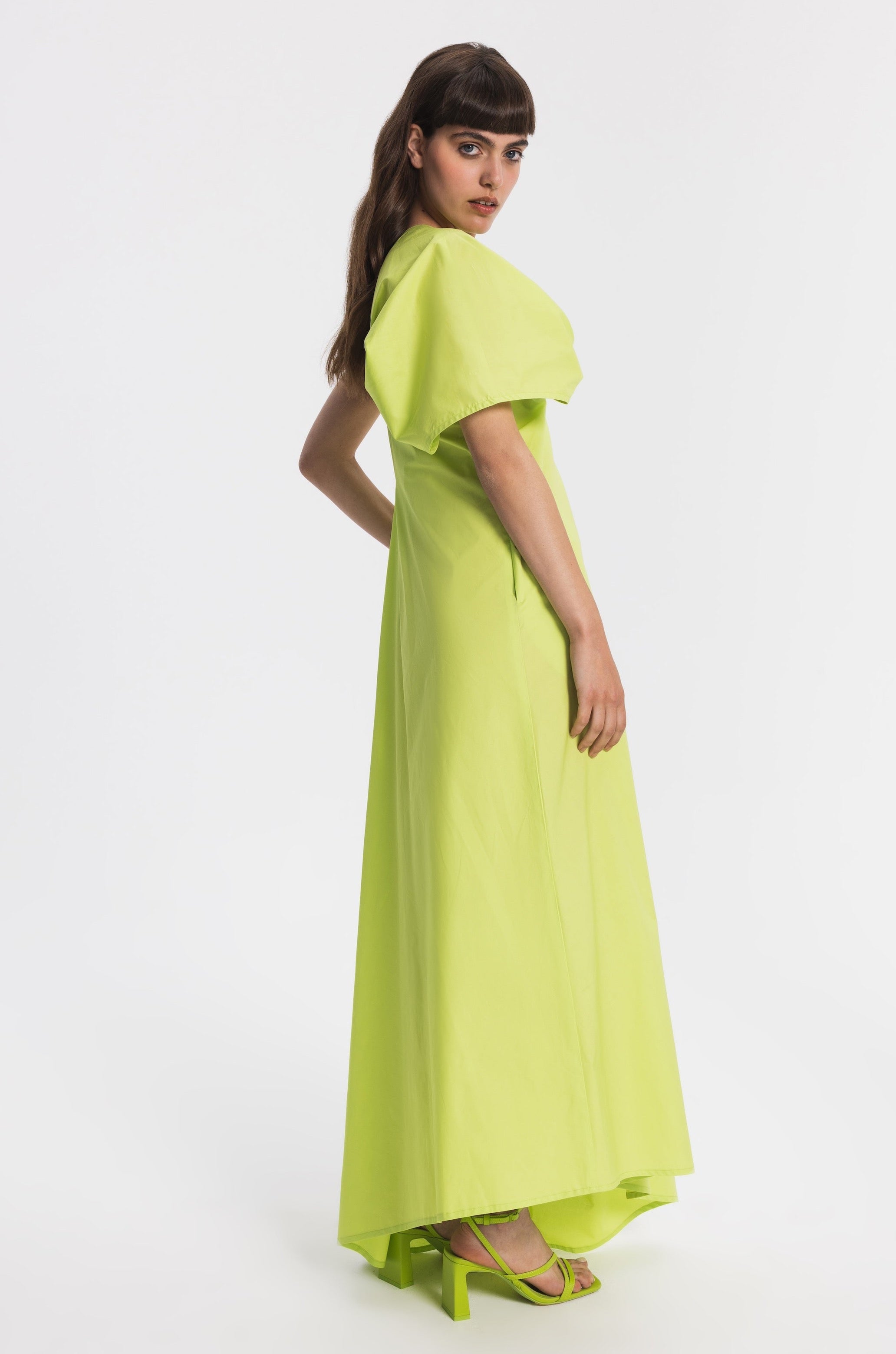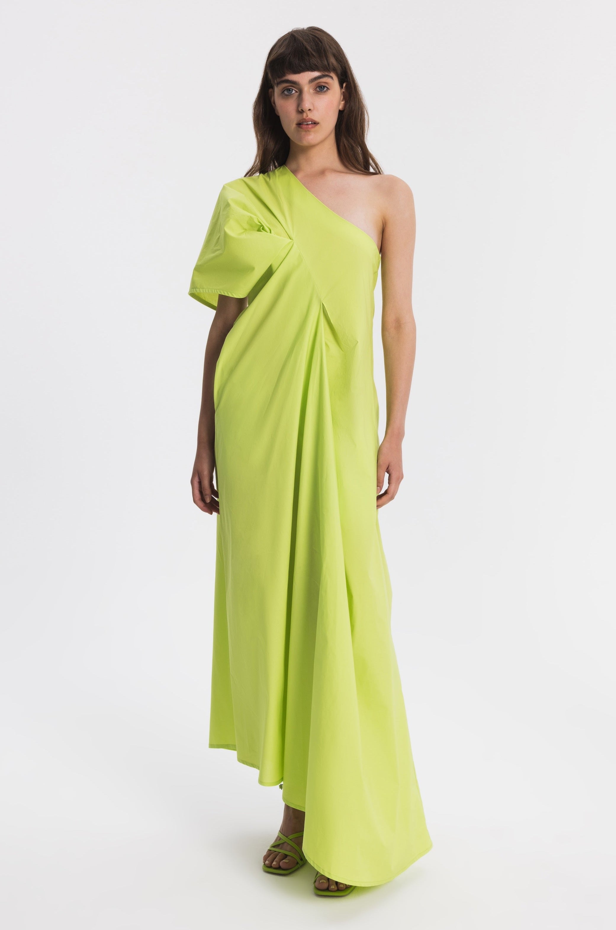 One shoulder draped maxi poplin dress. Irregular length hem, side in-seam pockets.
