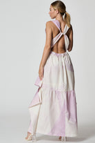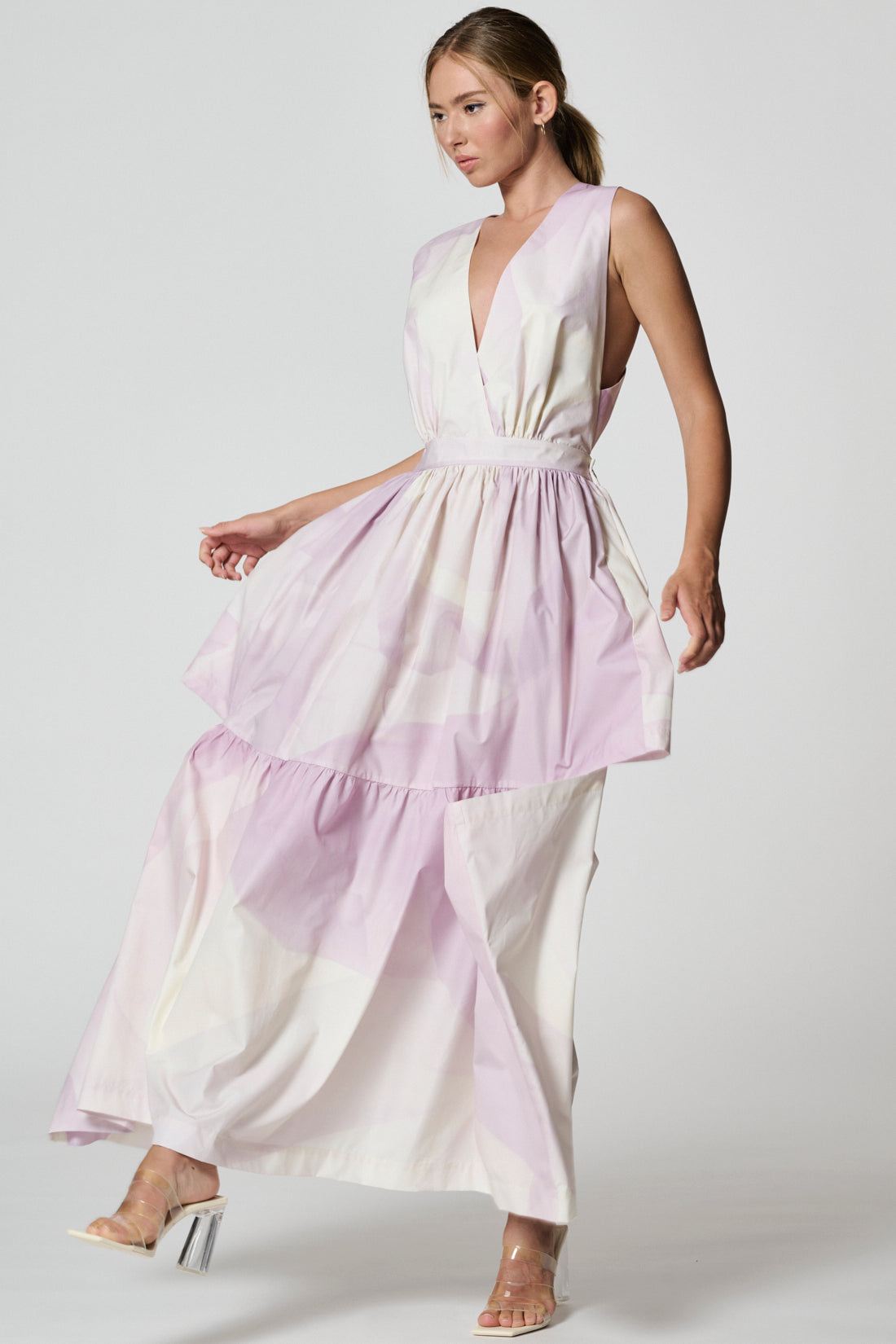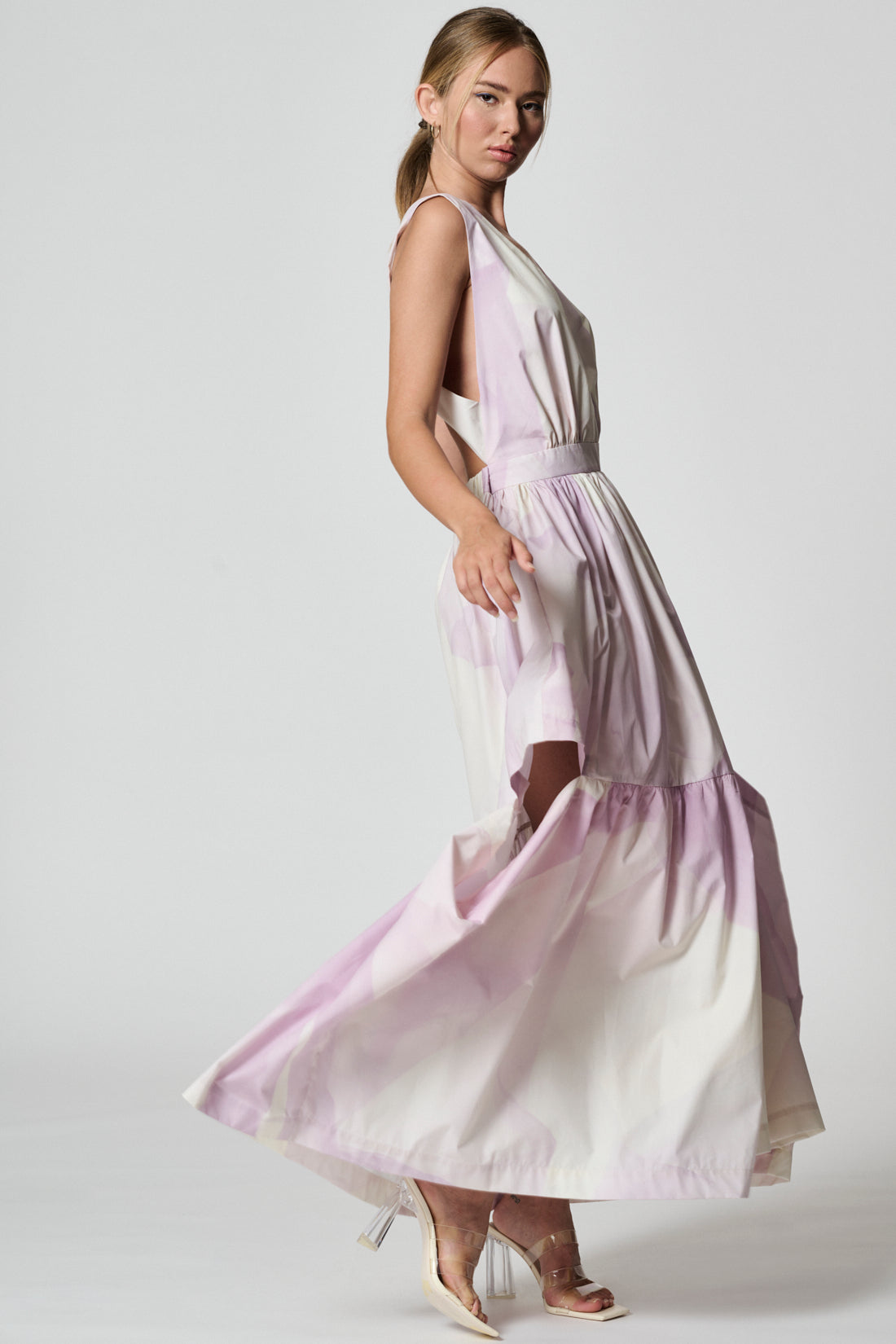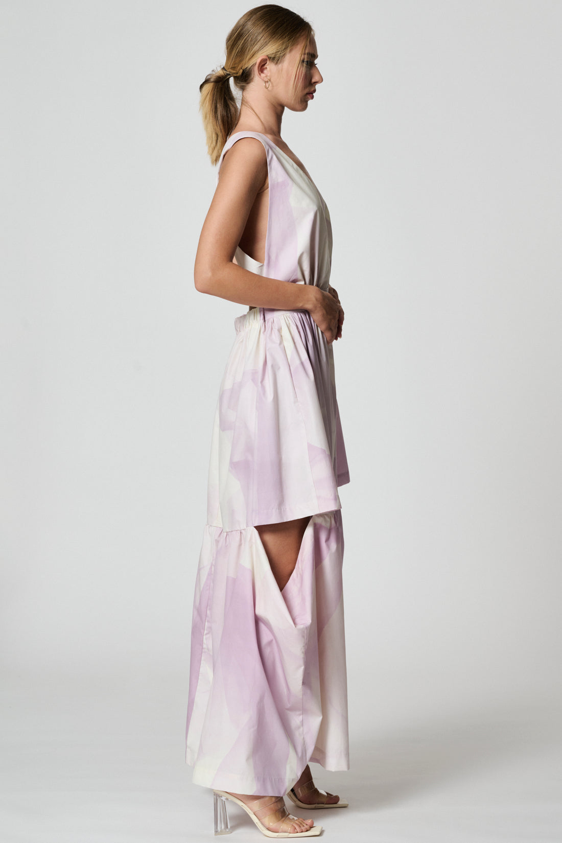 Long open shoulder dress with a flared silhouette. This dress features a deep V-neck and interwined laces behind. Elasticated waist band at the back part. Peculiarity of the dress are wide decorative horizontal cuts on both sides at the height of the thigh. Side-seam pockets.