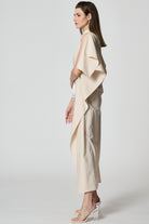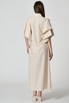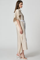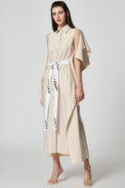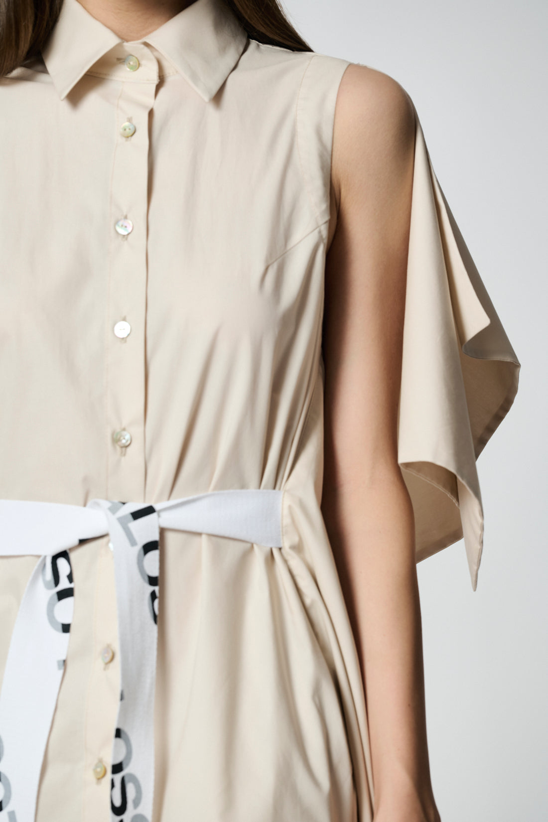 Long straight-cut sleeveless dress with side slits and "Balossa" print white belt. The dress features fluttering panels fixed on both side parts to give a romatic look. Front buttoning, side-seam pockets.