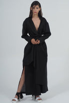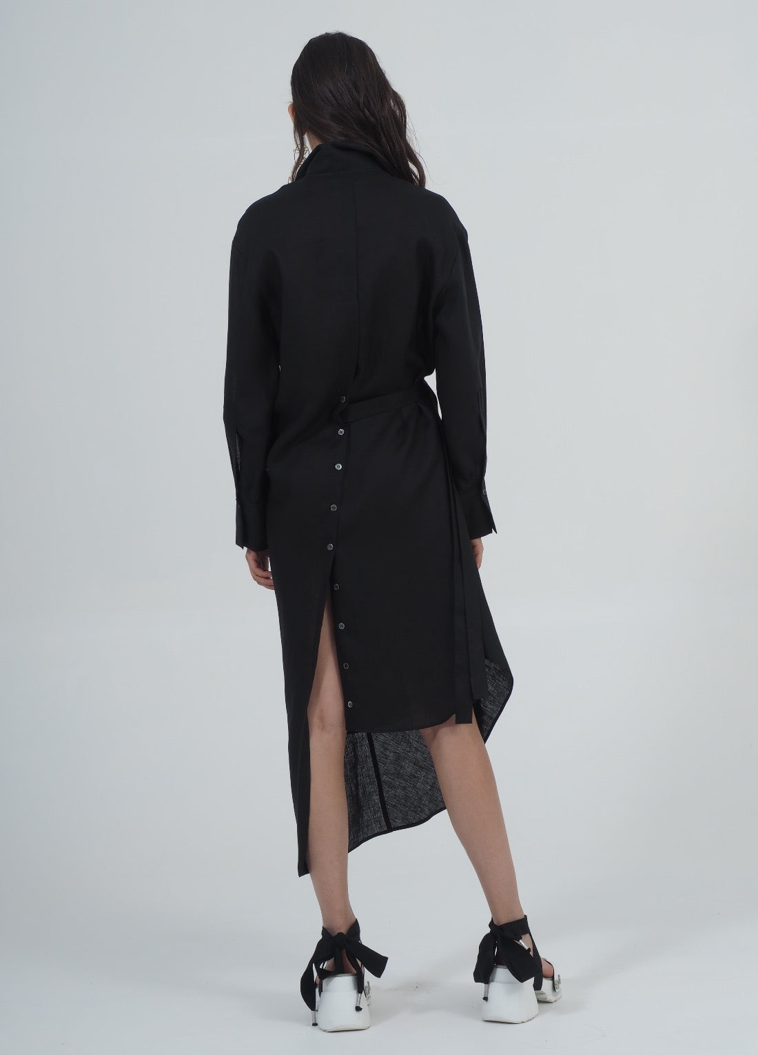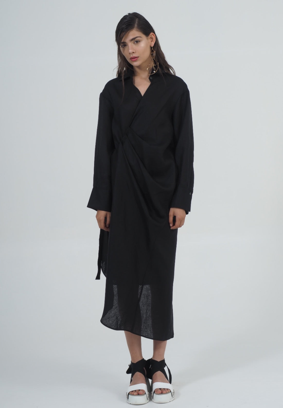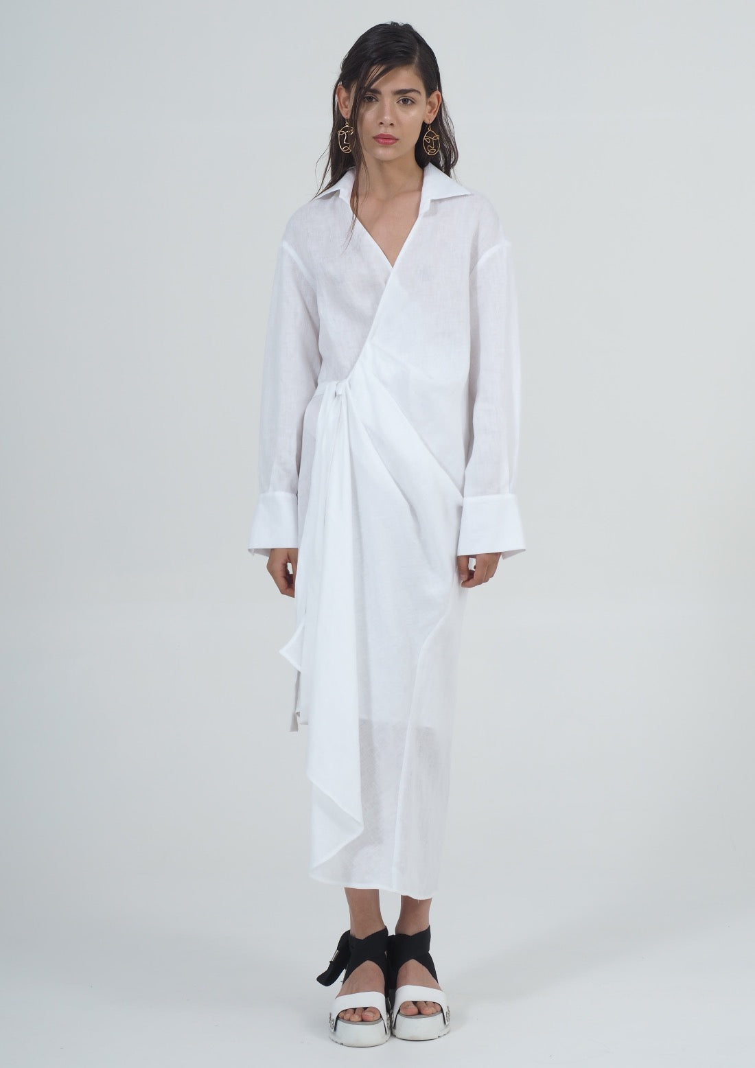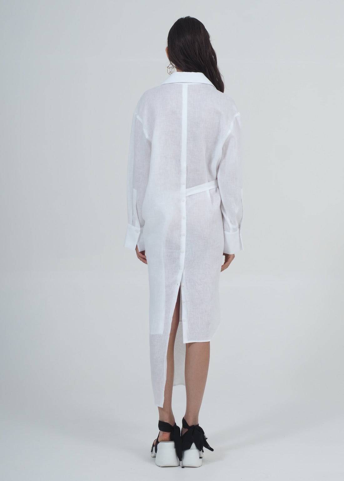 Asymmetrical long sleeved shirt-dress made of pure linen. At the front the shirt forms a deep v-neckline, before crossing and being bound with laces.