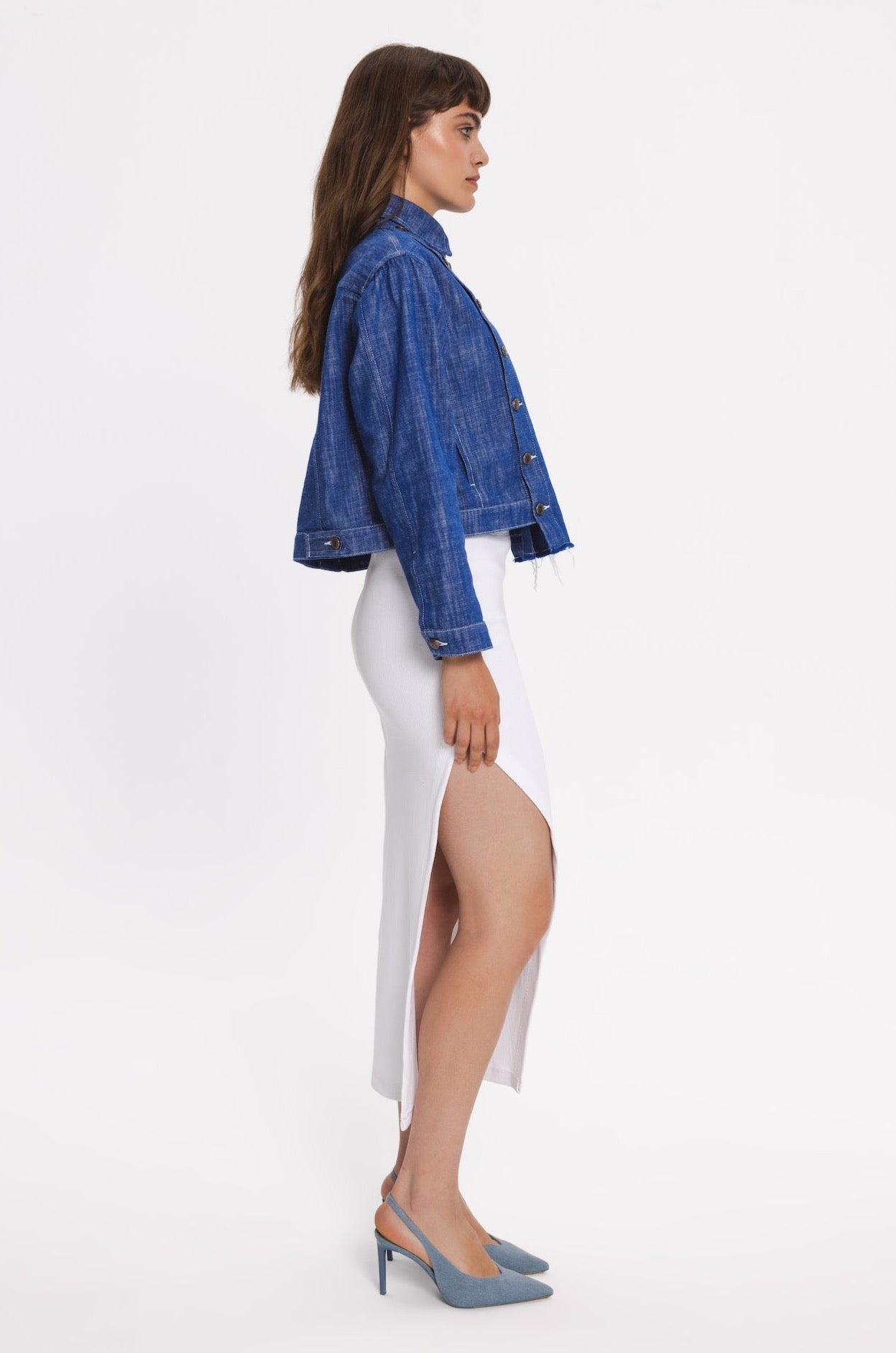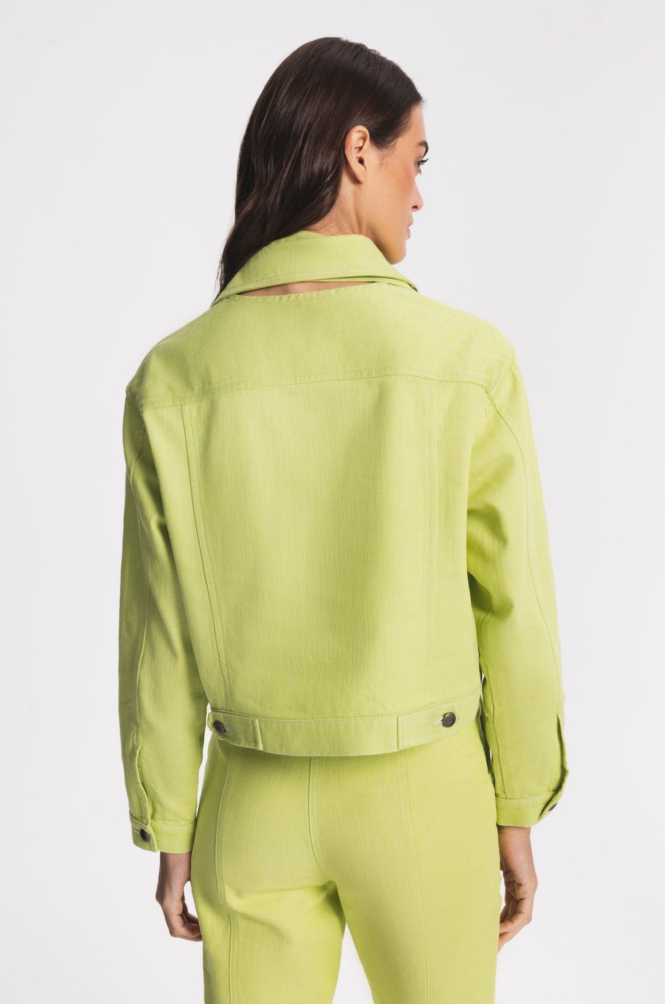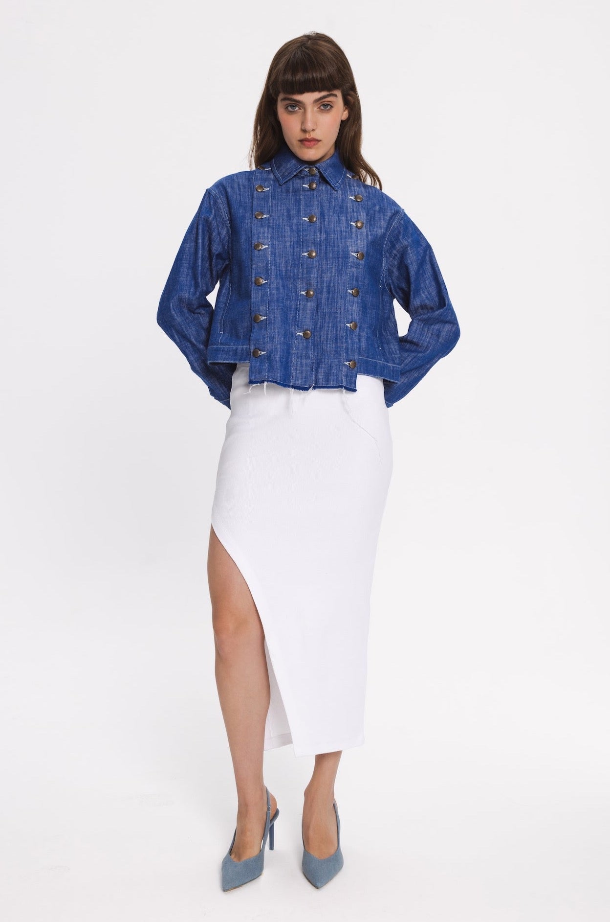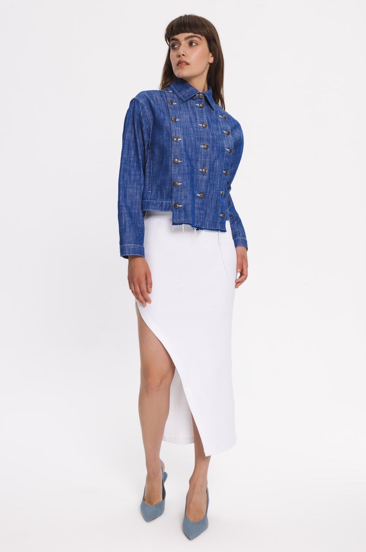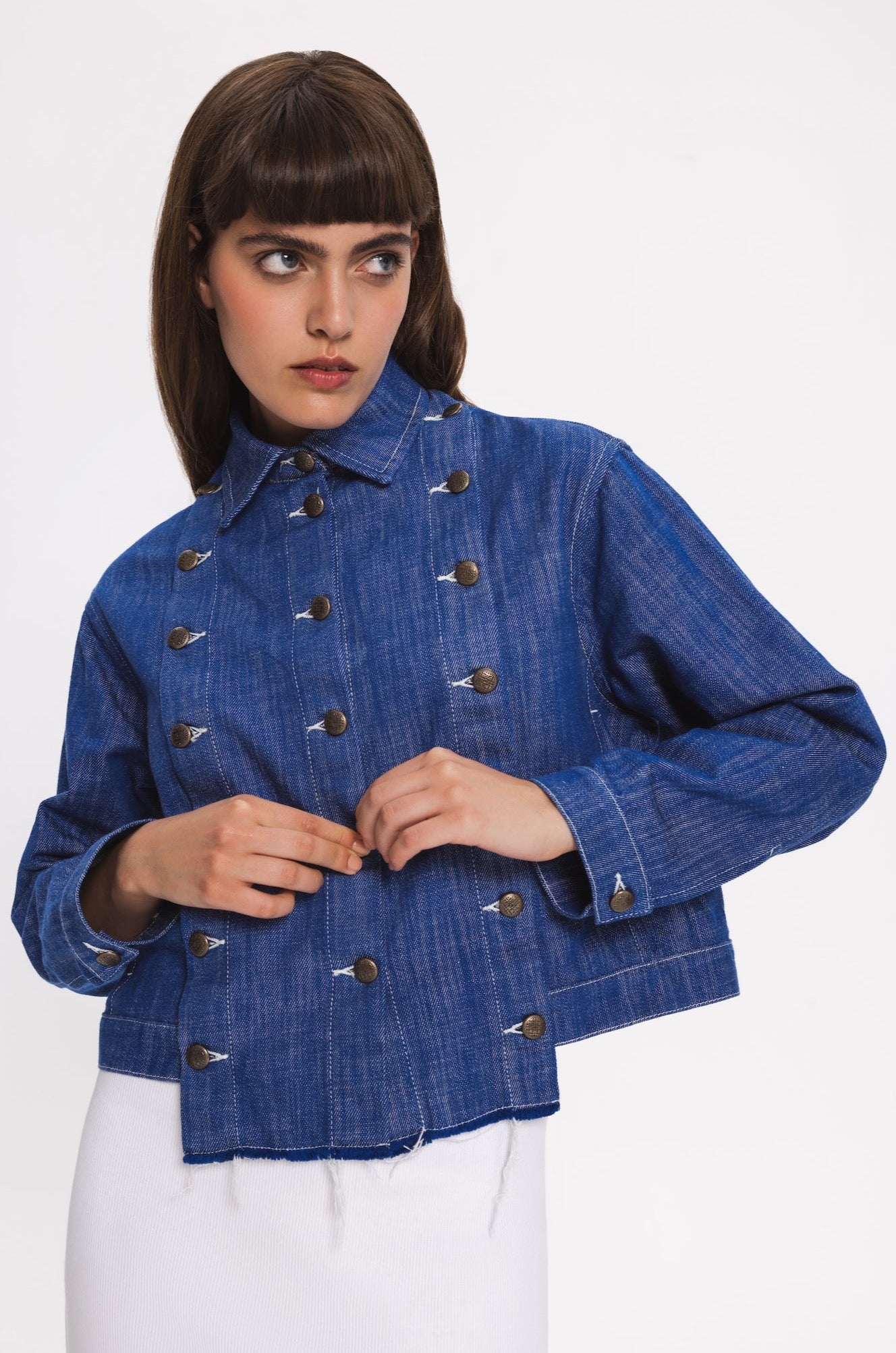 Regular-fit denim jacket with two side pockets. Front part can be customised and detached by metal buttons. The hem in front part is slightly longer.