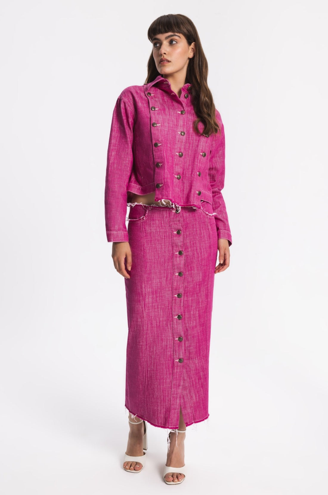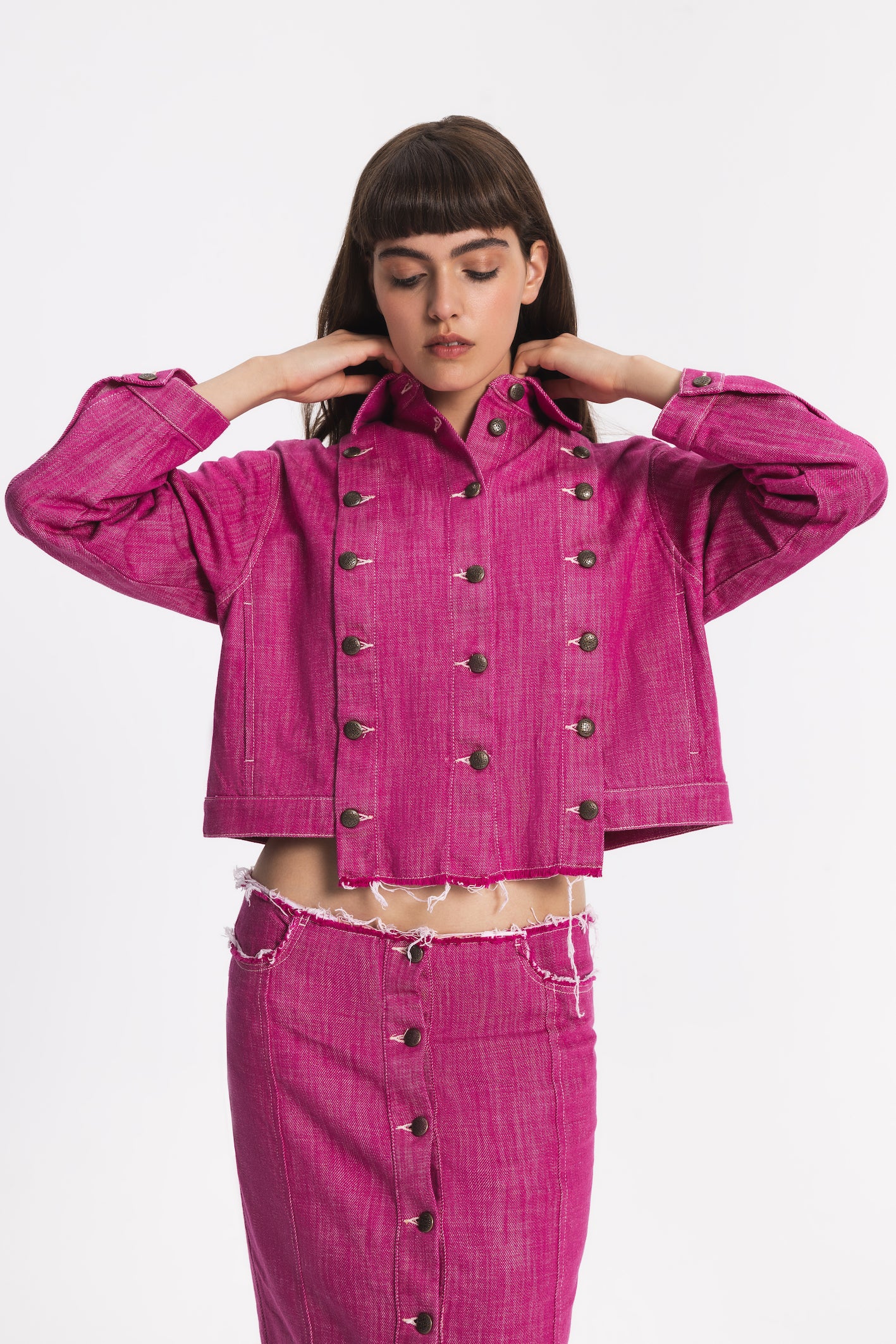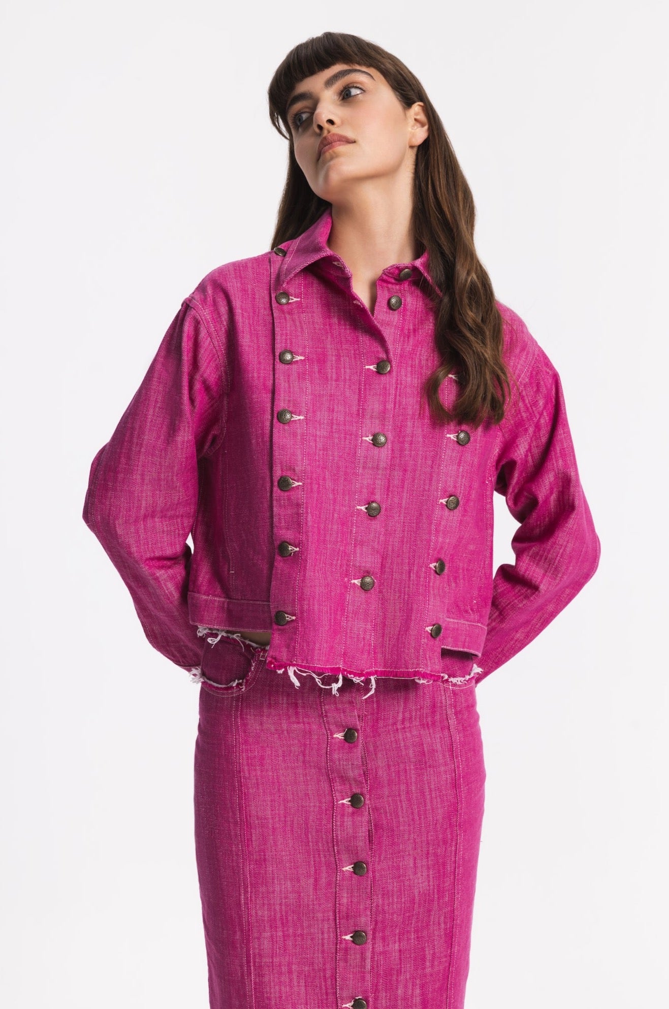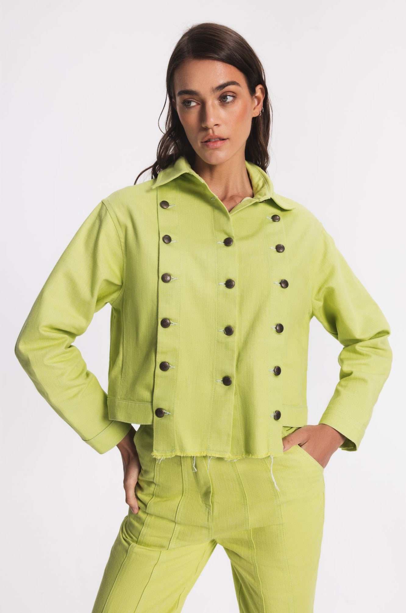 Regular-fit denim jacket with two side pockets. Front part can be customised and detached by metal buttons. The hem in front part is slightly longer.