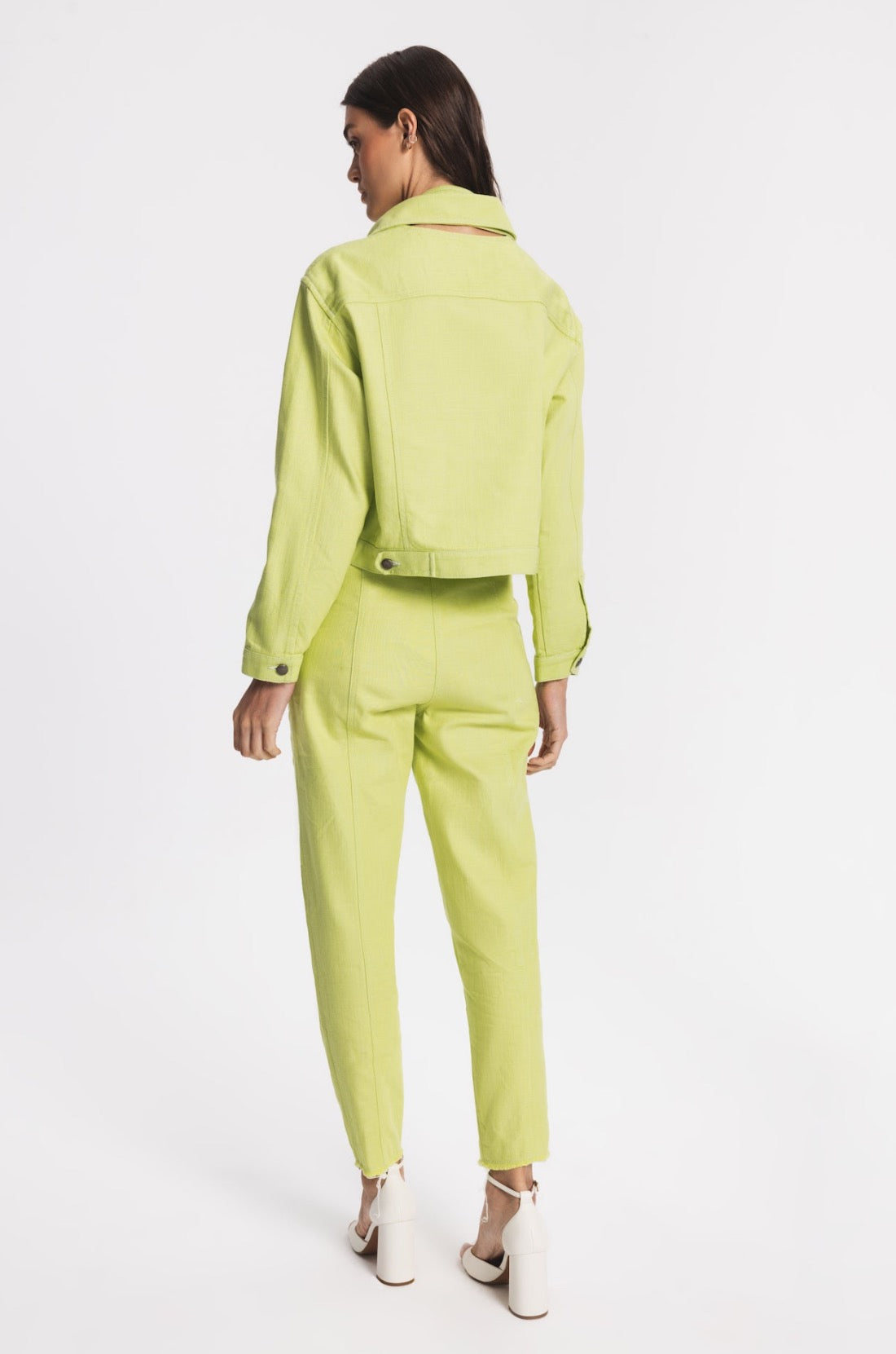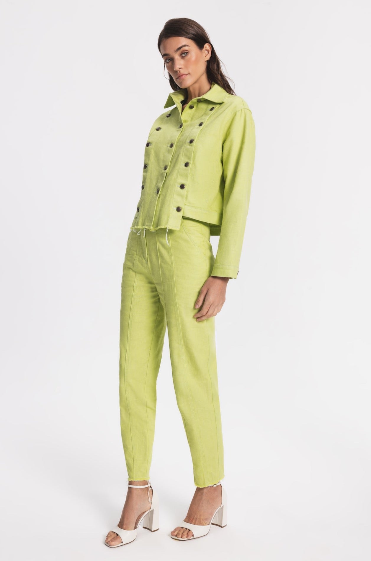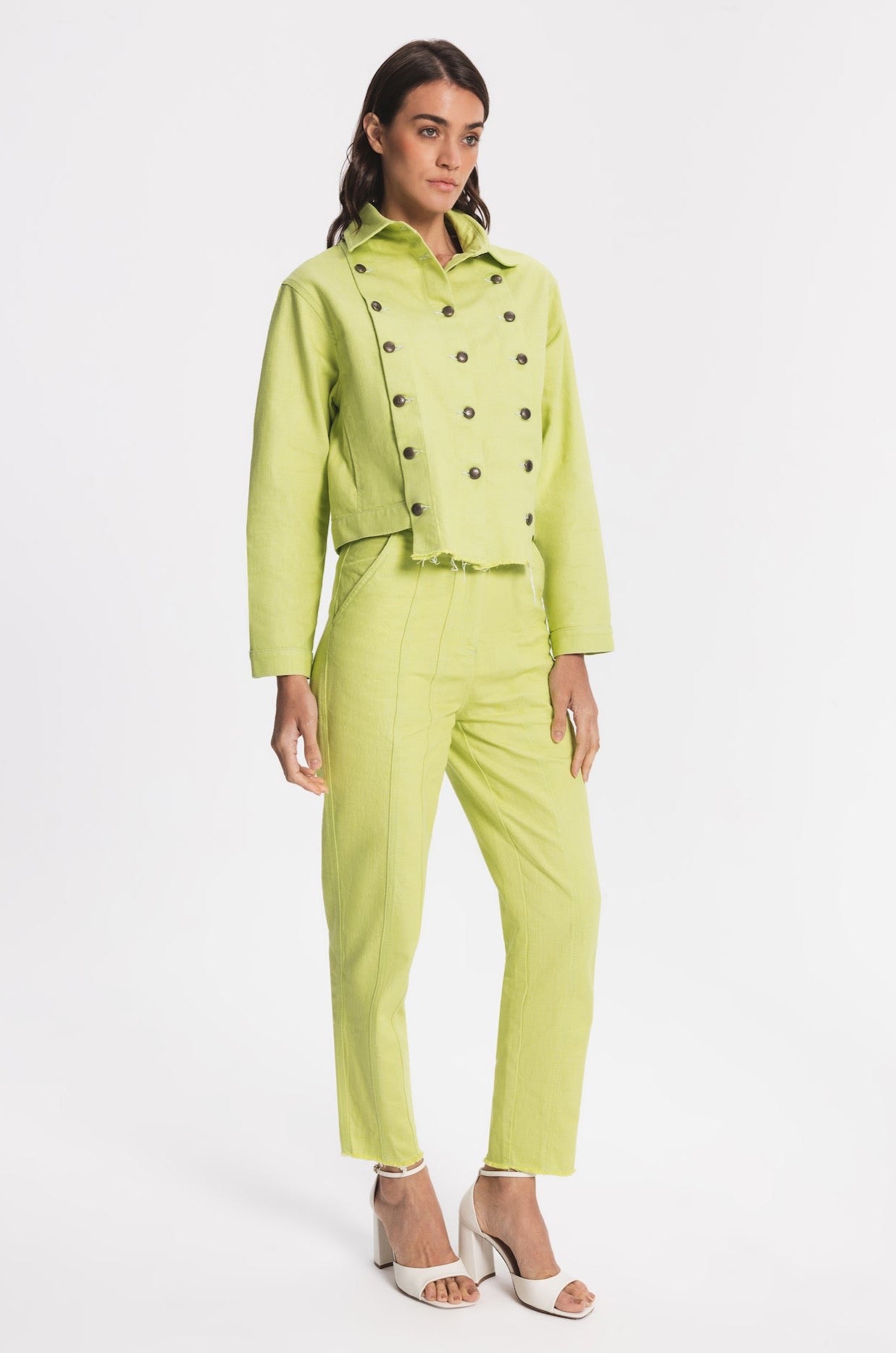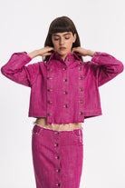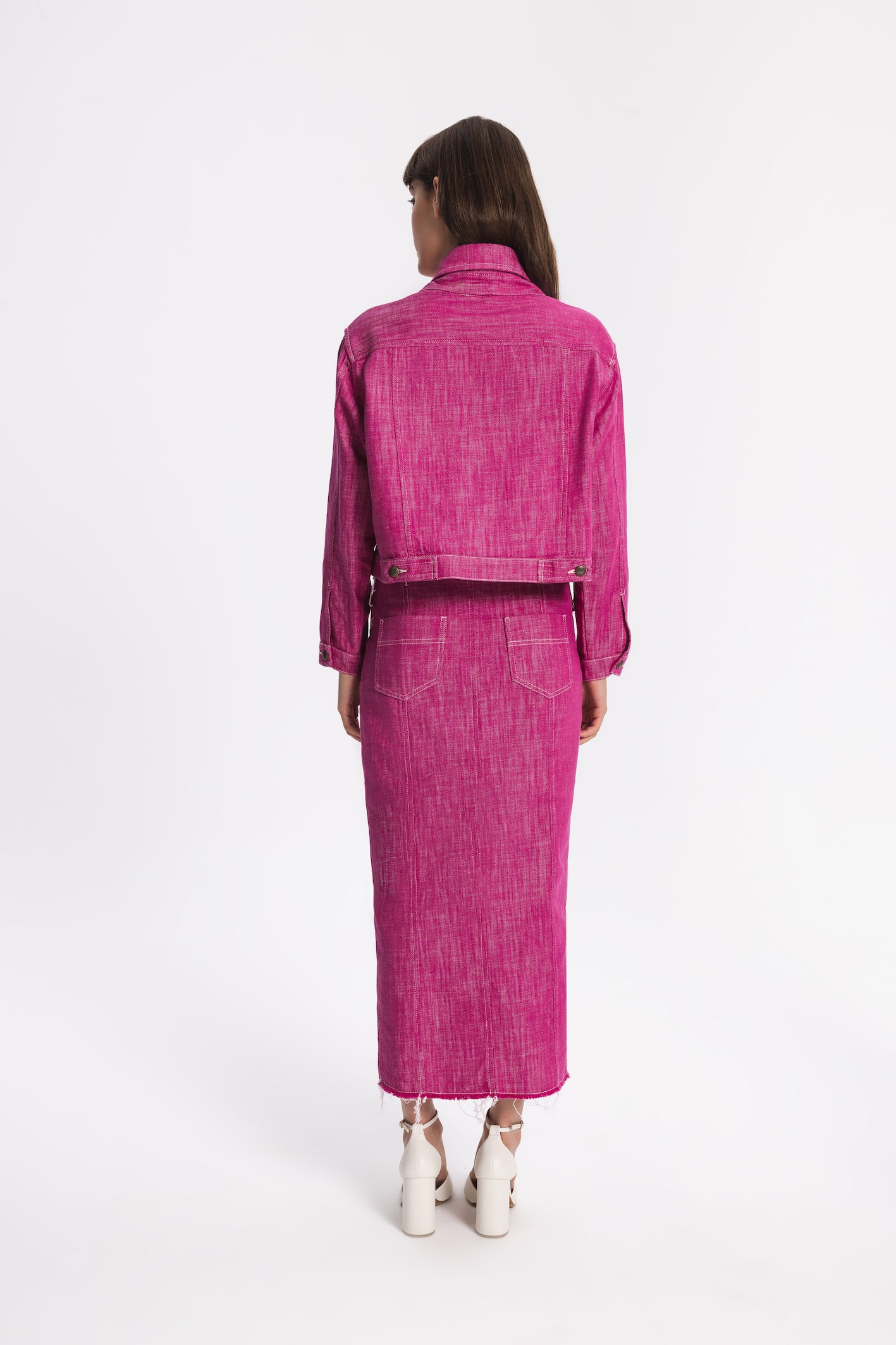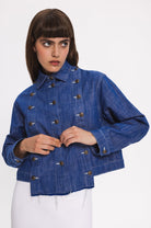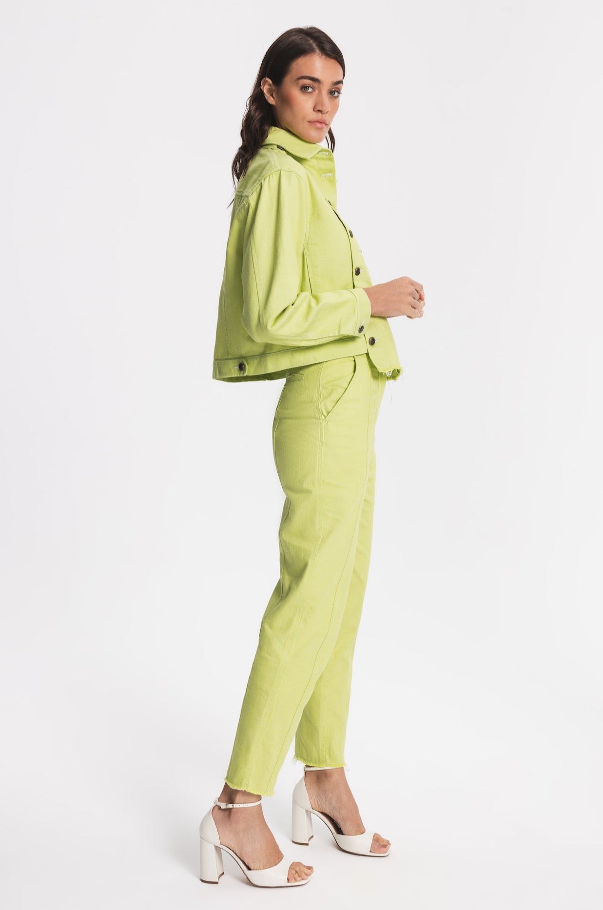 Regular-fit denim jacket with two side pockets. Front part can be customised and detached by metal buttons. The hem in front part is slightly longer.