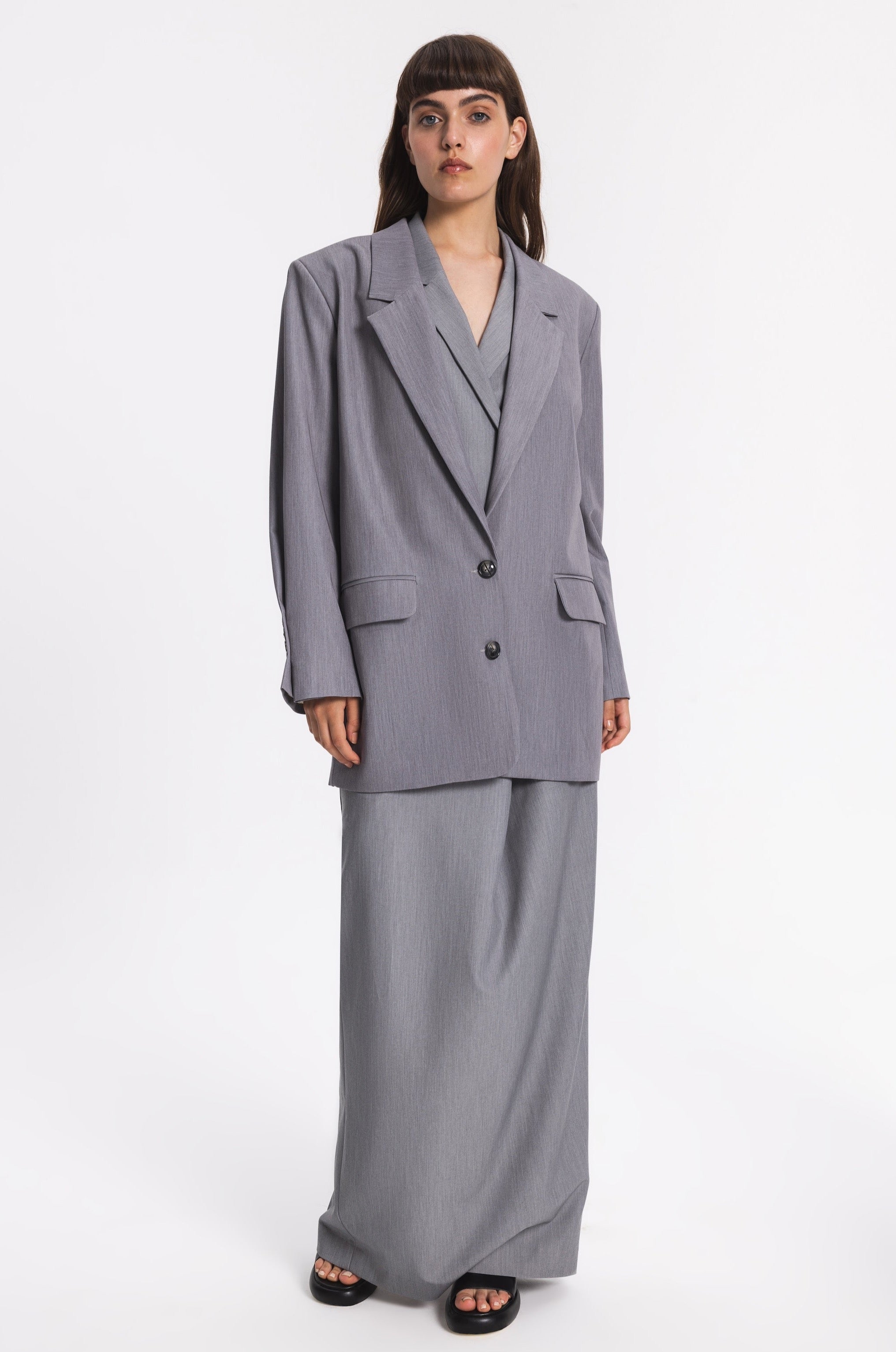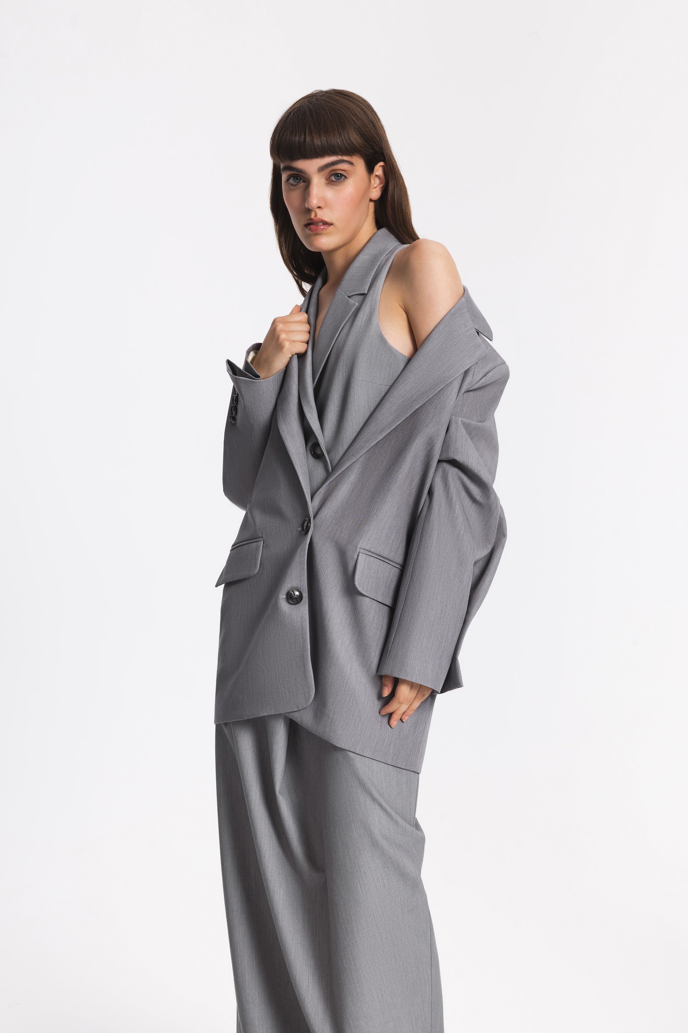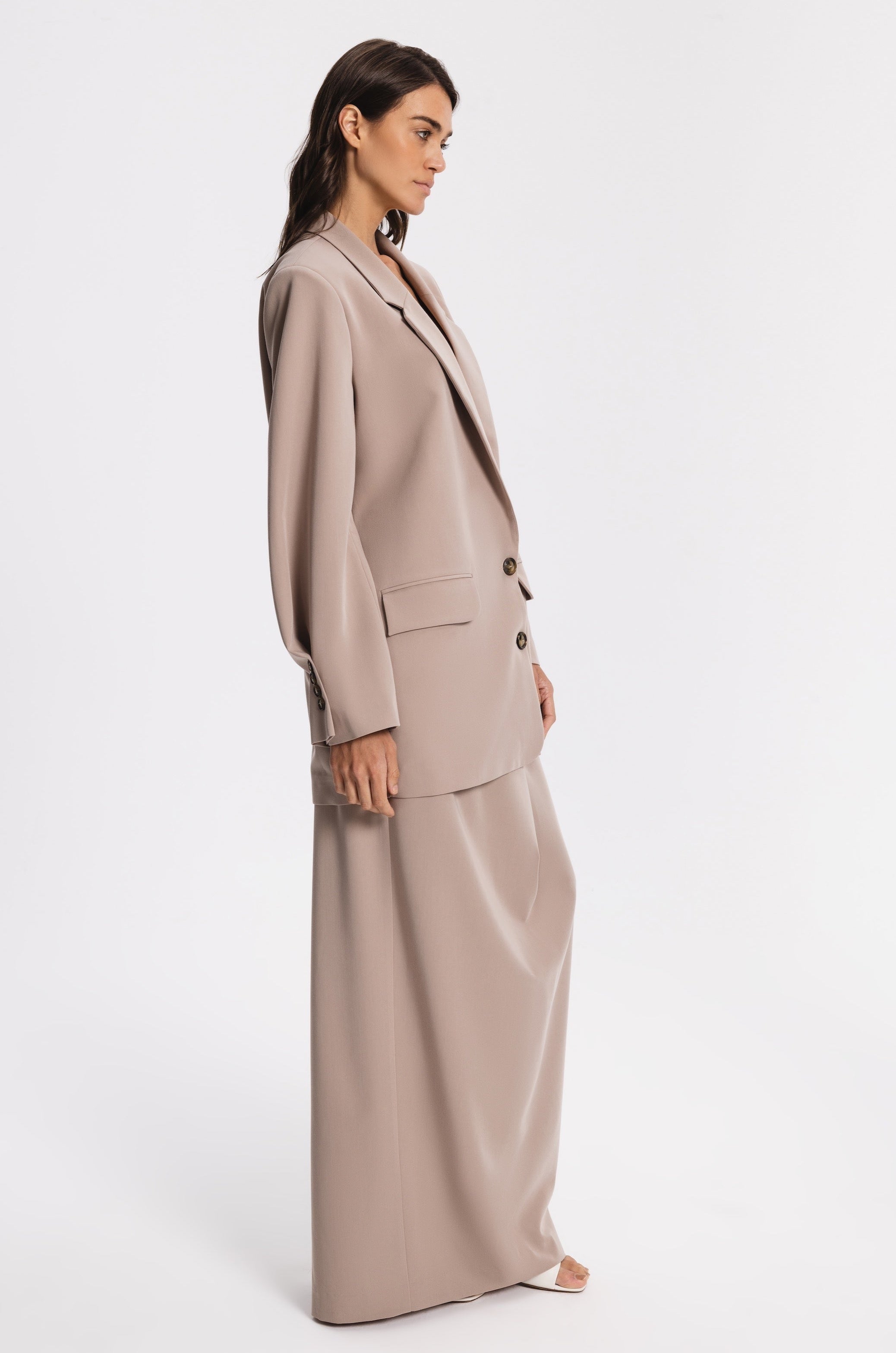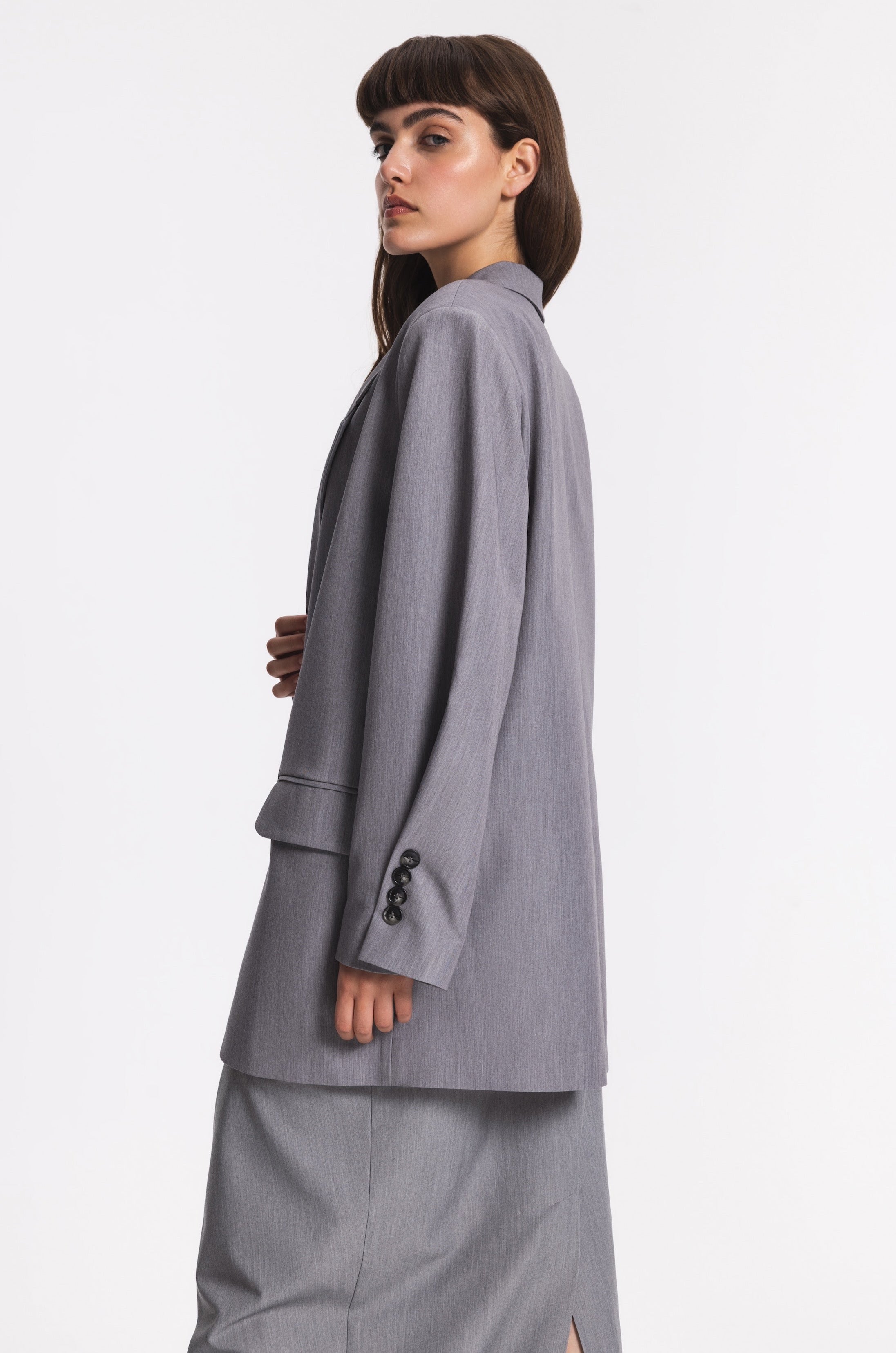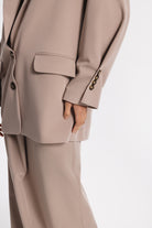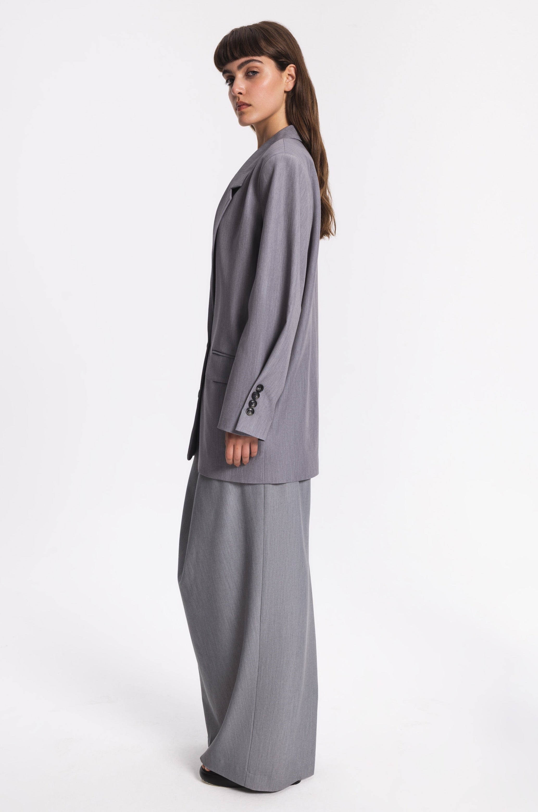 Large fit blazer with deep notch lapel, flap pockets and 2 button closure. Large sleeves with an extra fold fixed by 4 small buttons on the cuffs. Half lined.