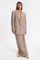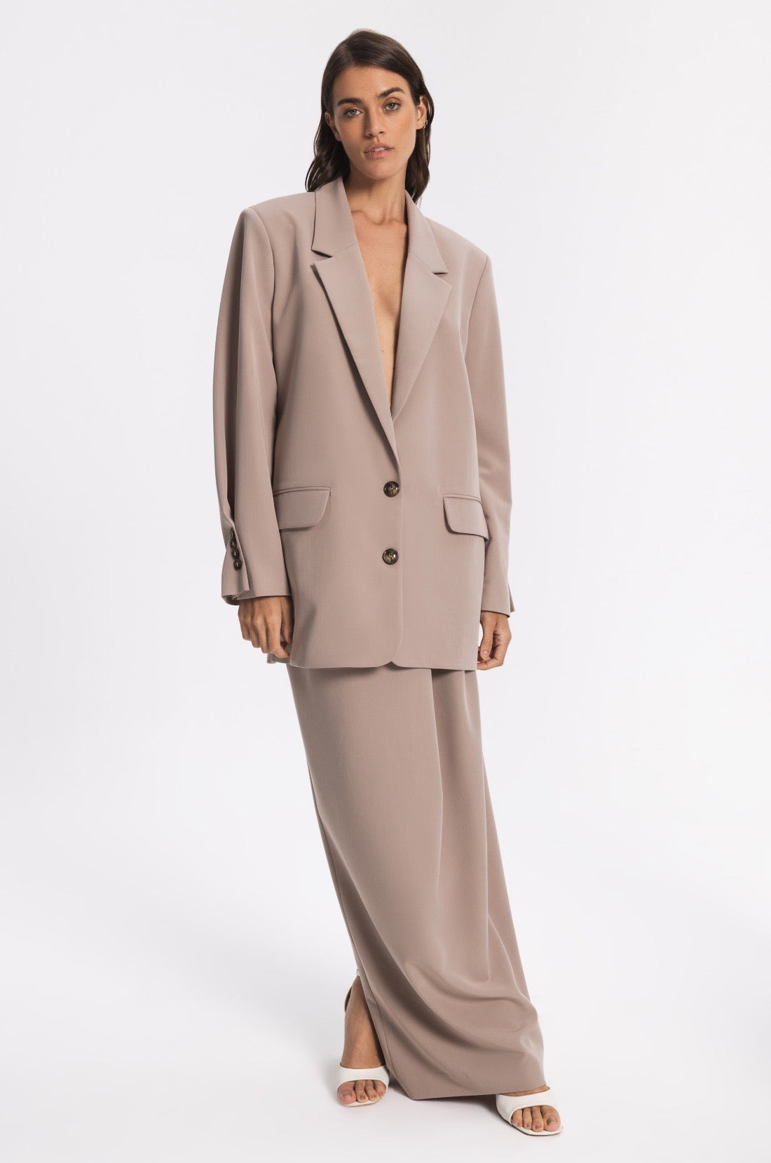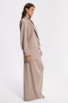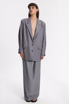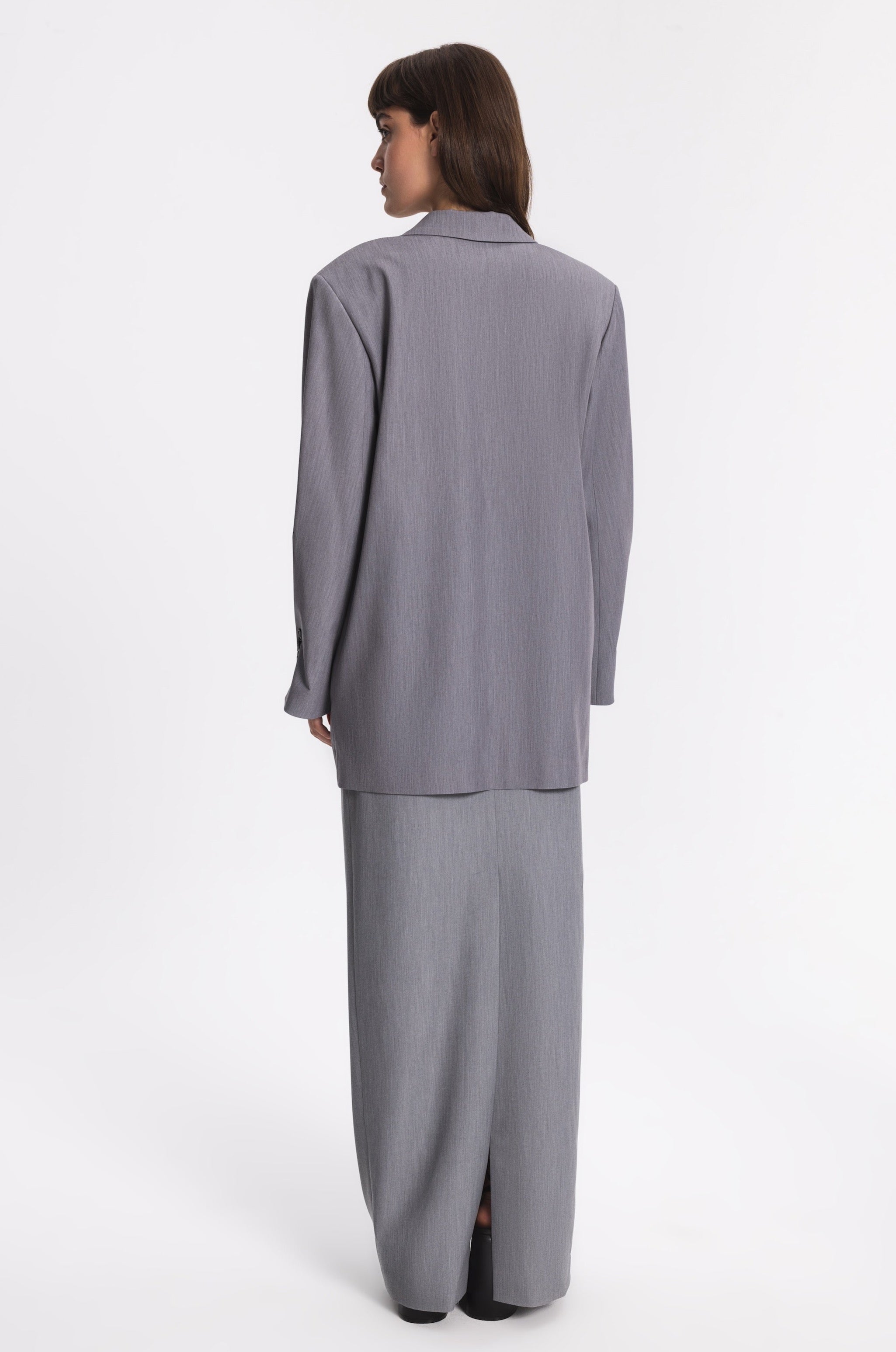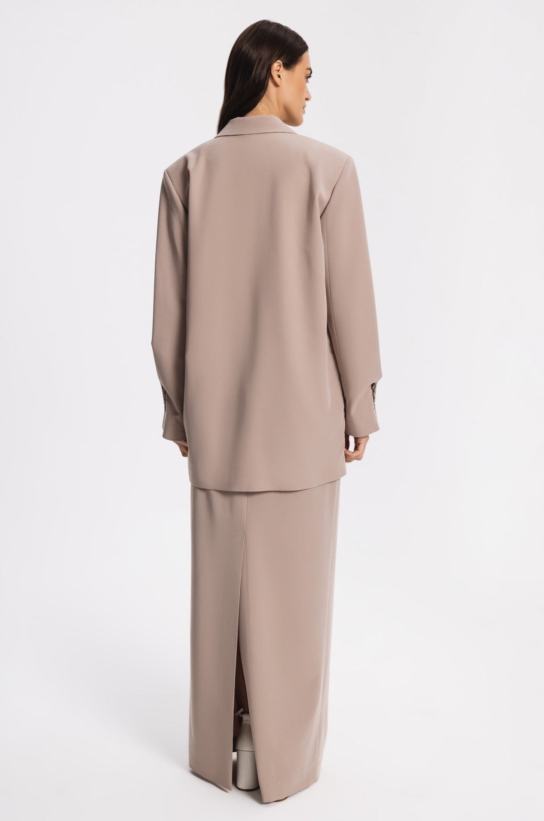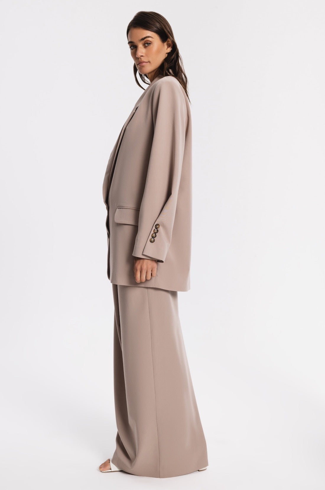 Large fit blazer with deep notch lapel, flap pockets and 2 button closure. Large sleeves with an extra fold fixed by 4 small buttons on the cuffs. Half lined.