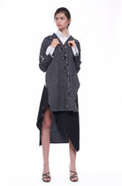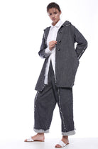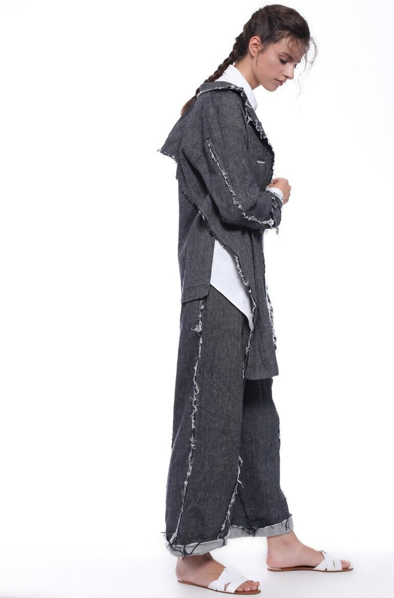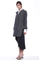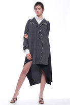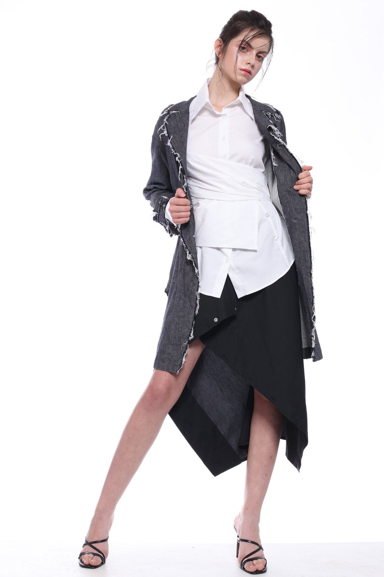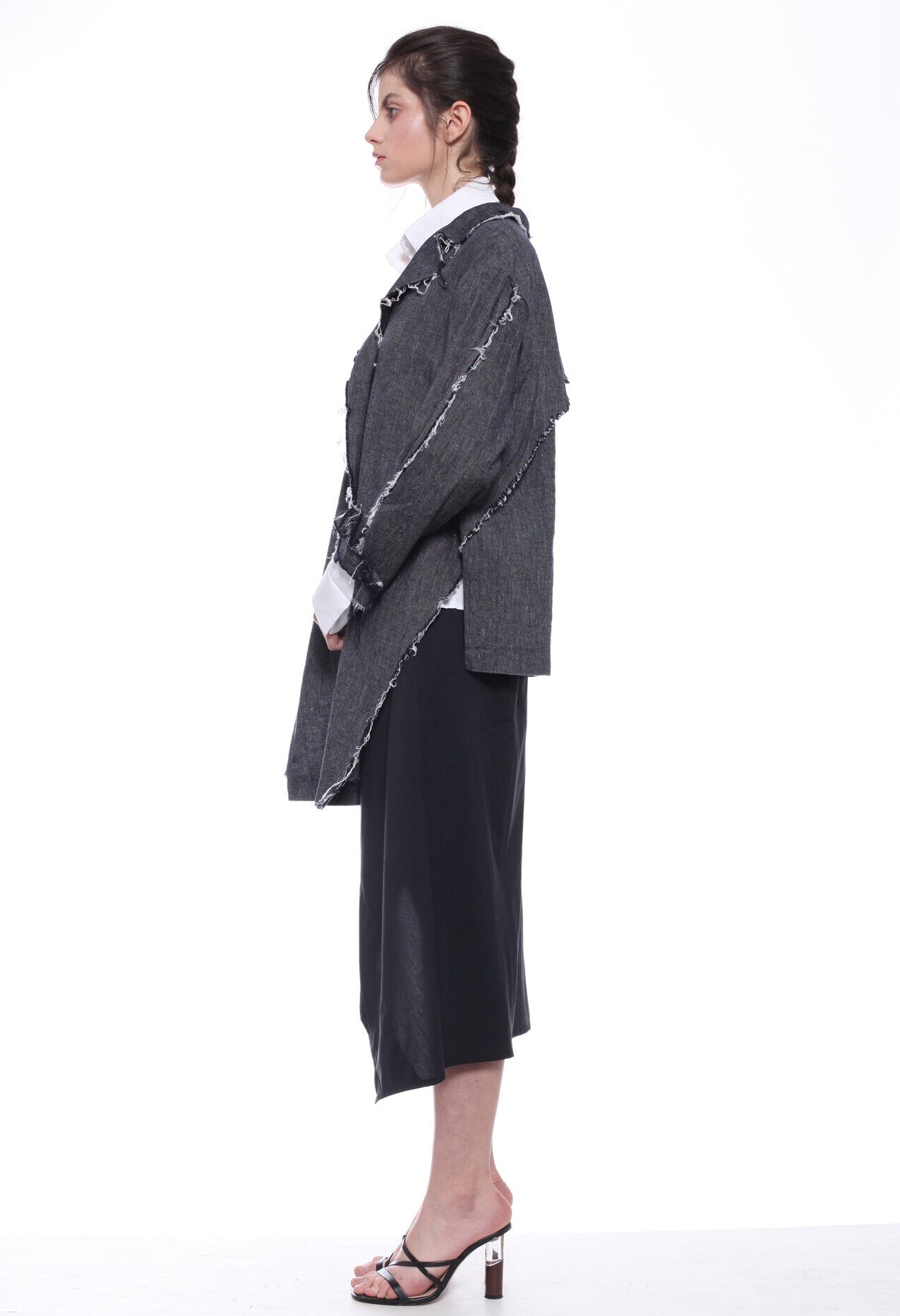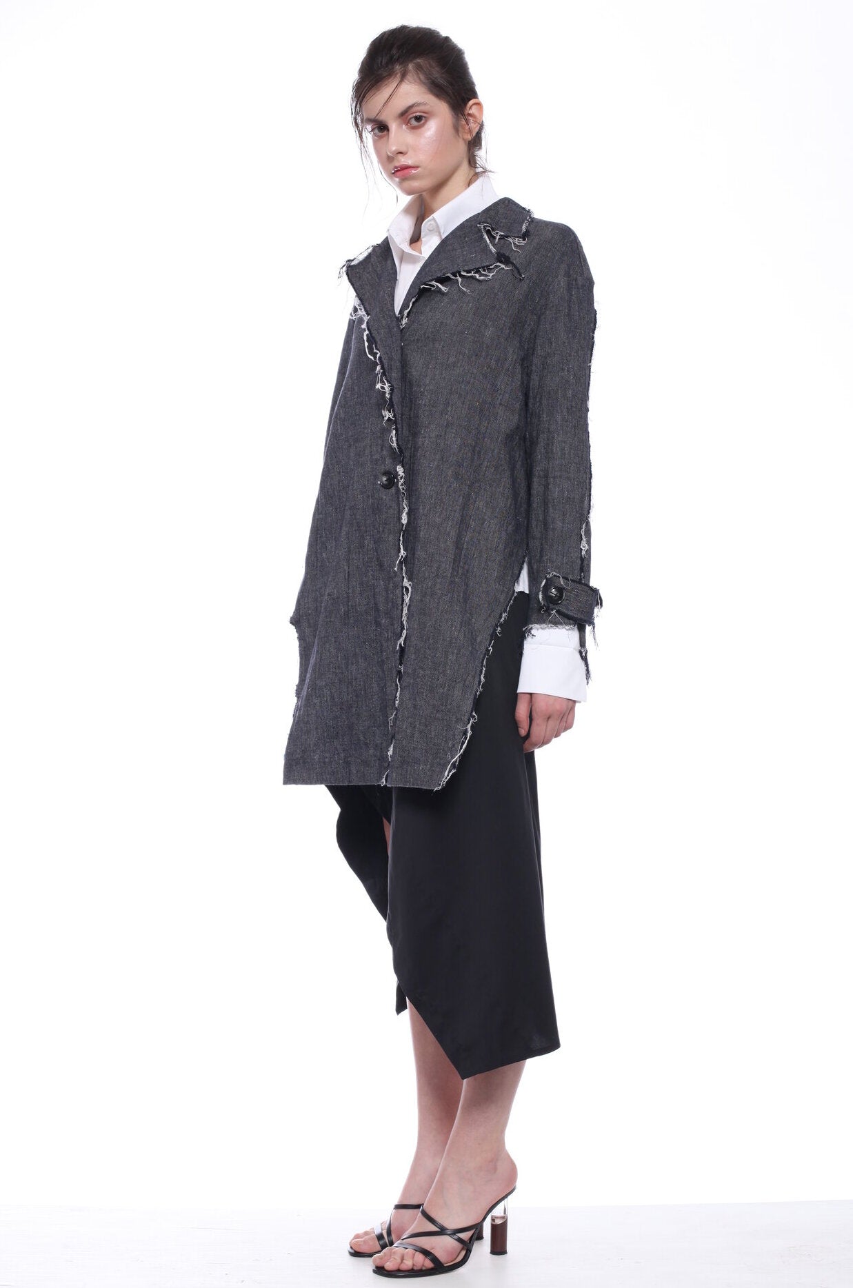ASYMMETRIC DECONSTRUCTED JACKET MADE IN LIGHT STRETCH-LINEN MIXED DENIM FOR EVERYDAY COMFORT. RAW CUT EDGES.