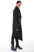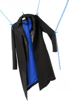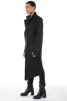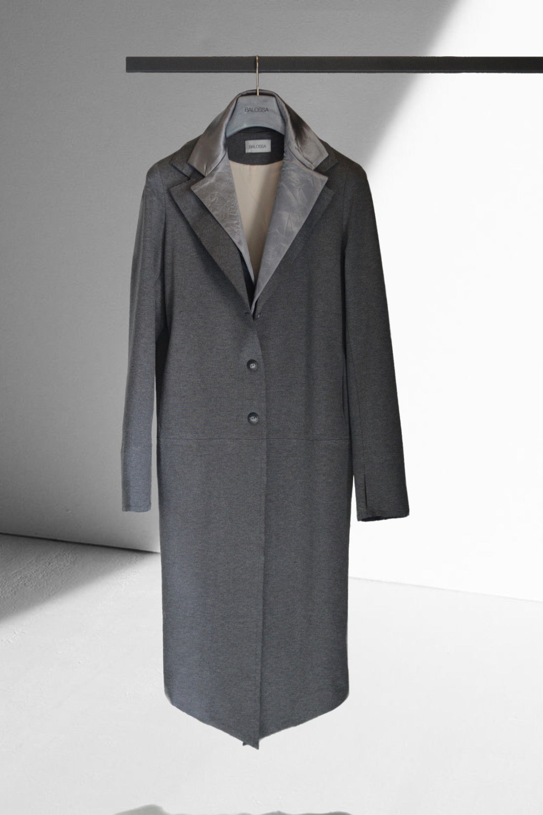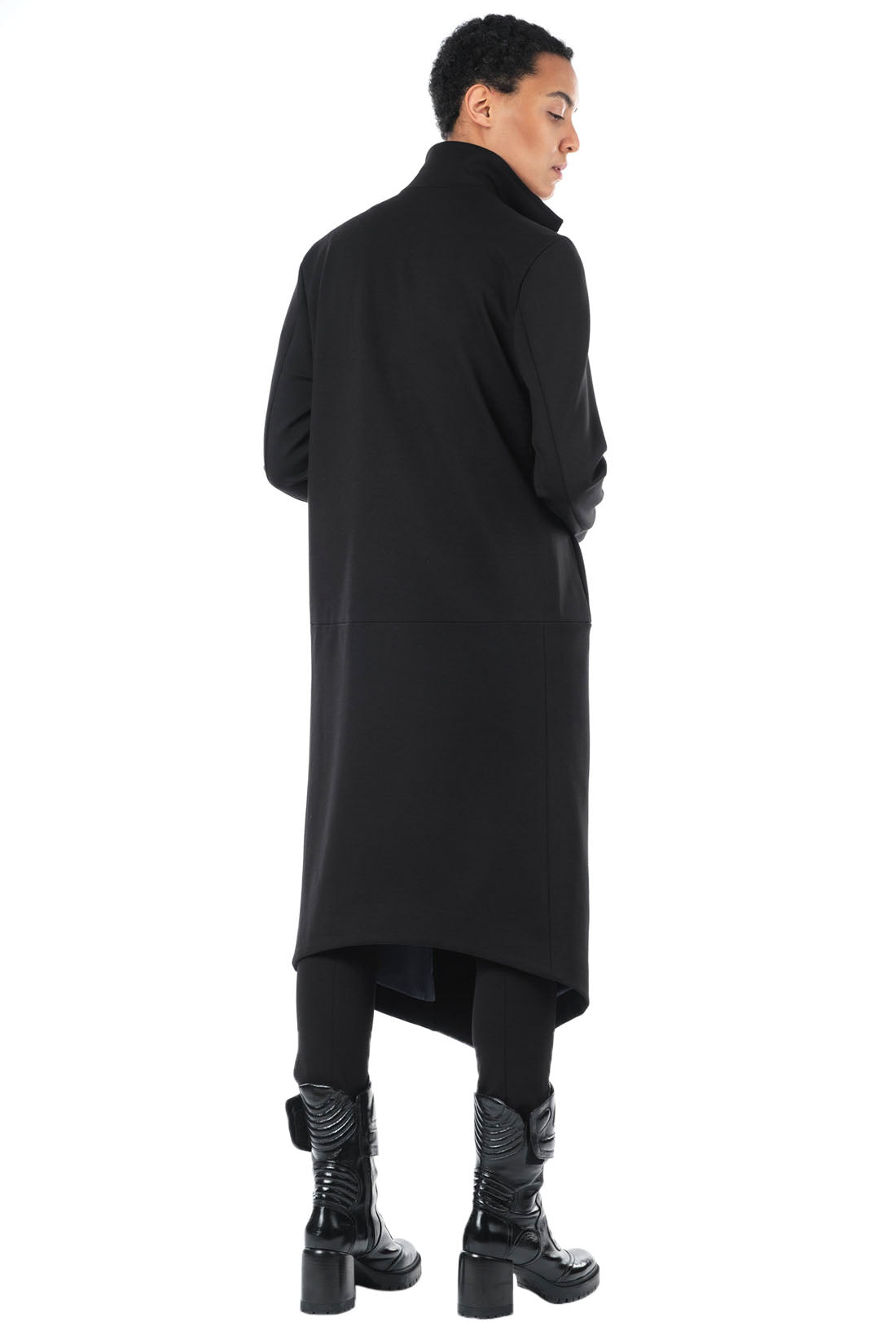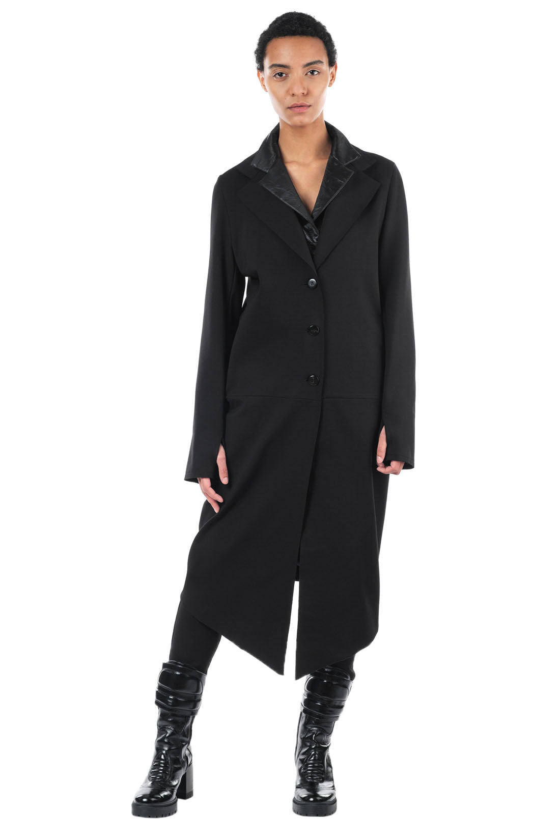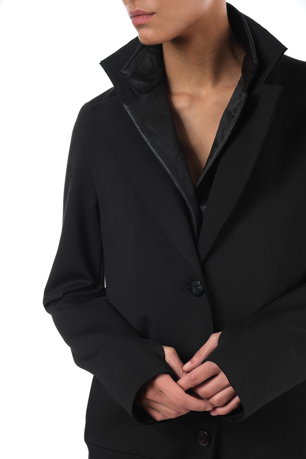 BELOW-THE-KNEE JACKET IN STRETCH COMFORT FABRIC WITH CONTRASTING LINING, ELONGATED SLEEVES WITH THUMB HOLE, CENTRAL BUTTONING, STANDING COLLAR AND DECORATIVE SECOND LAPEL IN WRINKLED-EFFECT TECHNICAL FABRIC.