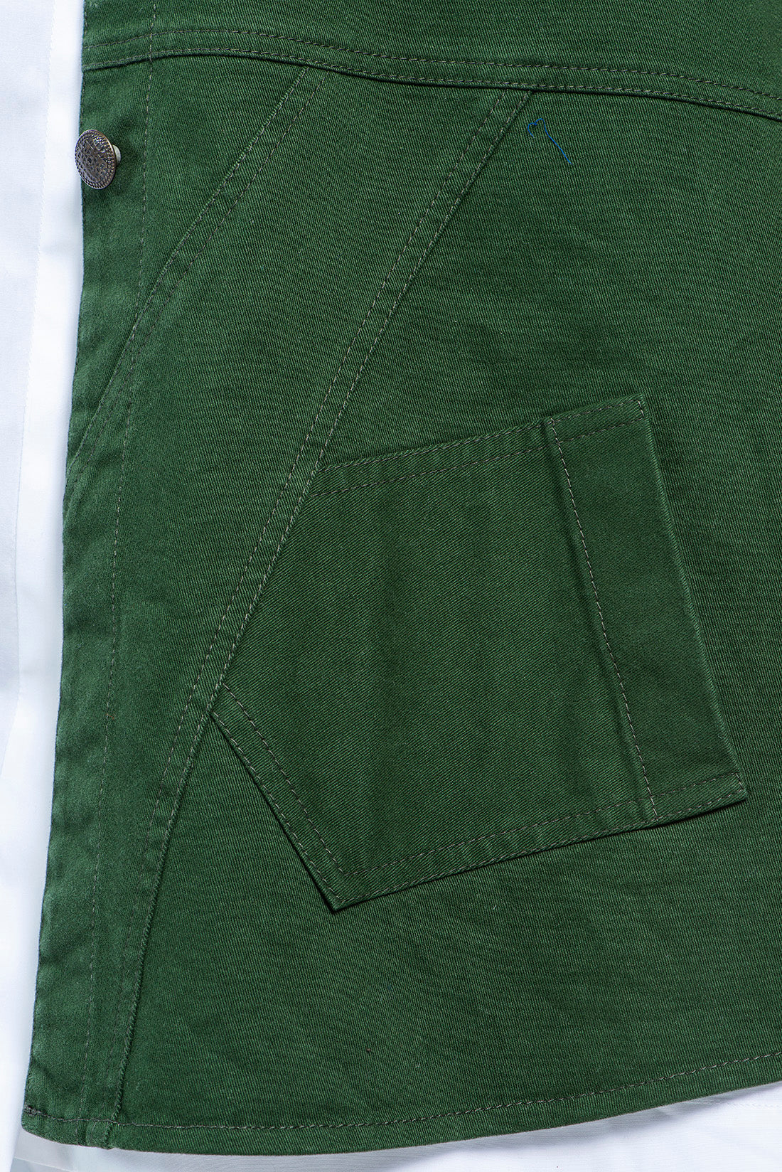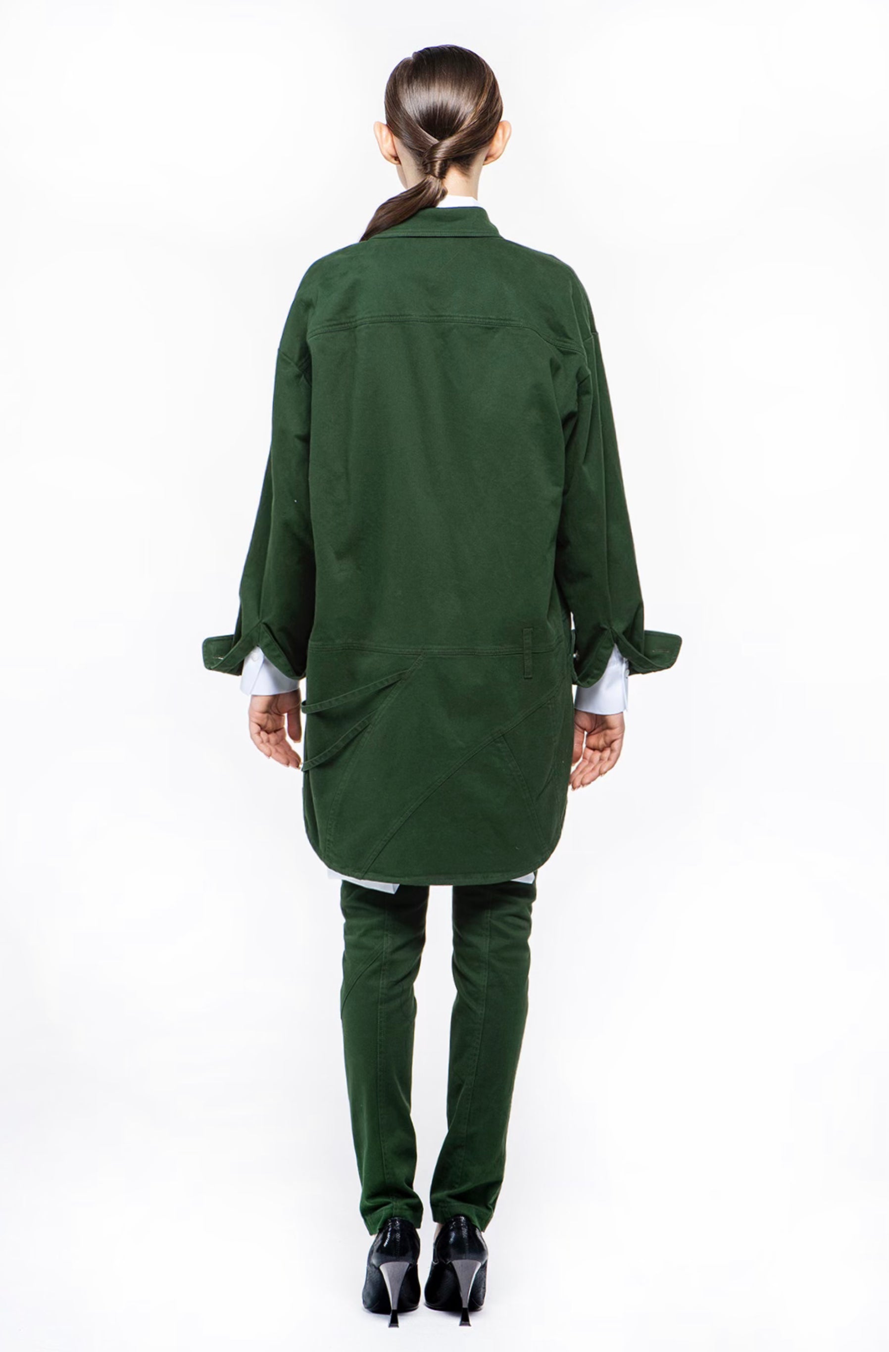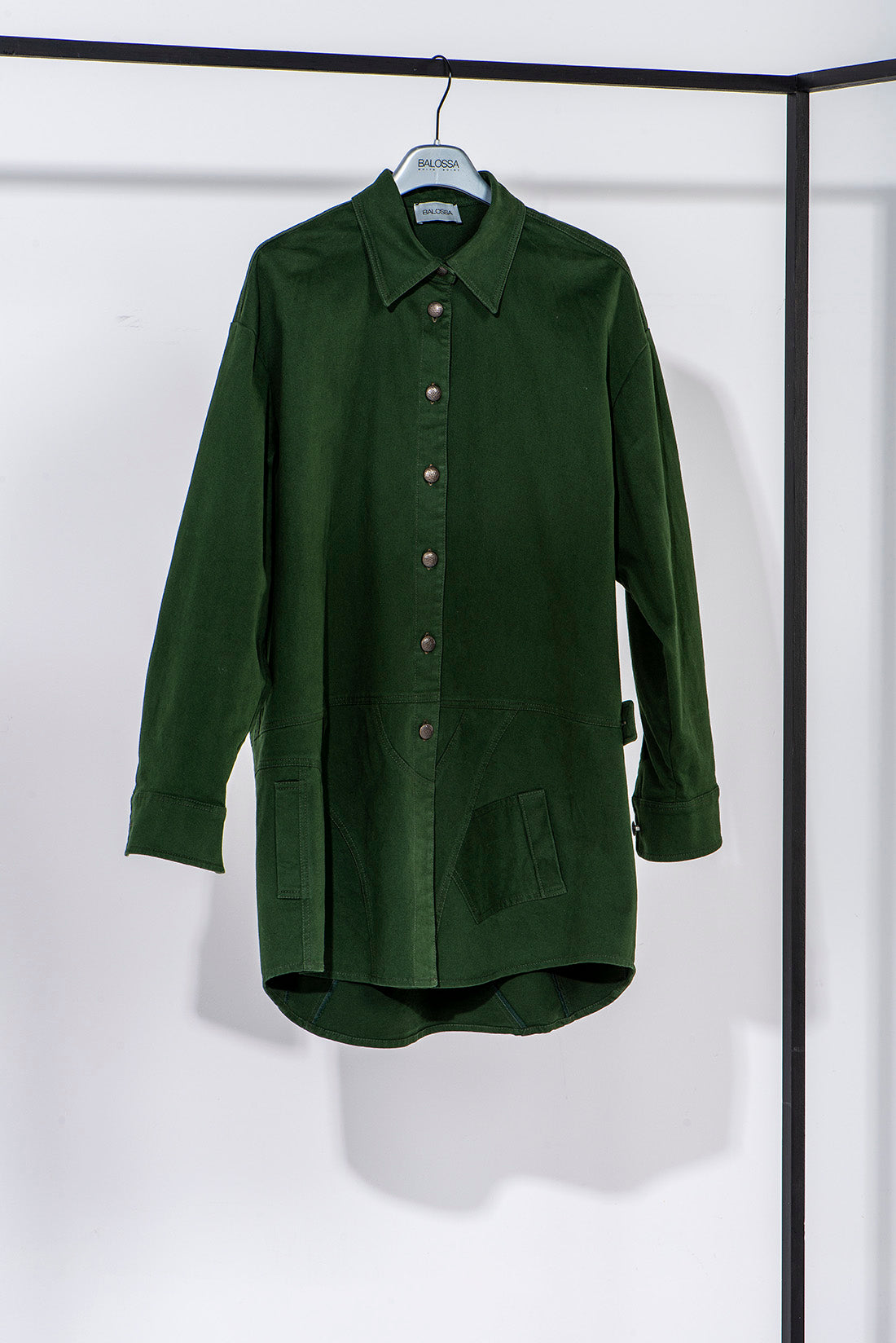 Relaxed-fit jacket-shirt in soft denim with metal buttons. Lower part has been embellished with the stitches, loops and strips, a decorative pocket on the frontal left side.