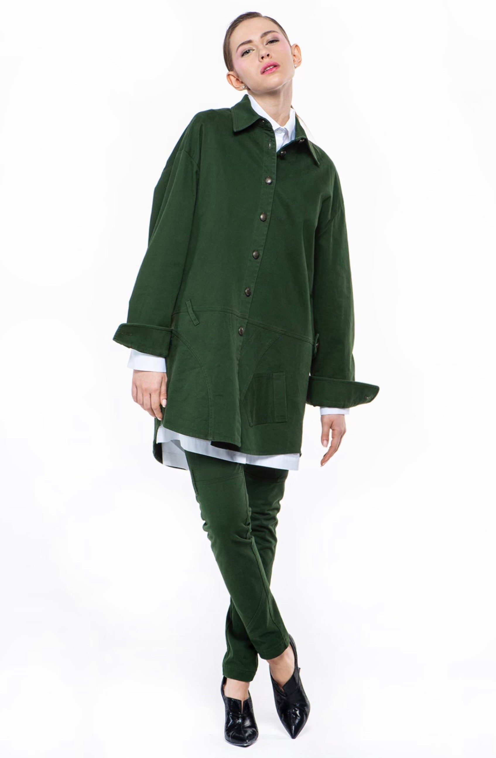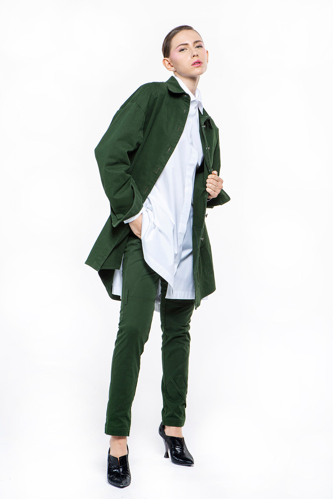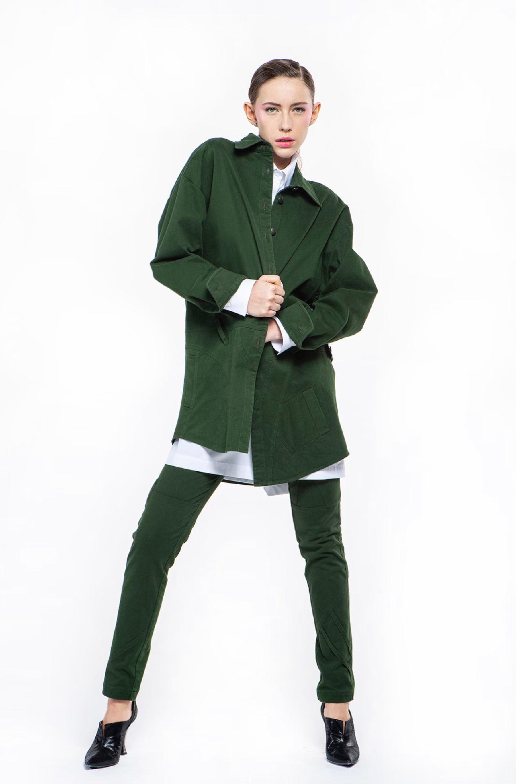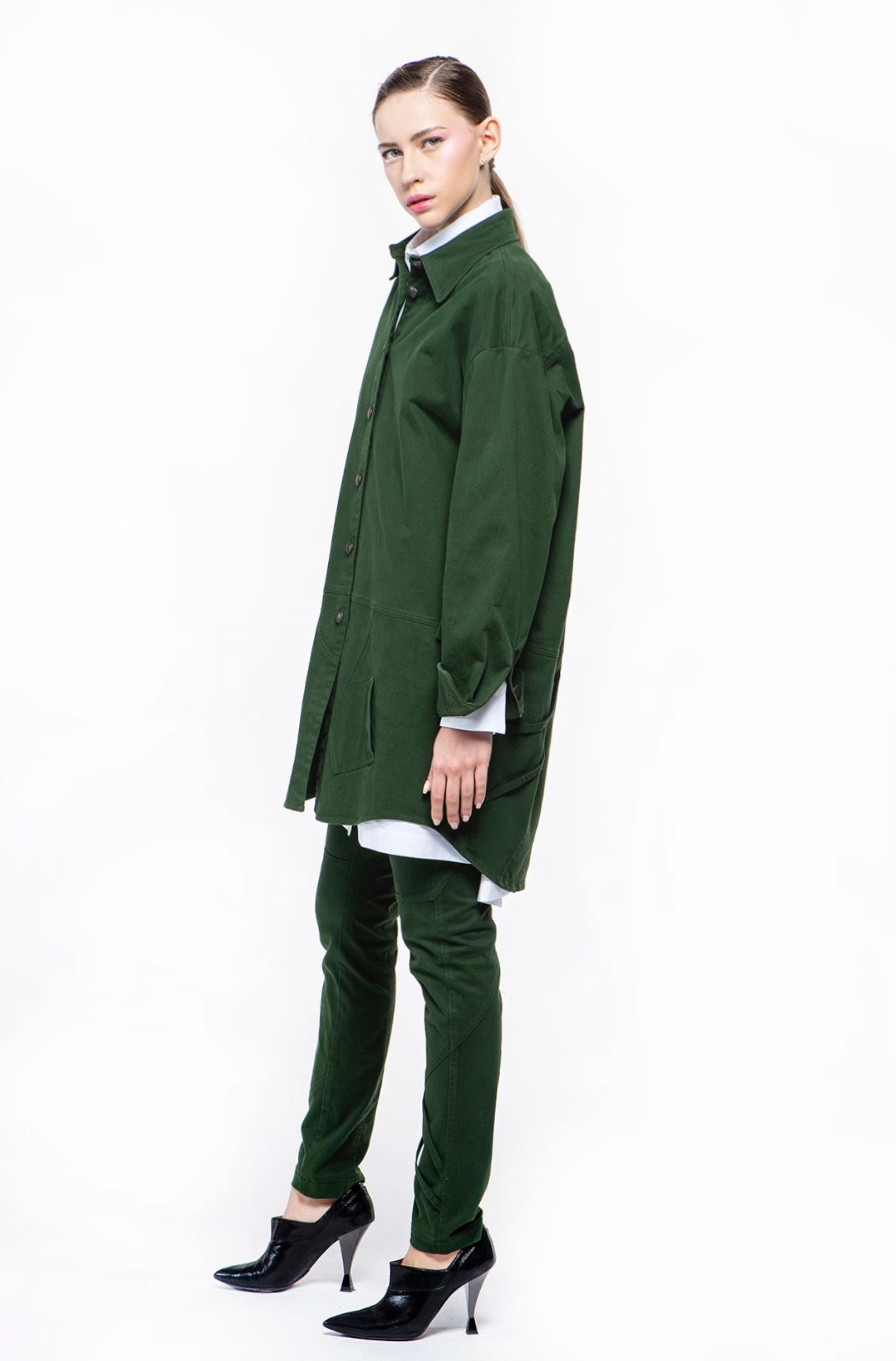 Relaxed-fit jacket-shirt in soft denim with metal buttons. Lower part has been embellished with the stitches, loops and strips, a decorative pocket on the frontal left side.